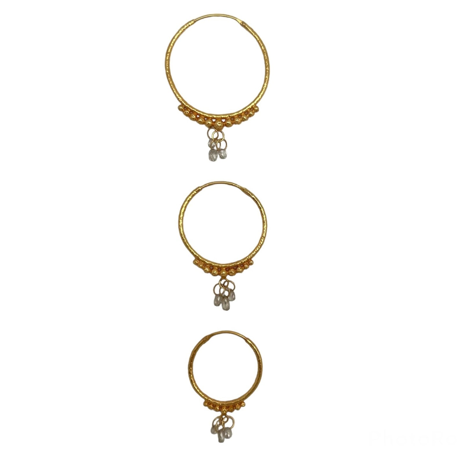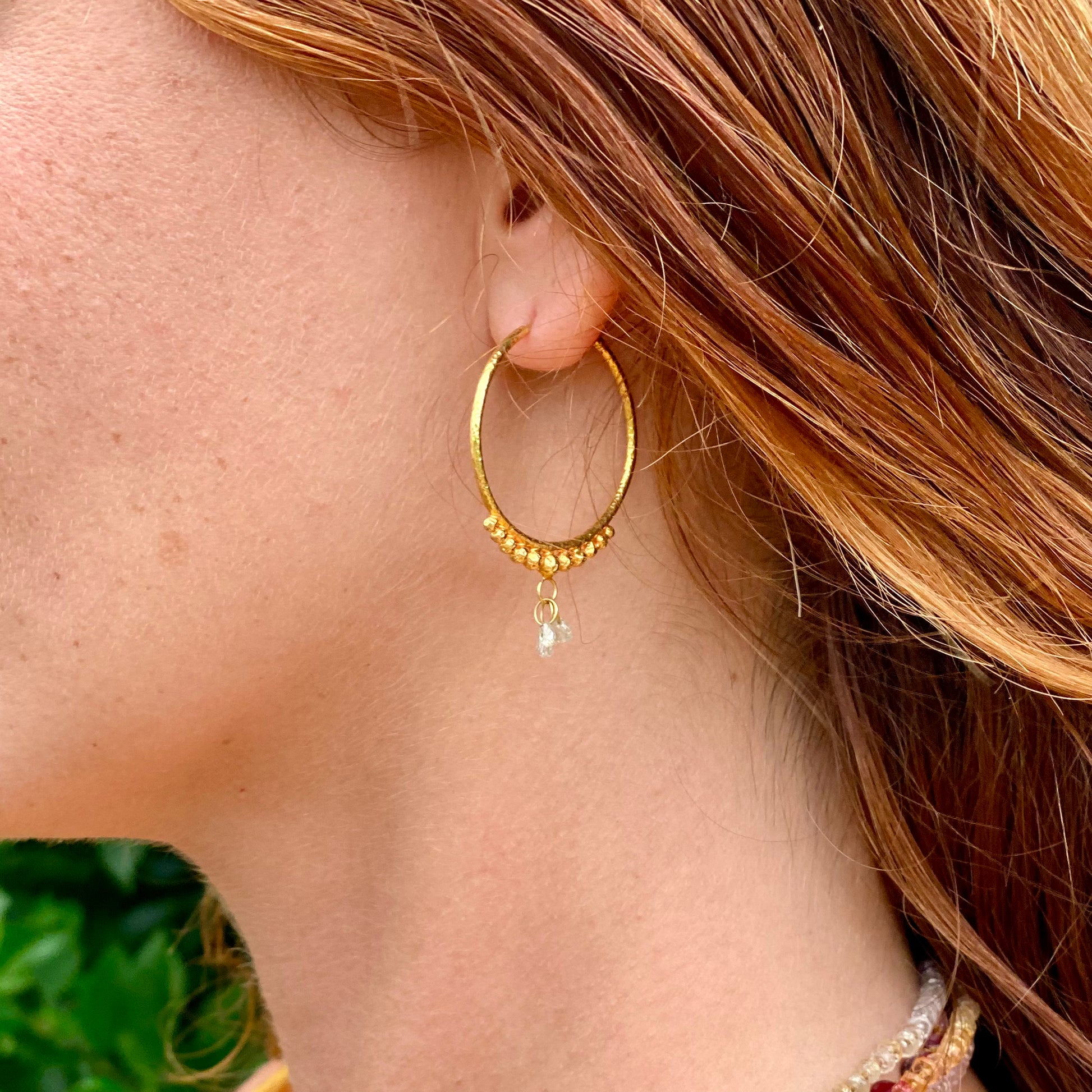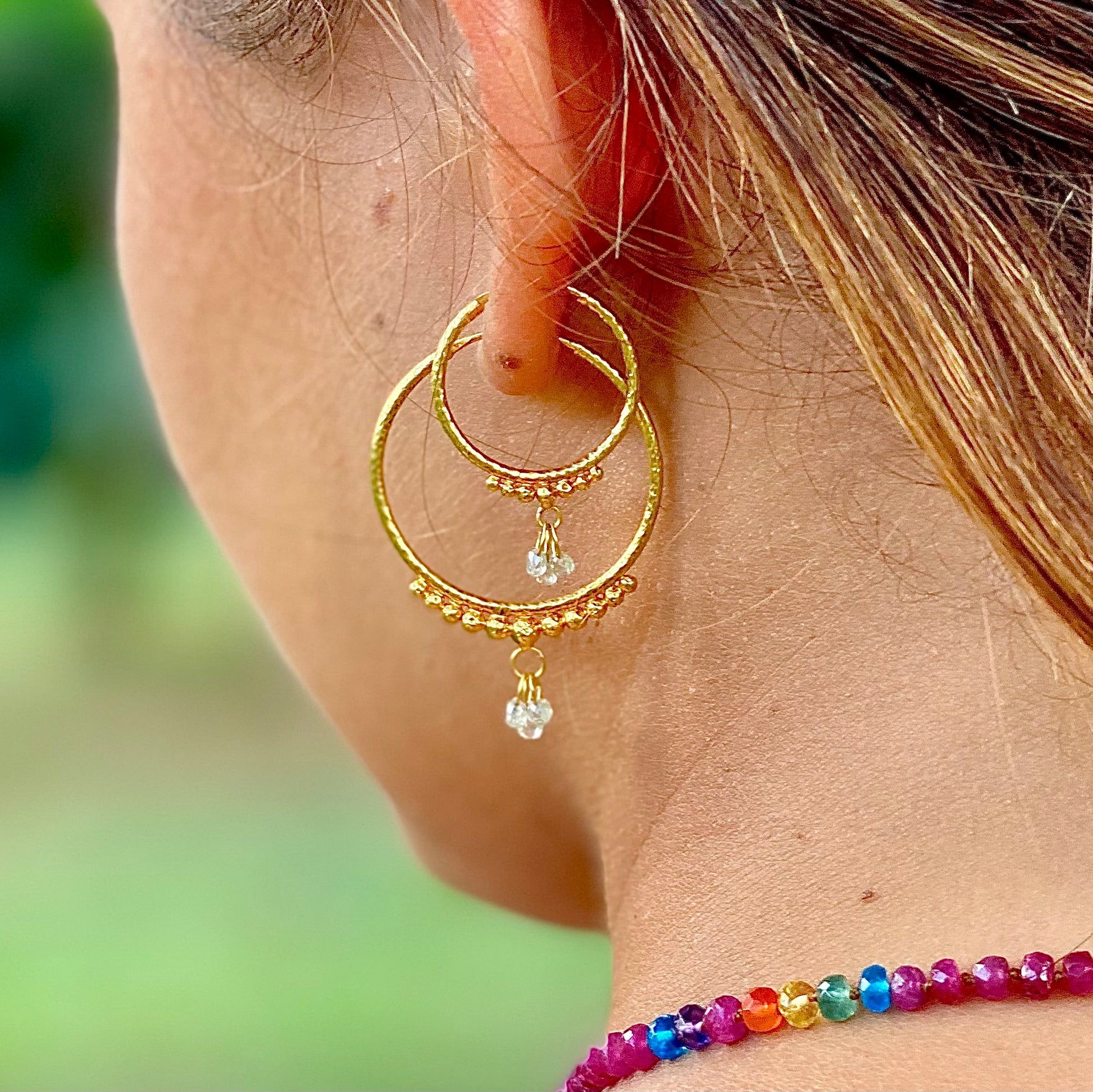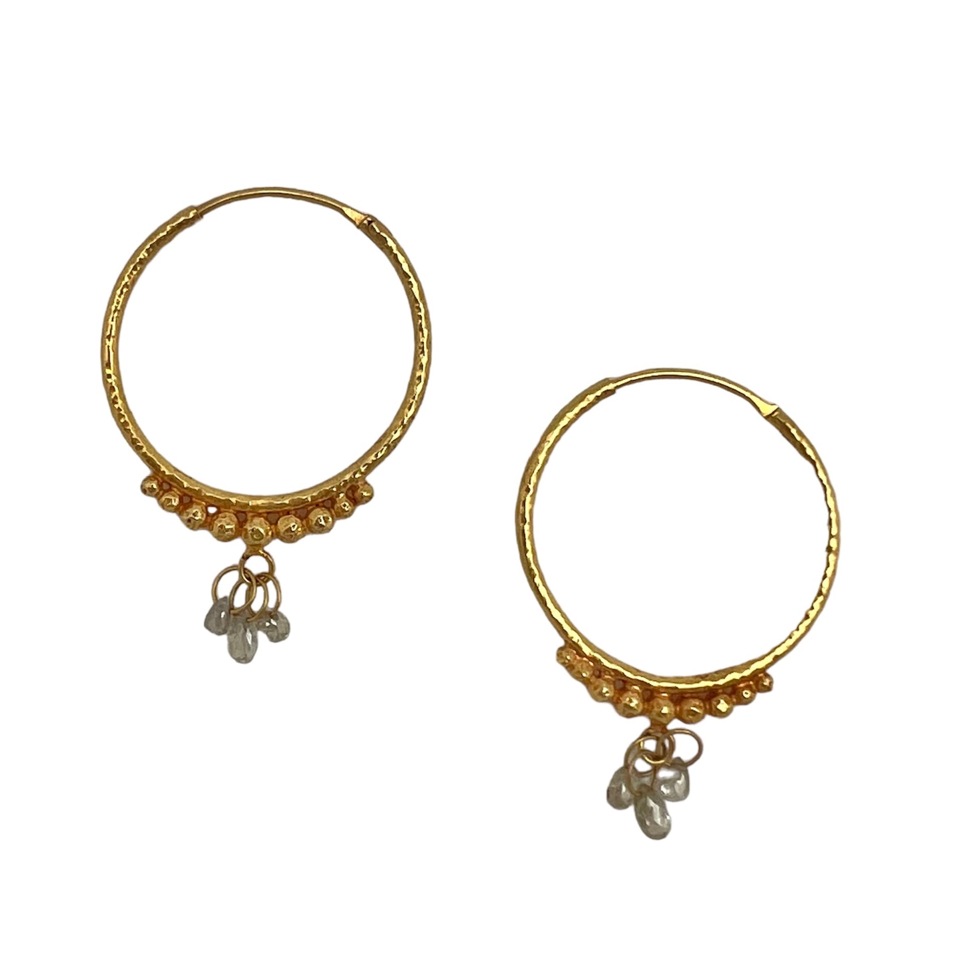 Hand-Hammered Golden Droplet Hoops with Light Diamonds