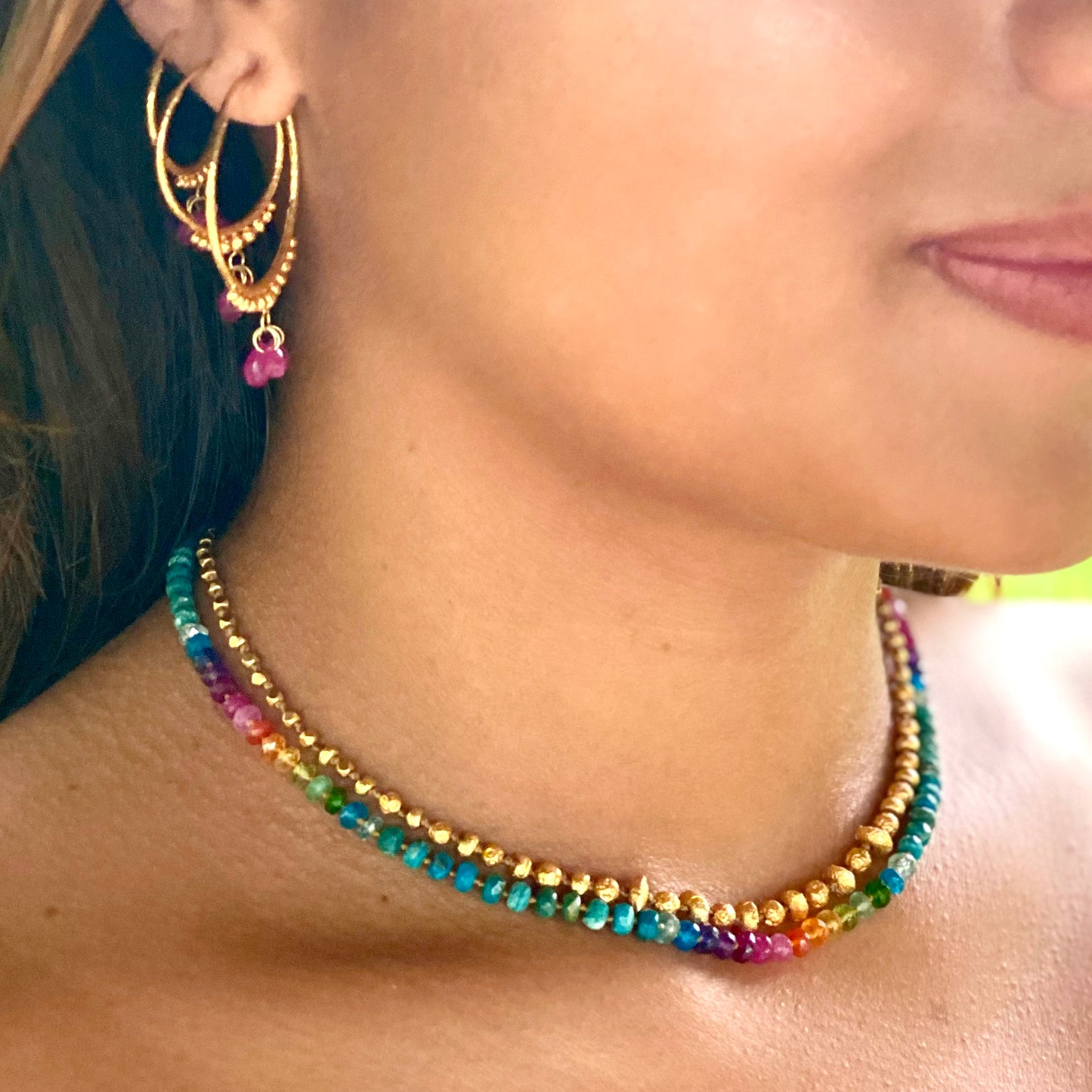 Designed and crafted in alliance with a 9th generation gold smithing family from India, these handmade earrings are as authentic as they are delightful. The precious metal gold is considered a master healer with rays in spiritual development, purification, and rejuvenation and these earrings carry the vibration rightly. Inspired by traditional Indian design with Amalia’s flair for detail their style is enhanced with solid 18 karat gold, precious gemstones, and hand formed beads. Together they spark a quiet revival of play, artistry, and finely honed craft, honoring the maker and the adorned.