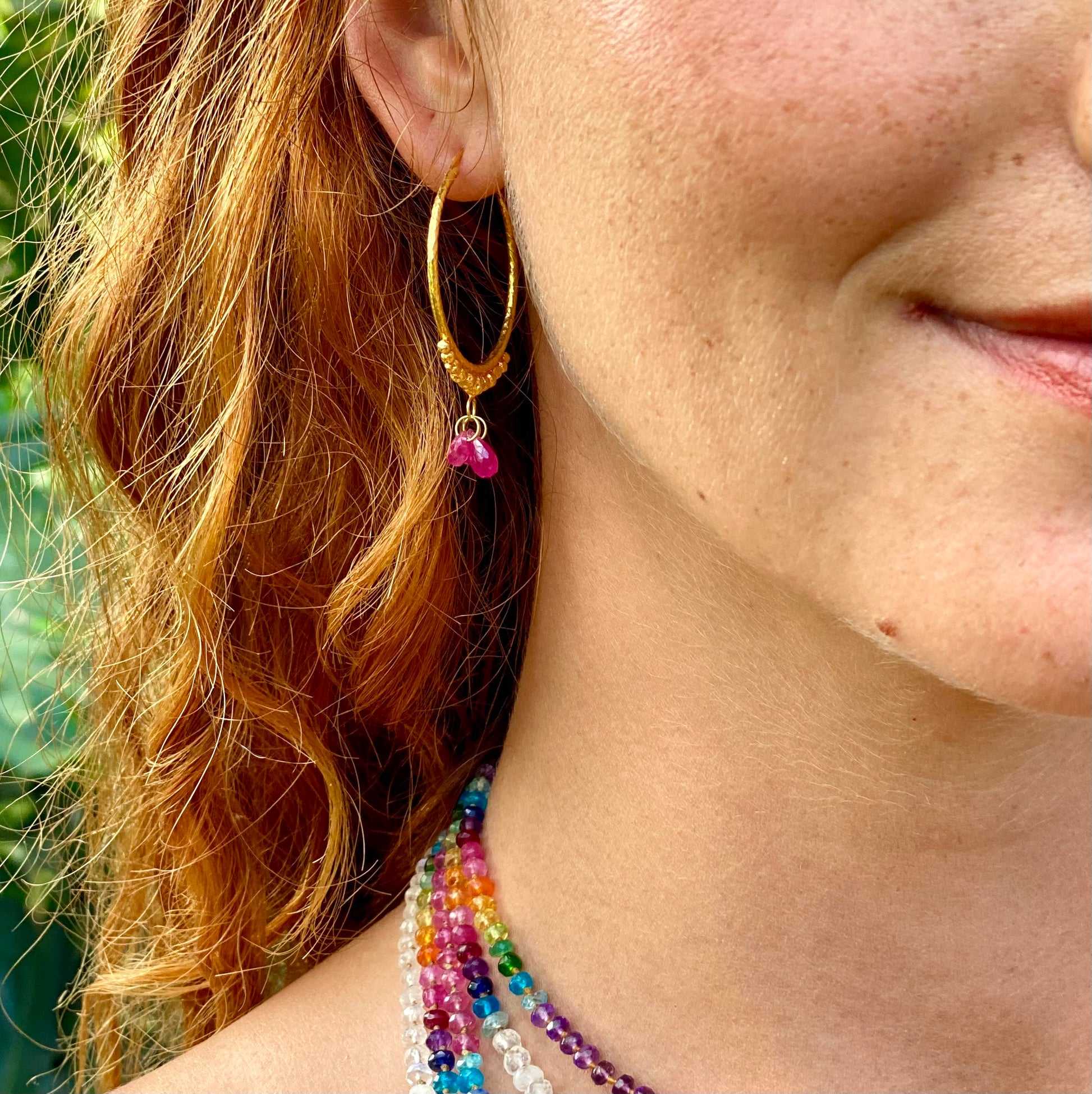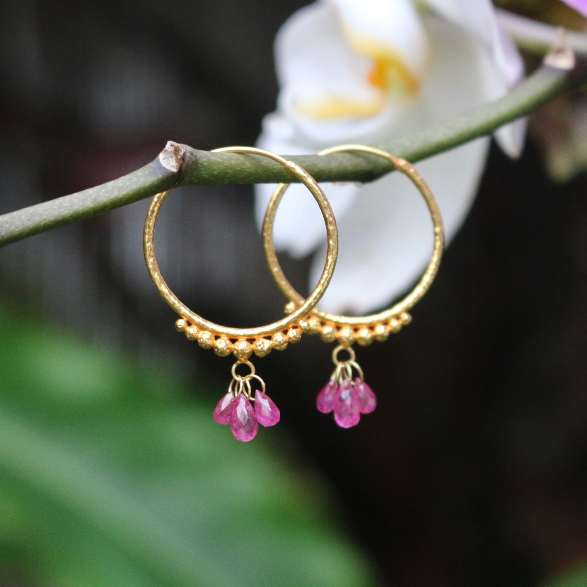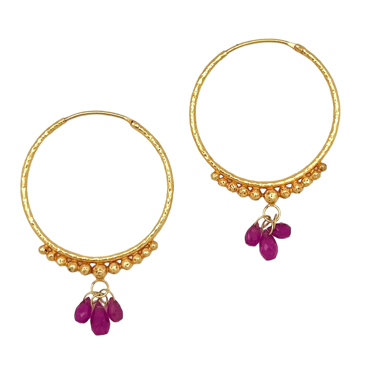Hand-Hammered Golden Droplet Hoops with Rubies