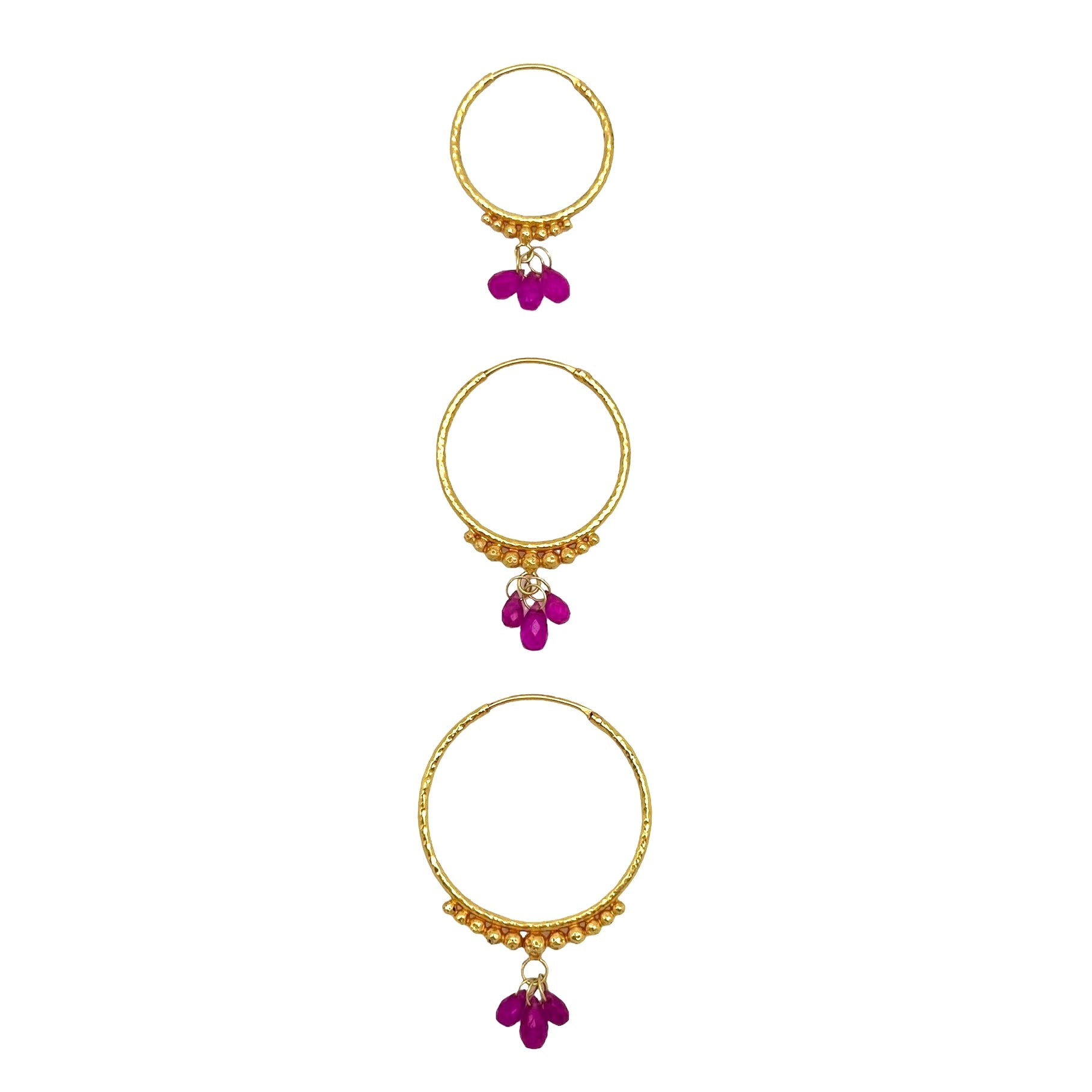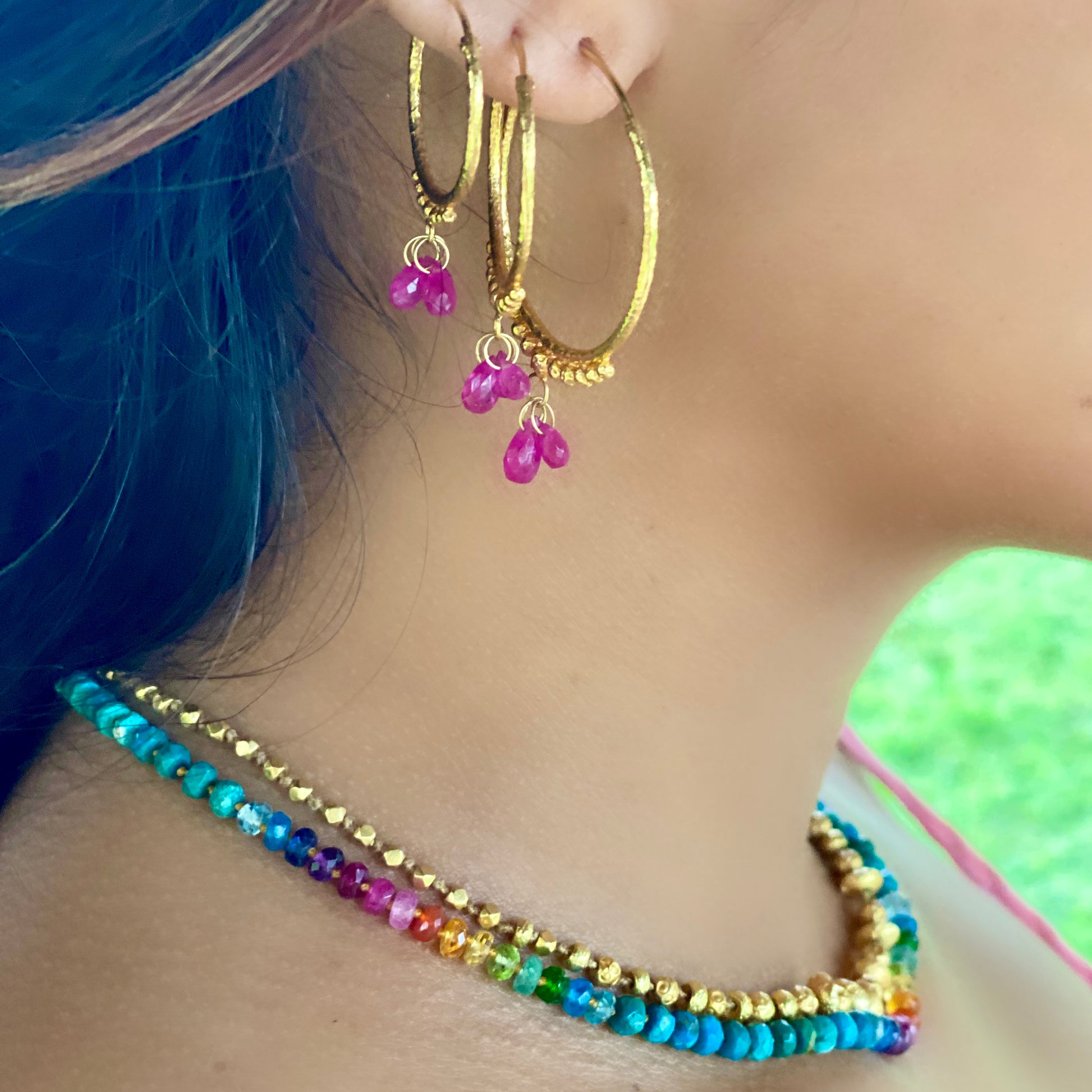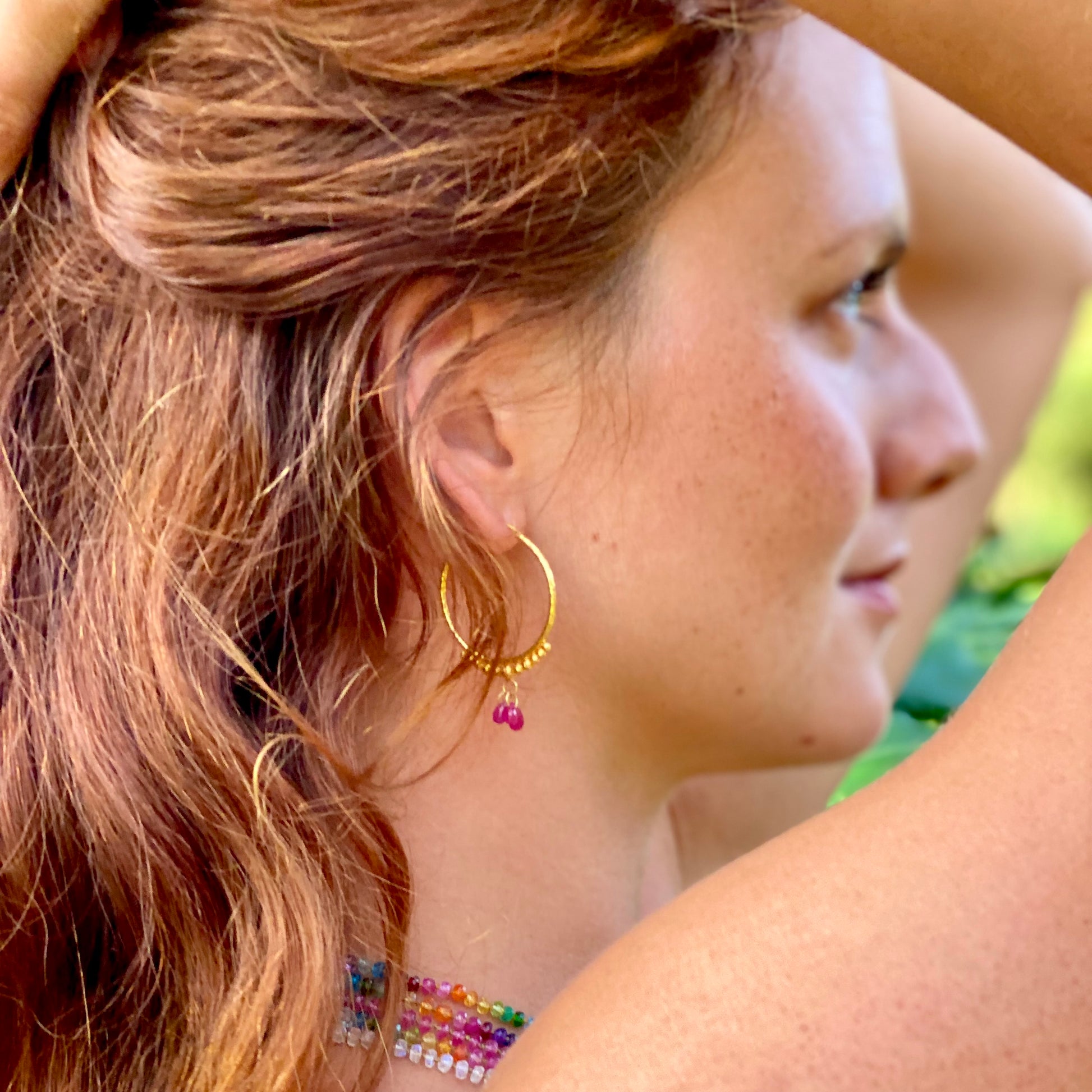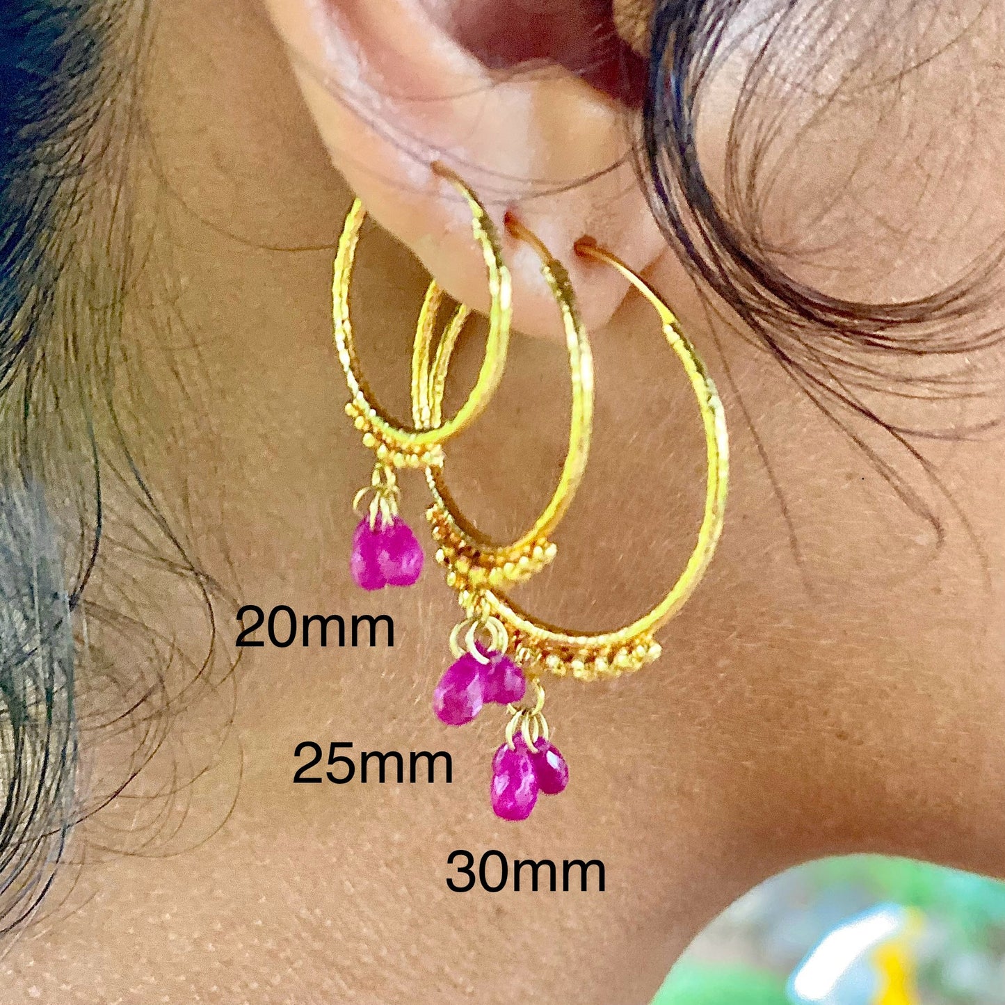 Hand-Hammered Golden Droplet Hoops with Rubies