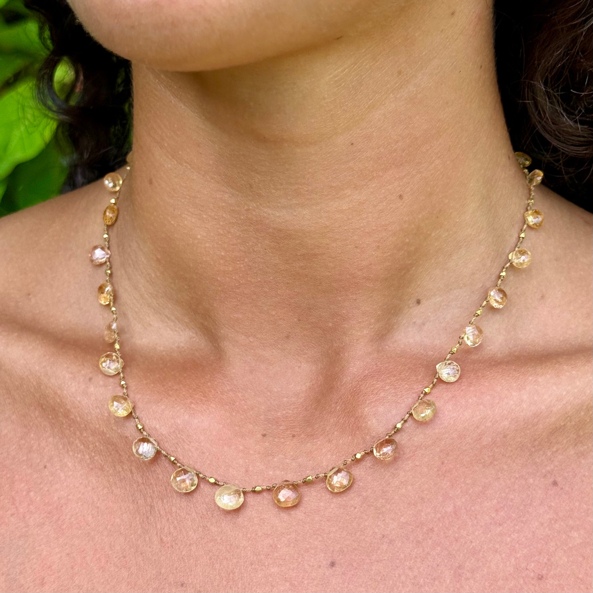 Glistening golden-peach Imperial Topaz drops delicately spaced with handmade solid 18k gold beads. Radiating a gentle fire, Imperial Topaz balances warmth and brilliance in perfect harmony.