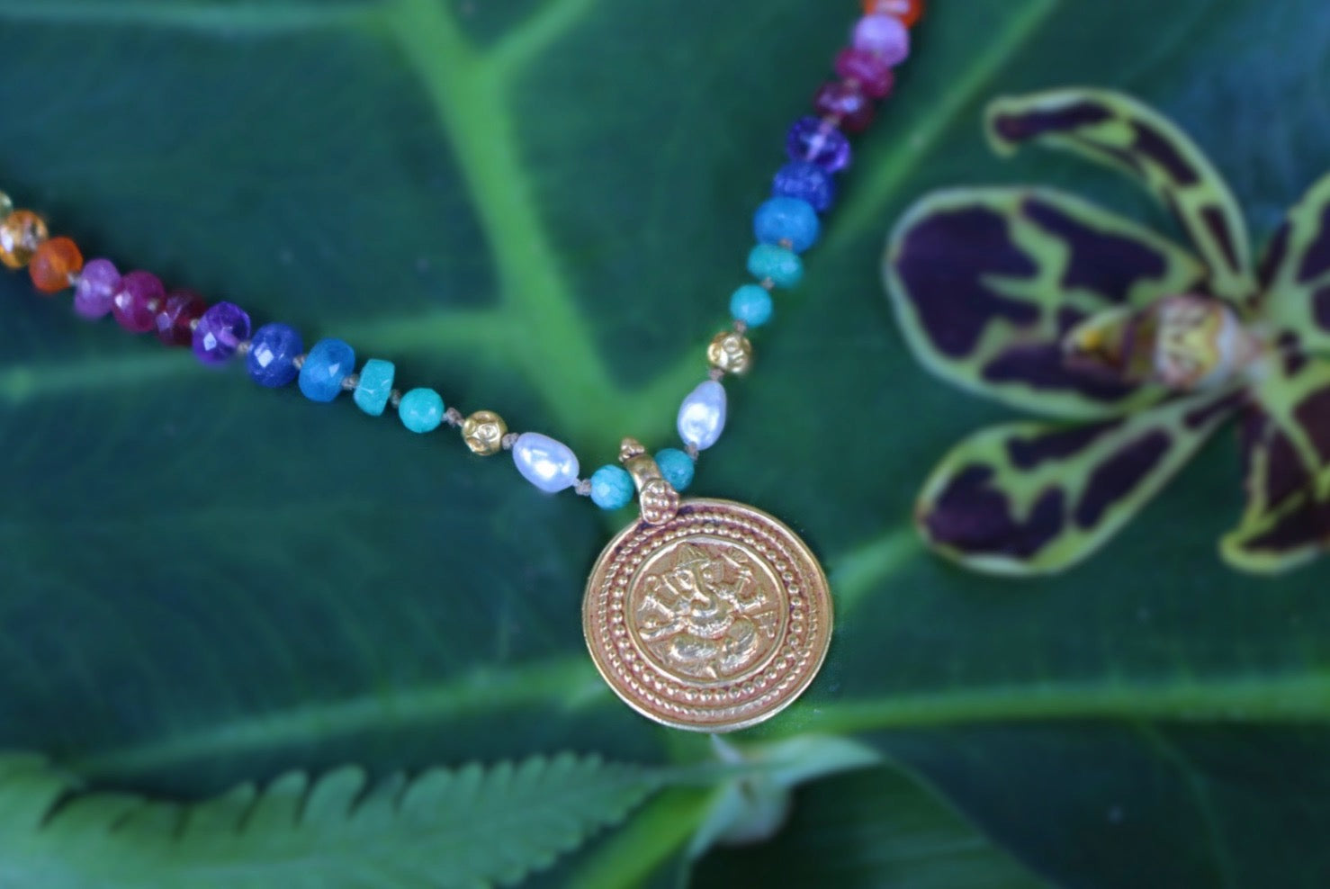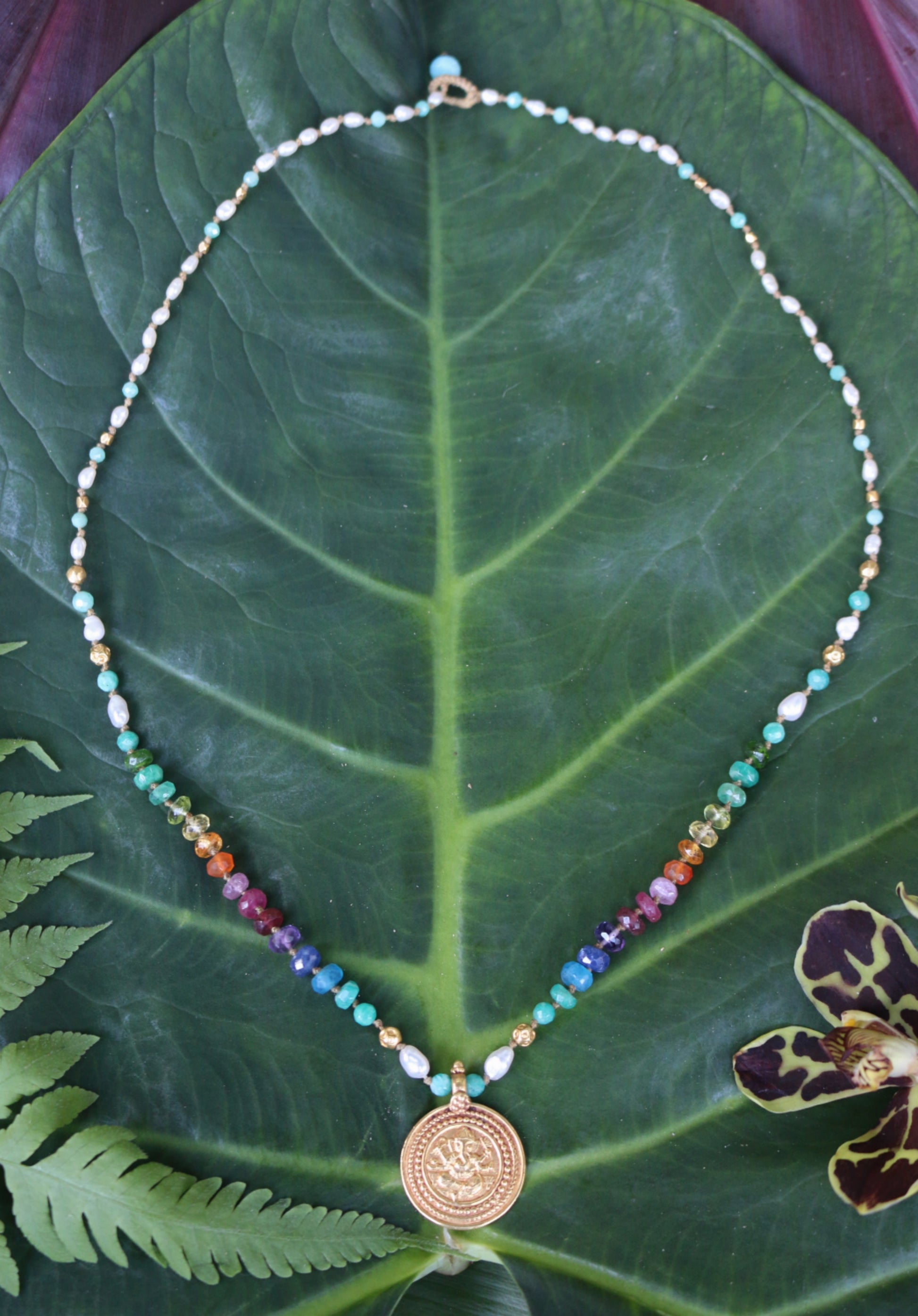 Keshi Pearl with Gold Ganesha & Amazonite Rainbow Mana