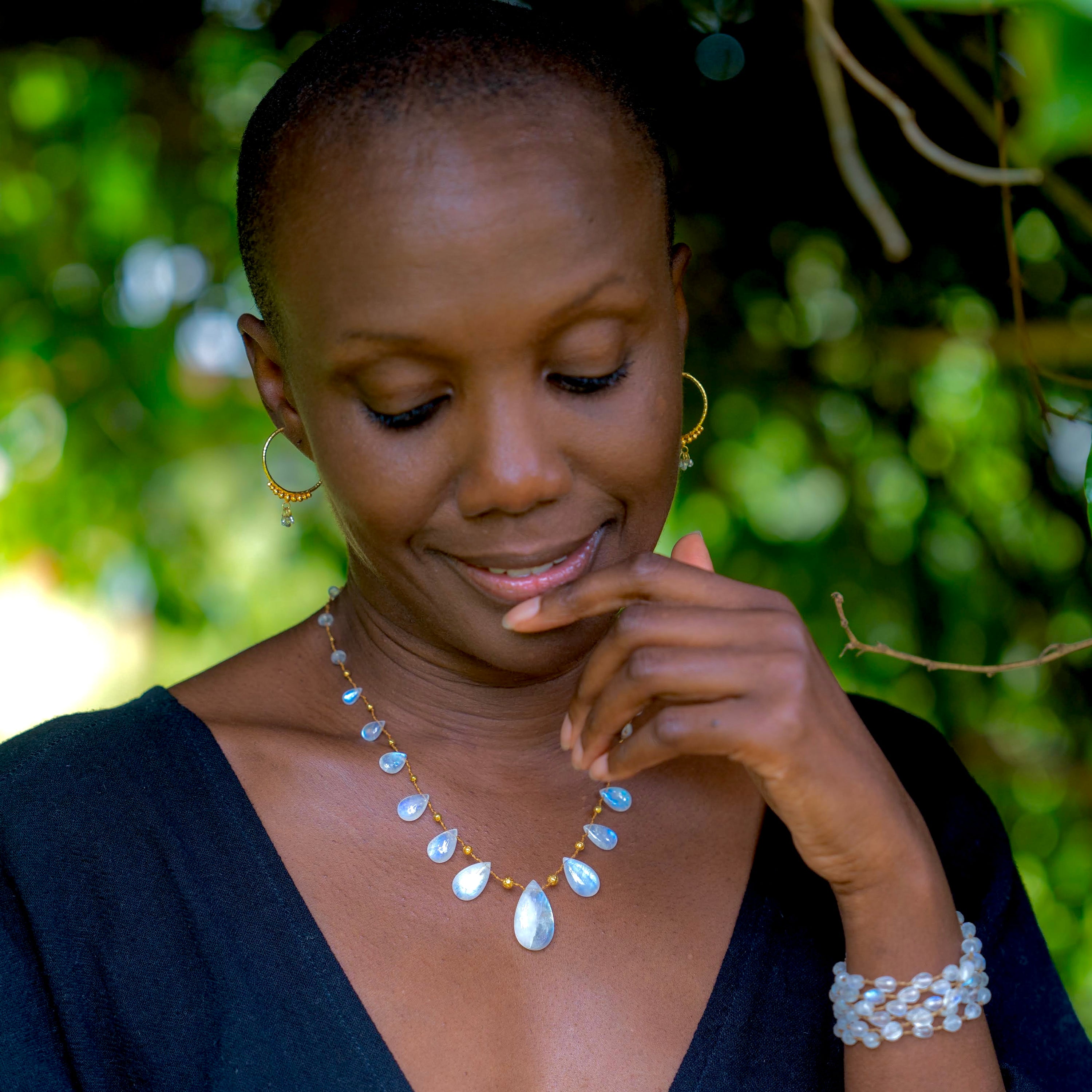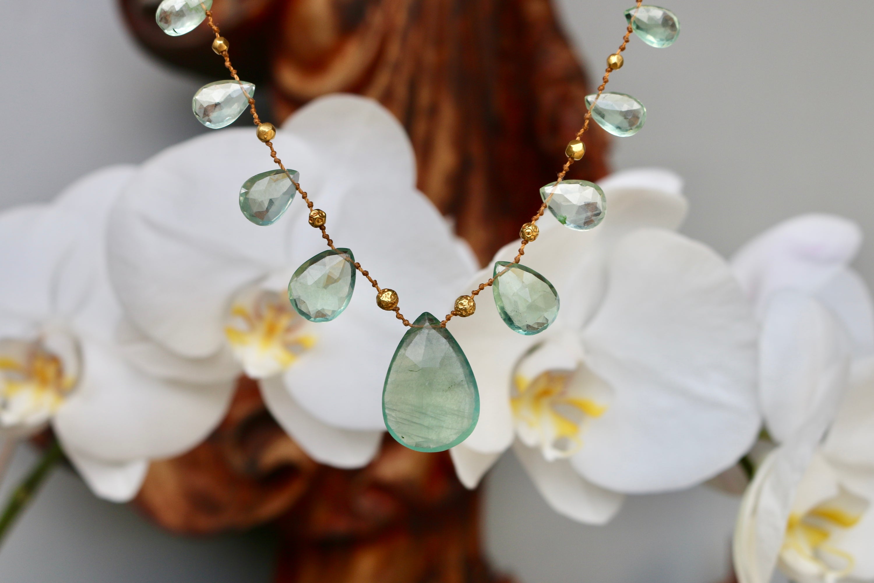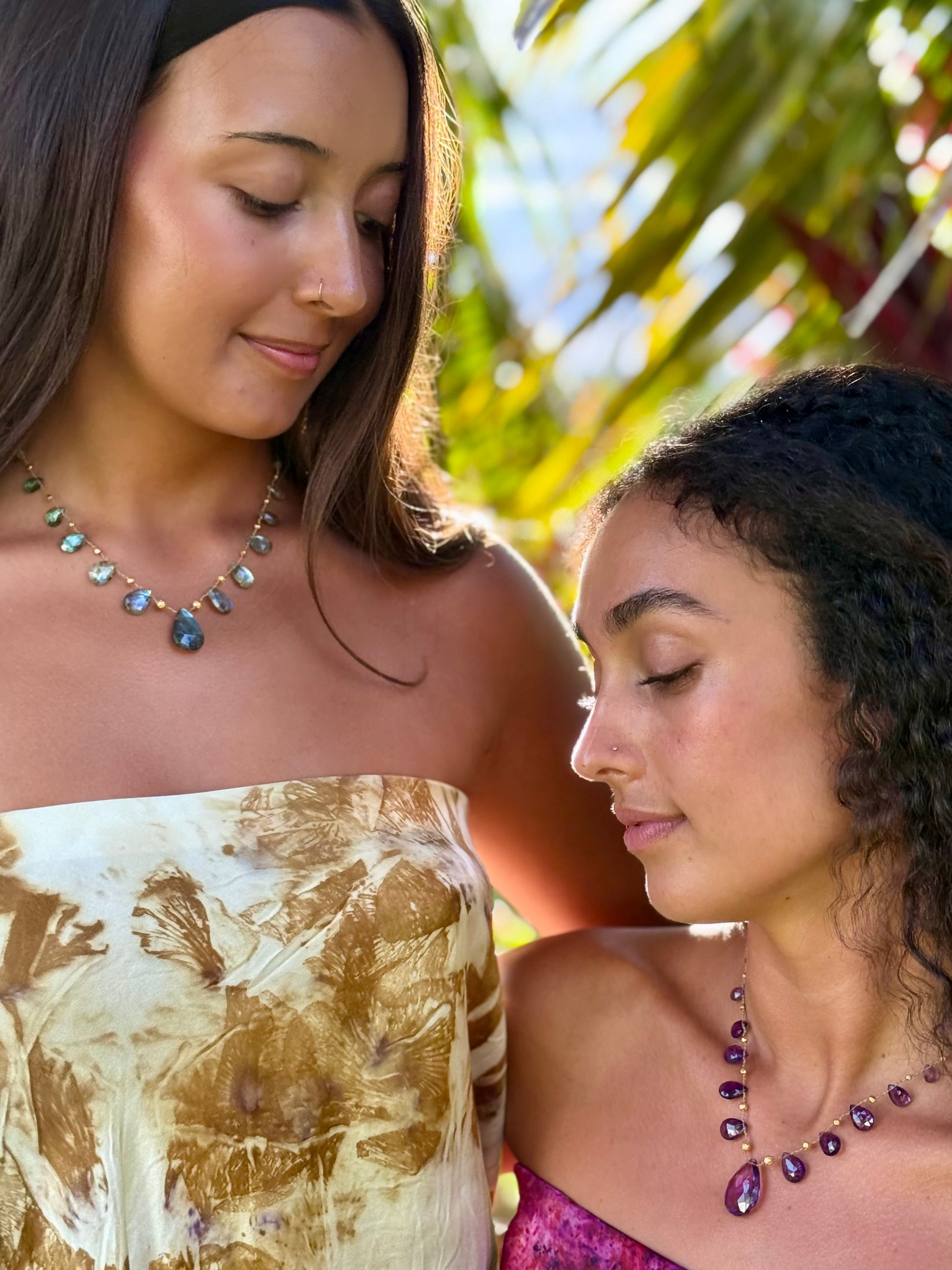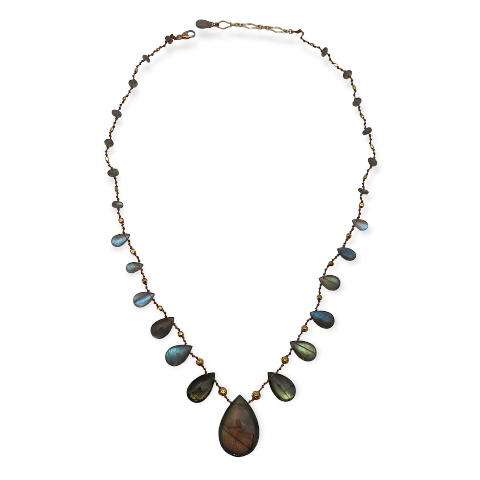 Ephemeral Labradorite drops instantly ground us in the intersection of unseen worlds and present potentials. Their prismatic shifting colors act as a reminder of transformation and positive change. Often used to enhance psychic abilities, they also stabilize moods and may act as a protective charm. Graduated gems are set between handmade solid 18k gold beads.