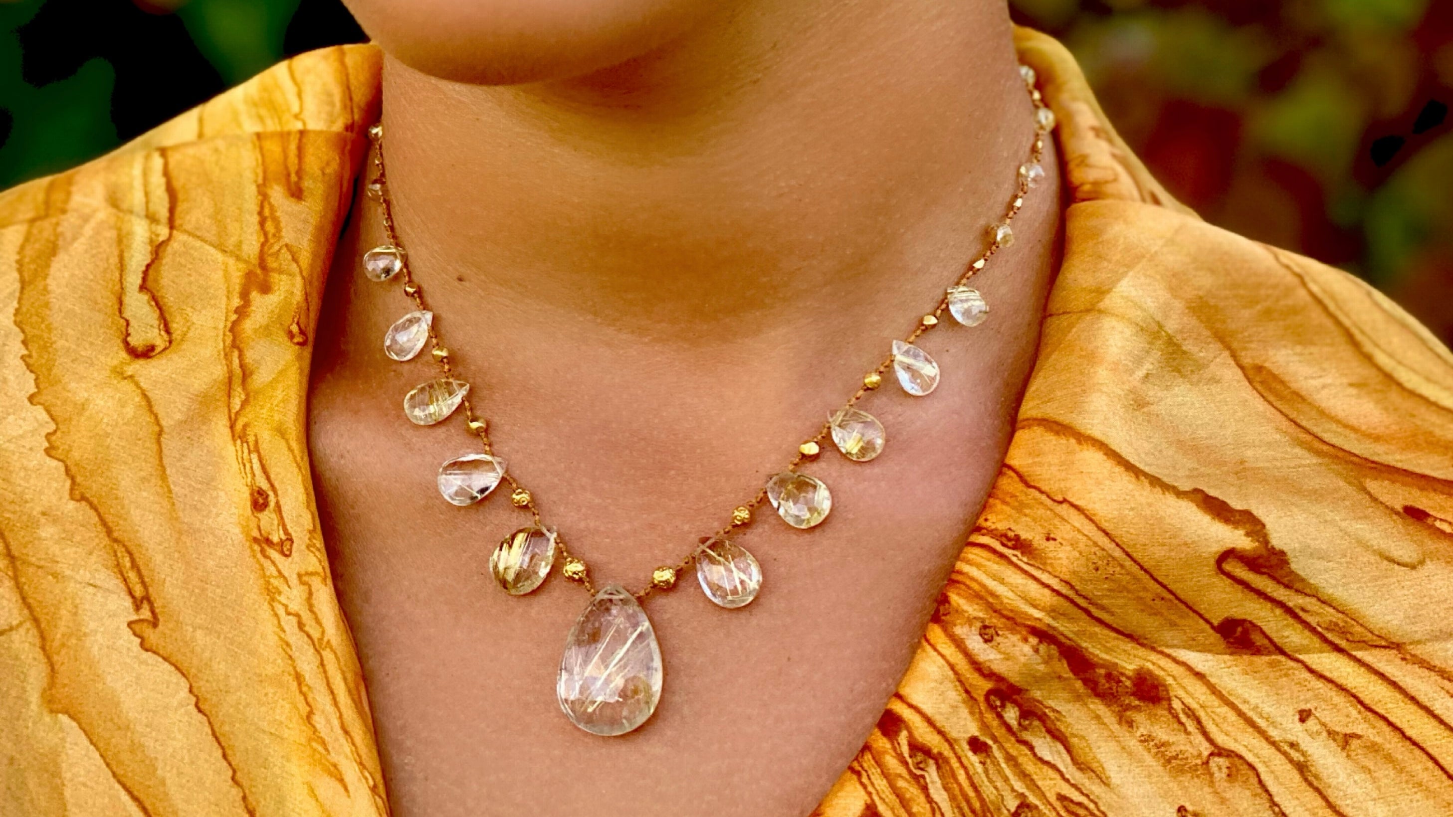 This luminous line provides a substantive dose of crystalline nutrition, pulsing with elevated earth frequencies from the body of nature herself. Designed for the noble-hearted, these regal priestess pieces are comprised of multi-dimensional drop gemstones, highlighted by handmade 18 karat gold beads. This is bling at its most blessed.