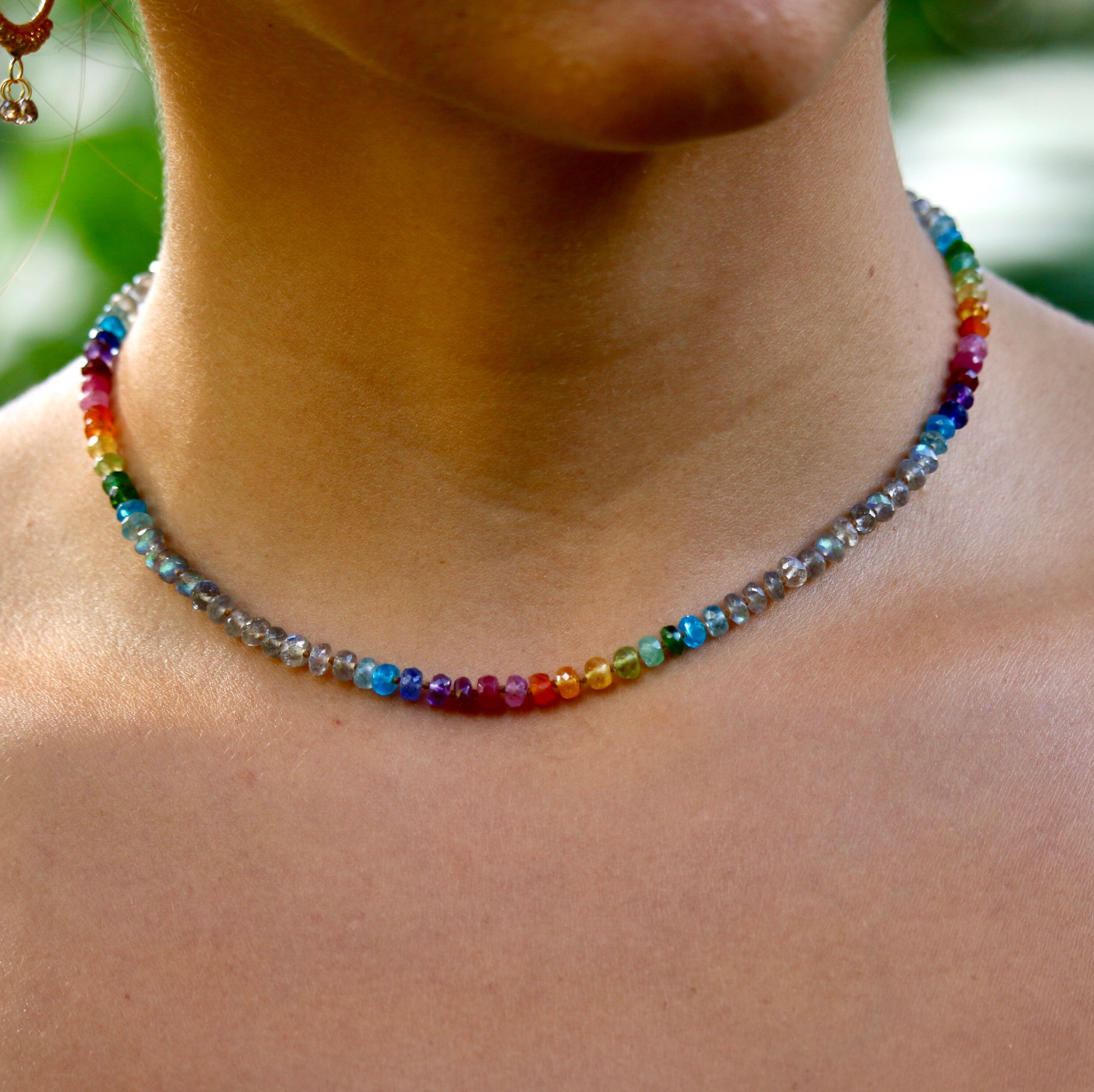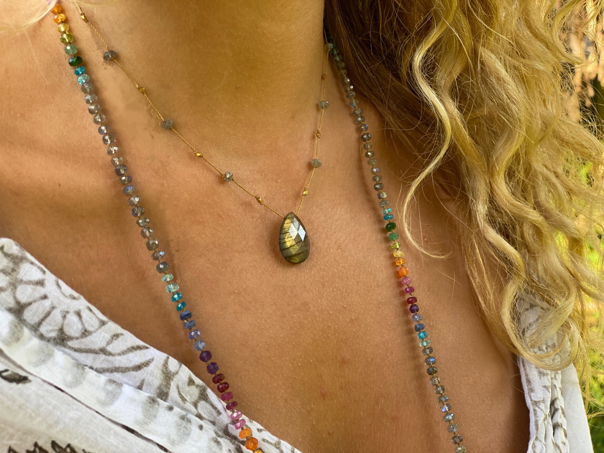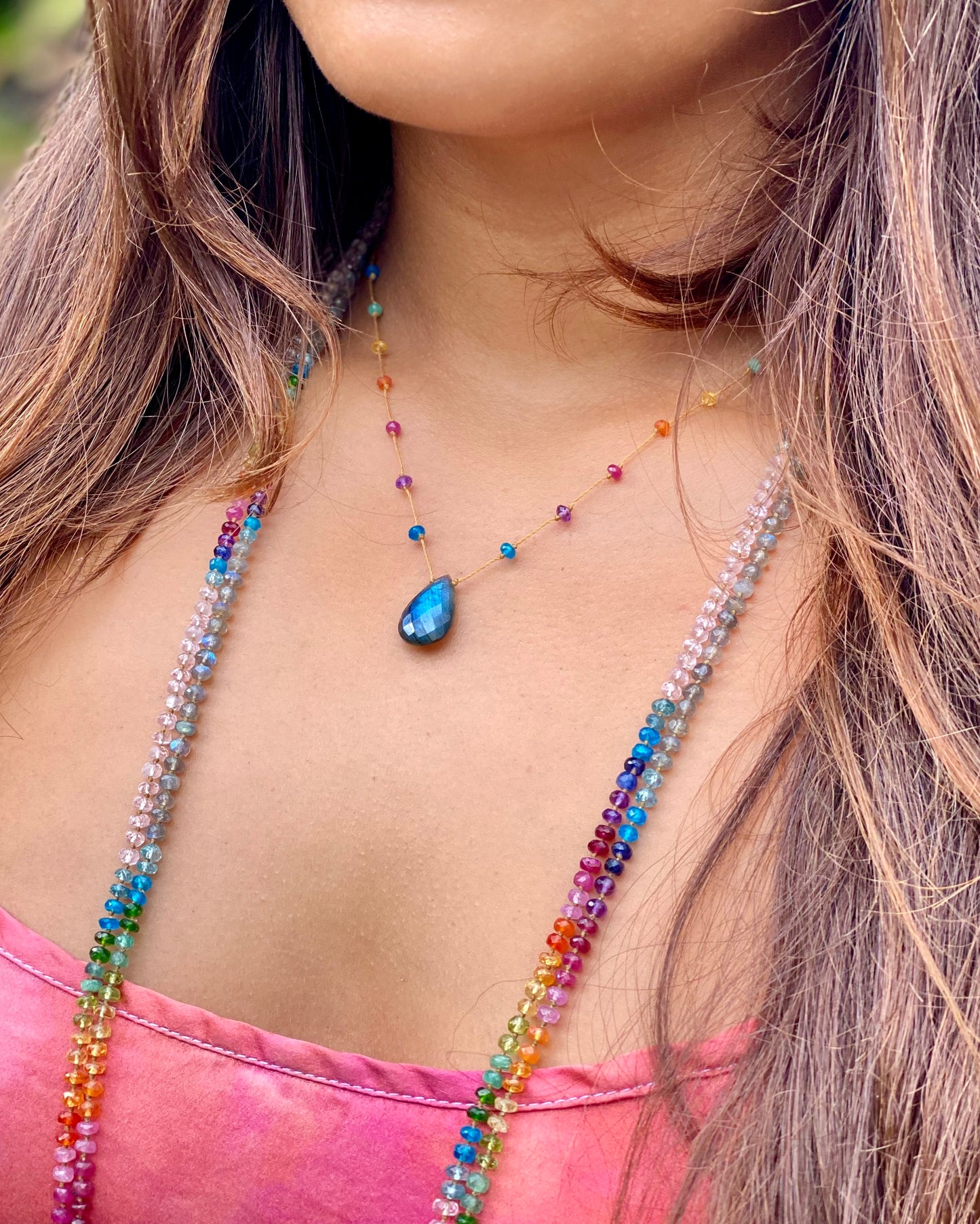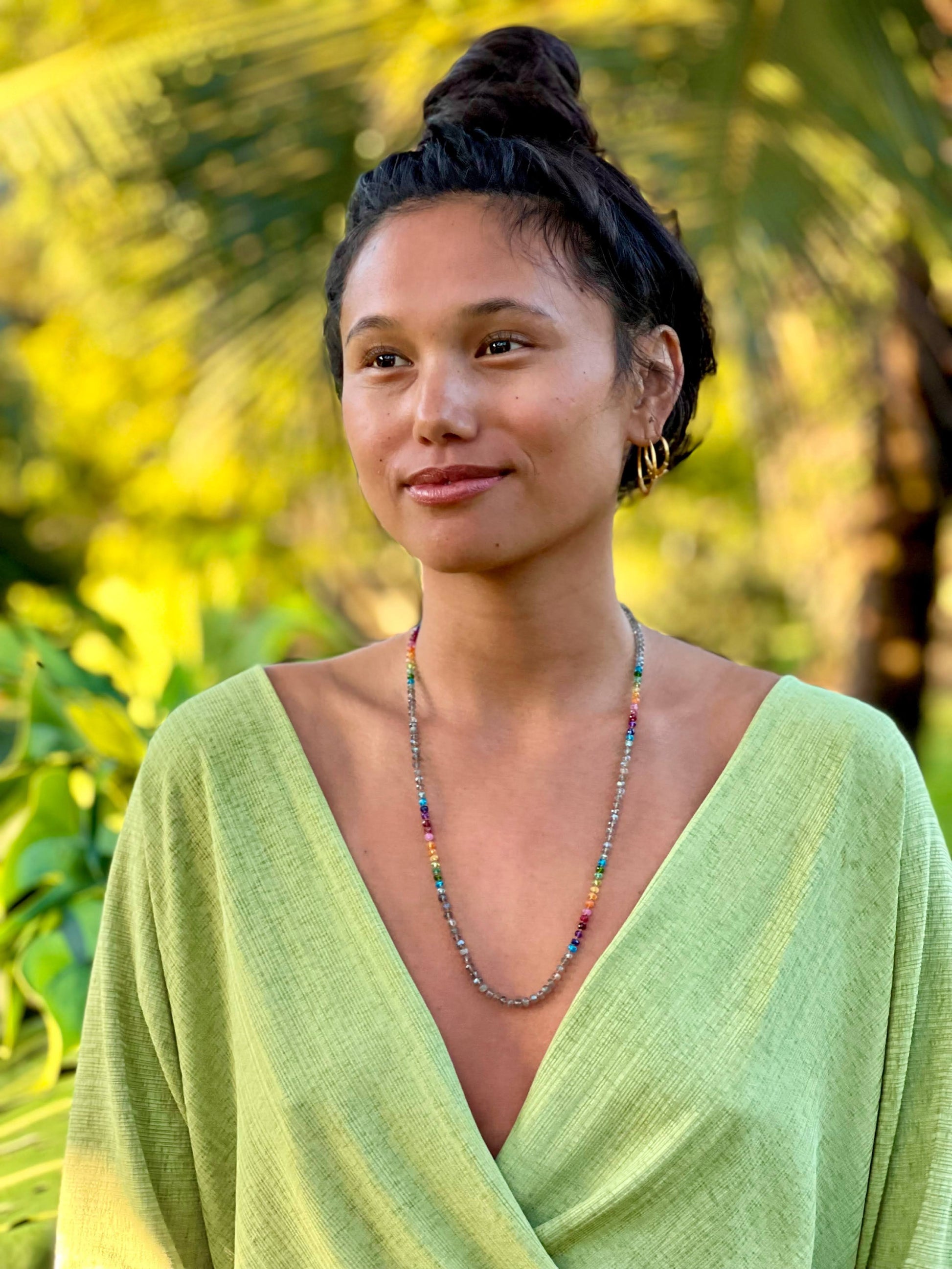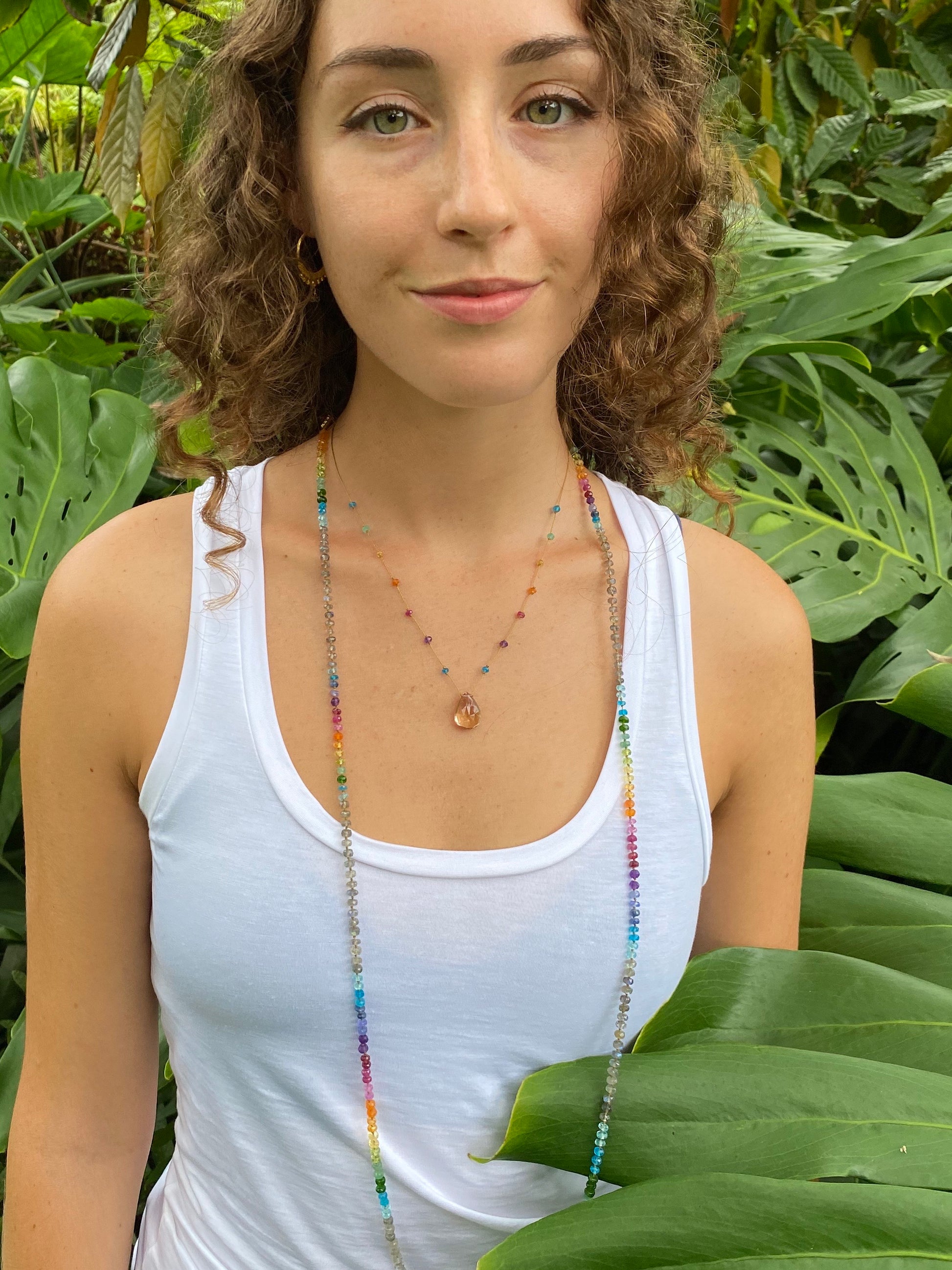 You can layer Rainbow Leis with with both our Alohi or Rainbow Drop collections. They are also a lovely compliment to our Rainbow Mana pieces and can be worn to bring forth dynamic color contrast or chosen mineral emphasis.