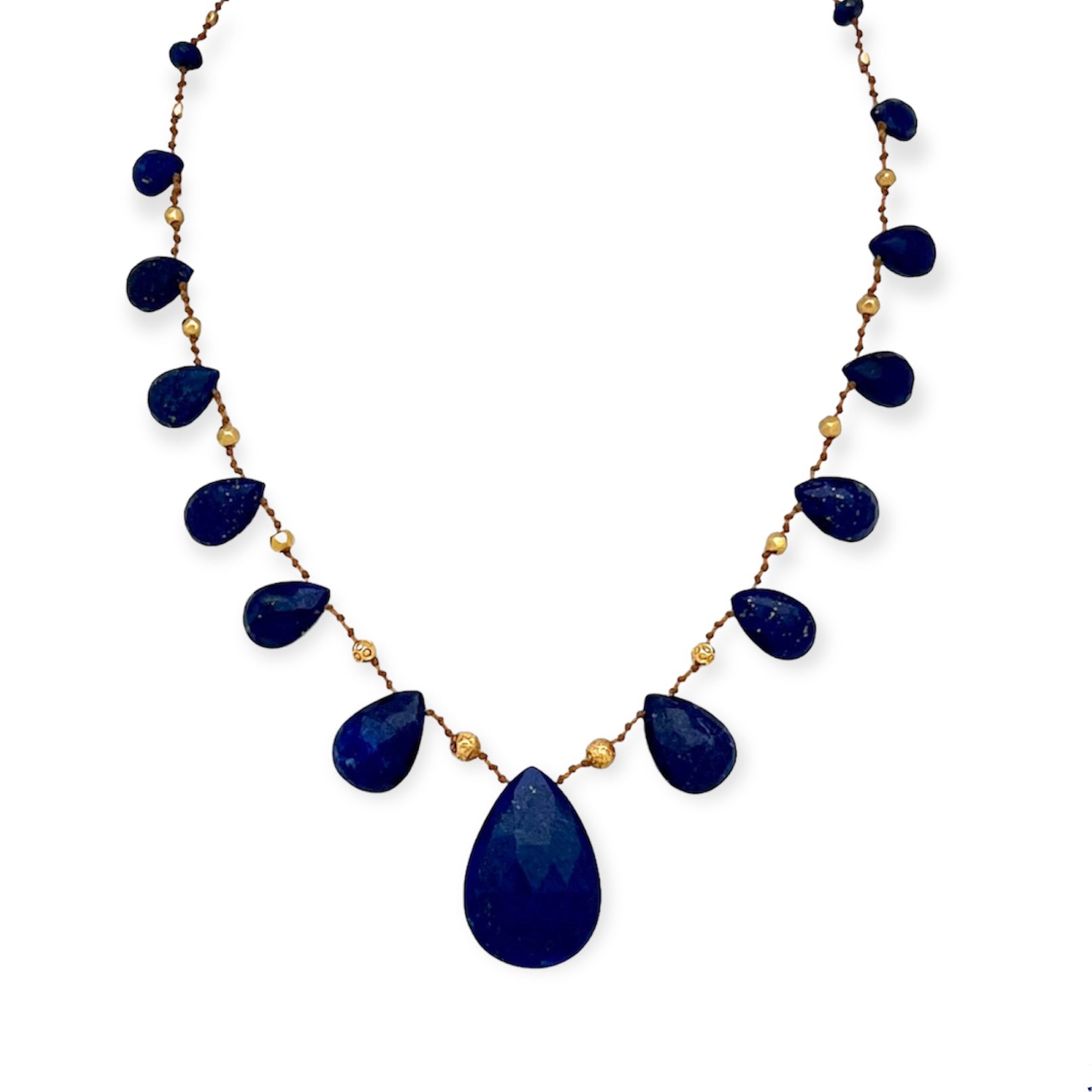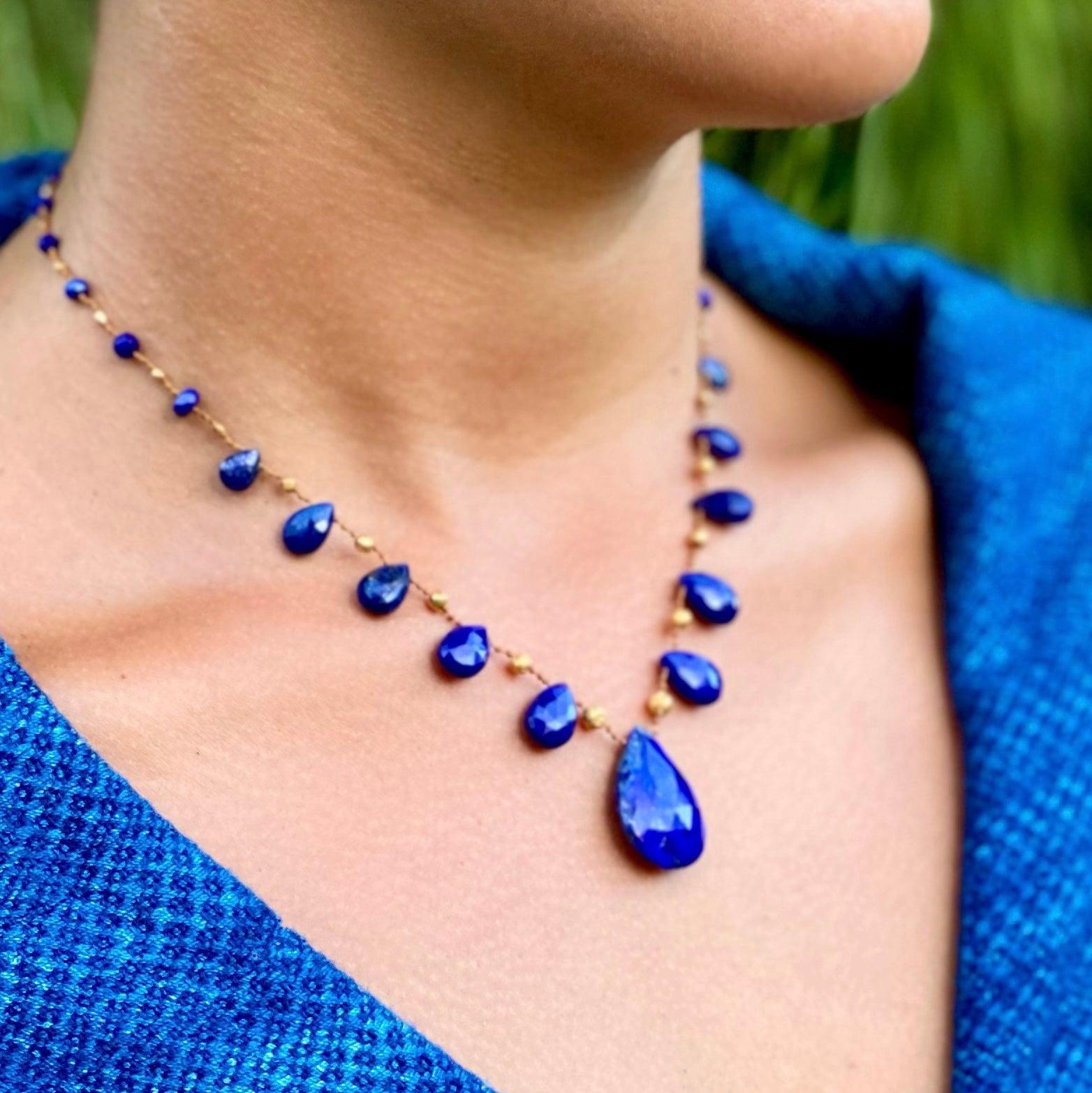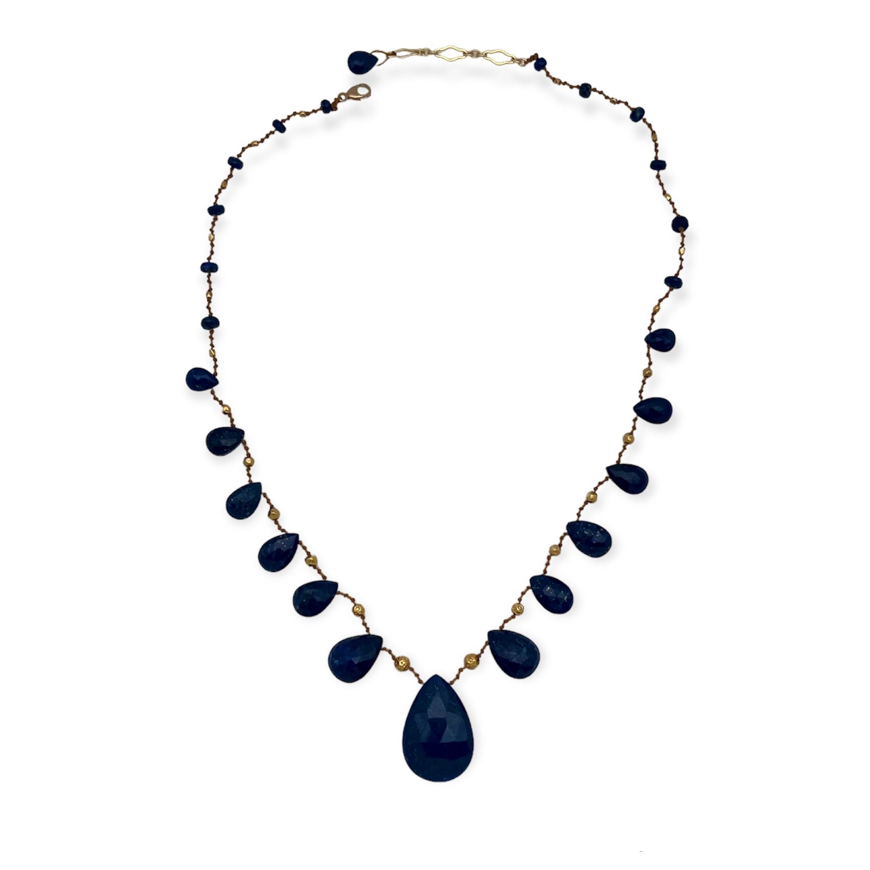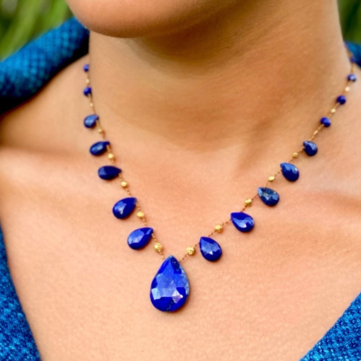 Distinguished Lapis Lazuli is like a wise council within, offering personal alignment and an unwavering commitment to our truth. Both royal and grounded, these weighty drops insist that our life is best lived, awake and present. Graduated gems are set between handmade solid 18k gold beads.