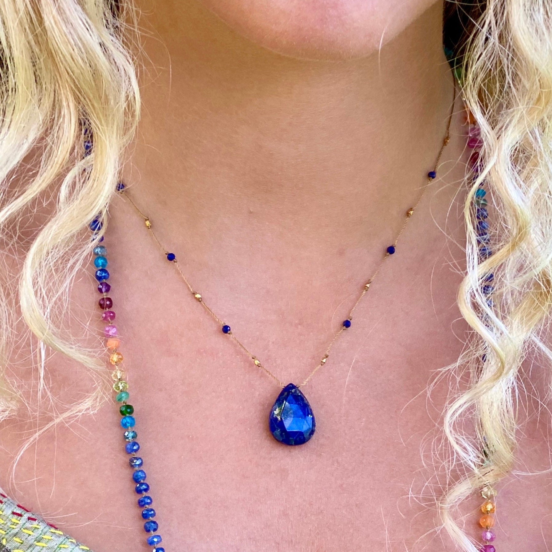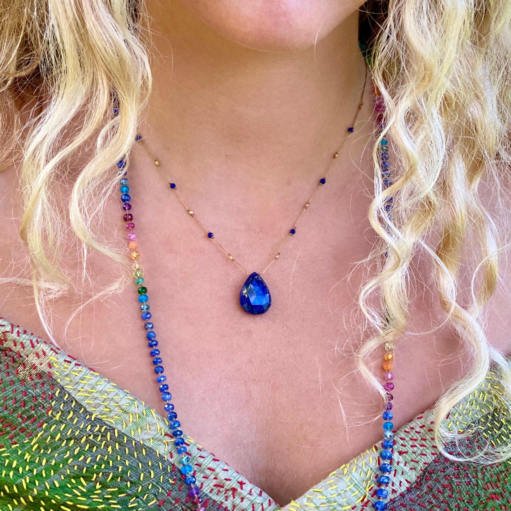 United in a shining continuum, each strand features a faceted gemstone drop and includes a repeating sequence of coordinating gemstone beads alternated with hand built gold beads.