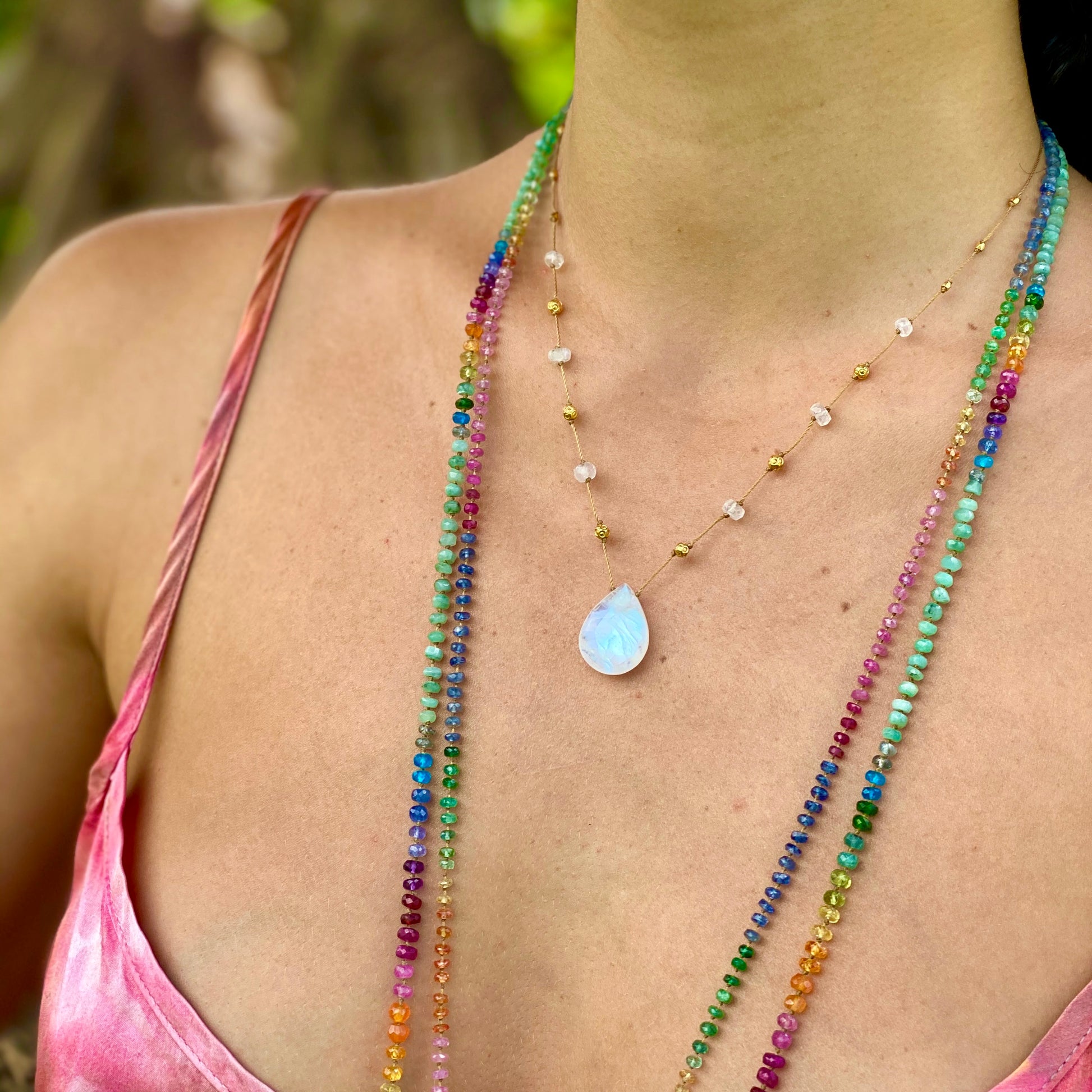United in a shining continuum, each strand features a faceted gemstone drop and includes a repeating sequence of coordinating gemstone beads alternated with hand built gold beads.