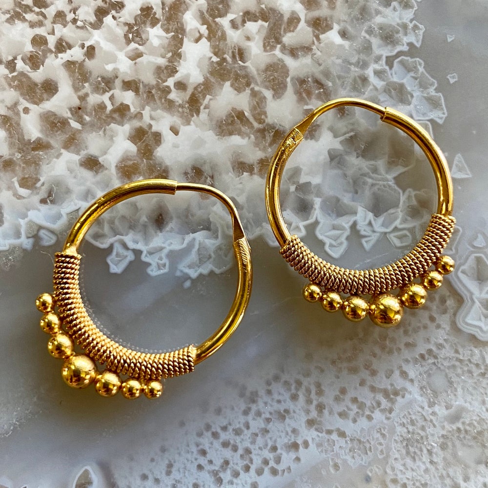 Designed and crafted in alliance with a 9th generation gold smithing family from India, these handmade earrings are as authentic as they are delightful. The precious metal gold is considered a master healer with rays in spiritual development, purification, and rejuvenation and these earrings carry the vibration rightly. Inspired by traditional Indian design with Amalia’s flair for detail their style is enhanced with solid 18 karat gold, precious gemstones, and hand formed beads. Together they spark a quiet revival of play, artistry, and finely honed craft, honoring the maker and the adorned.