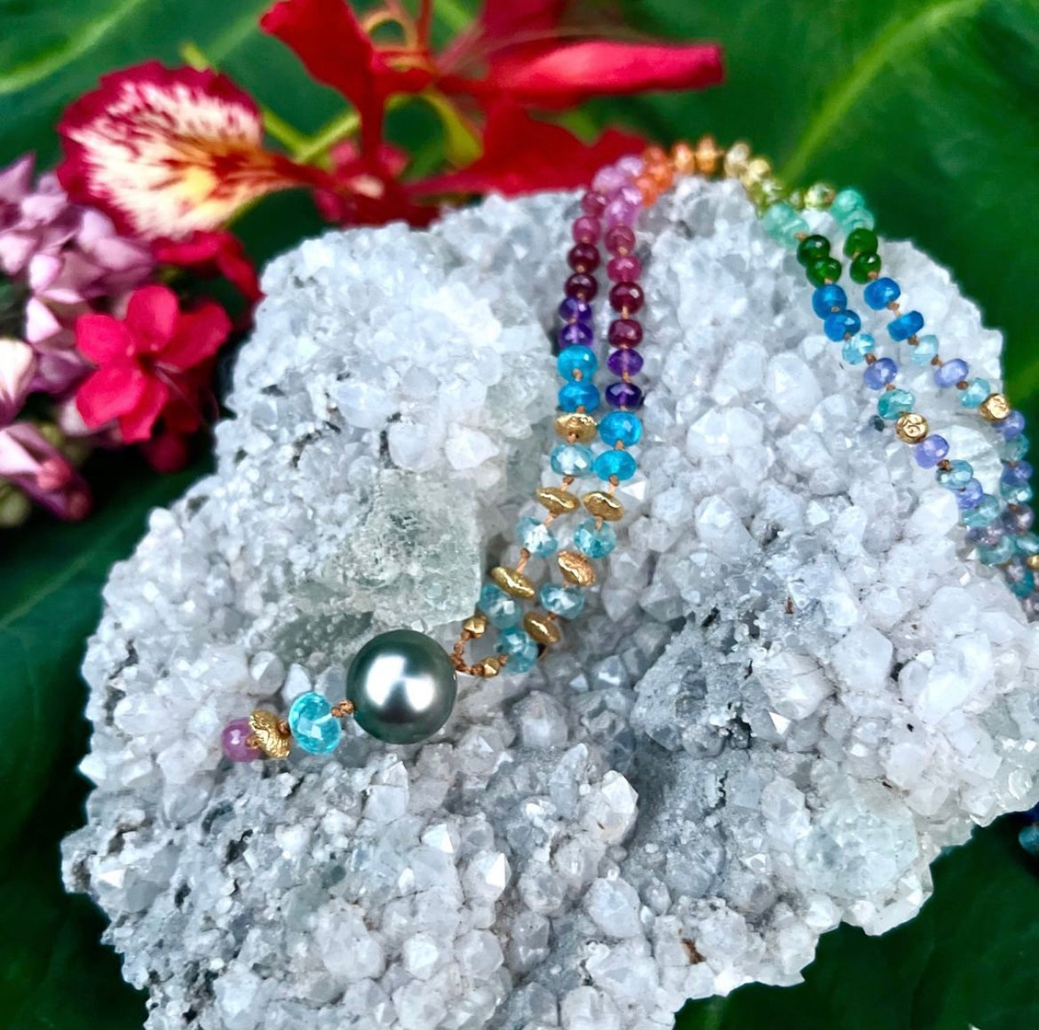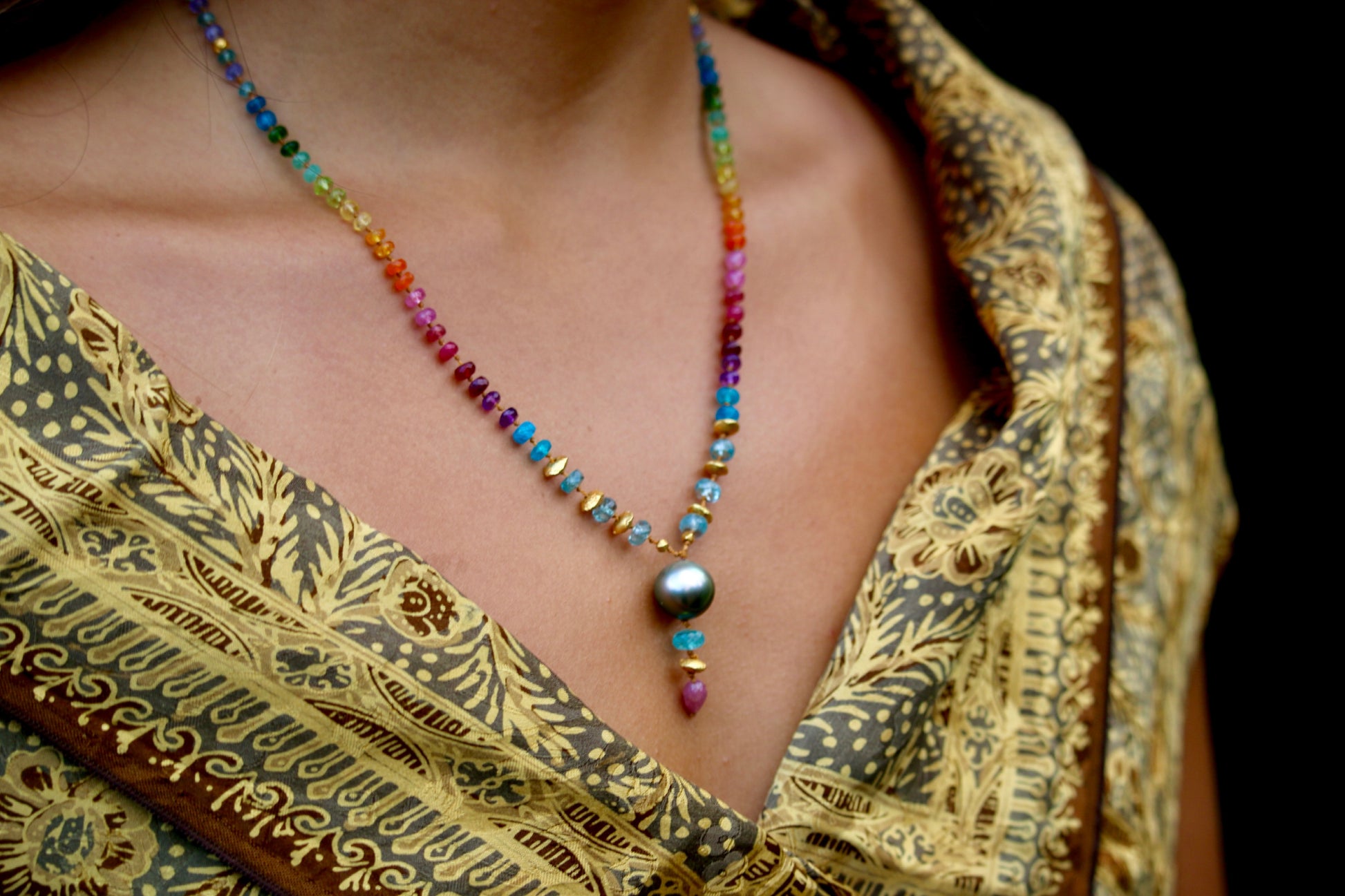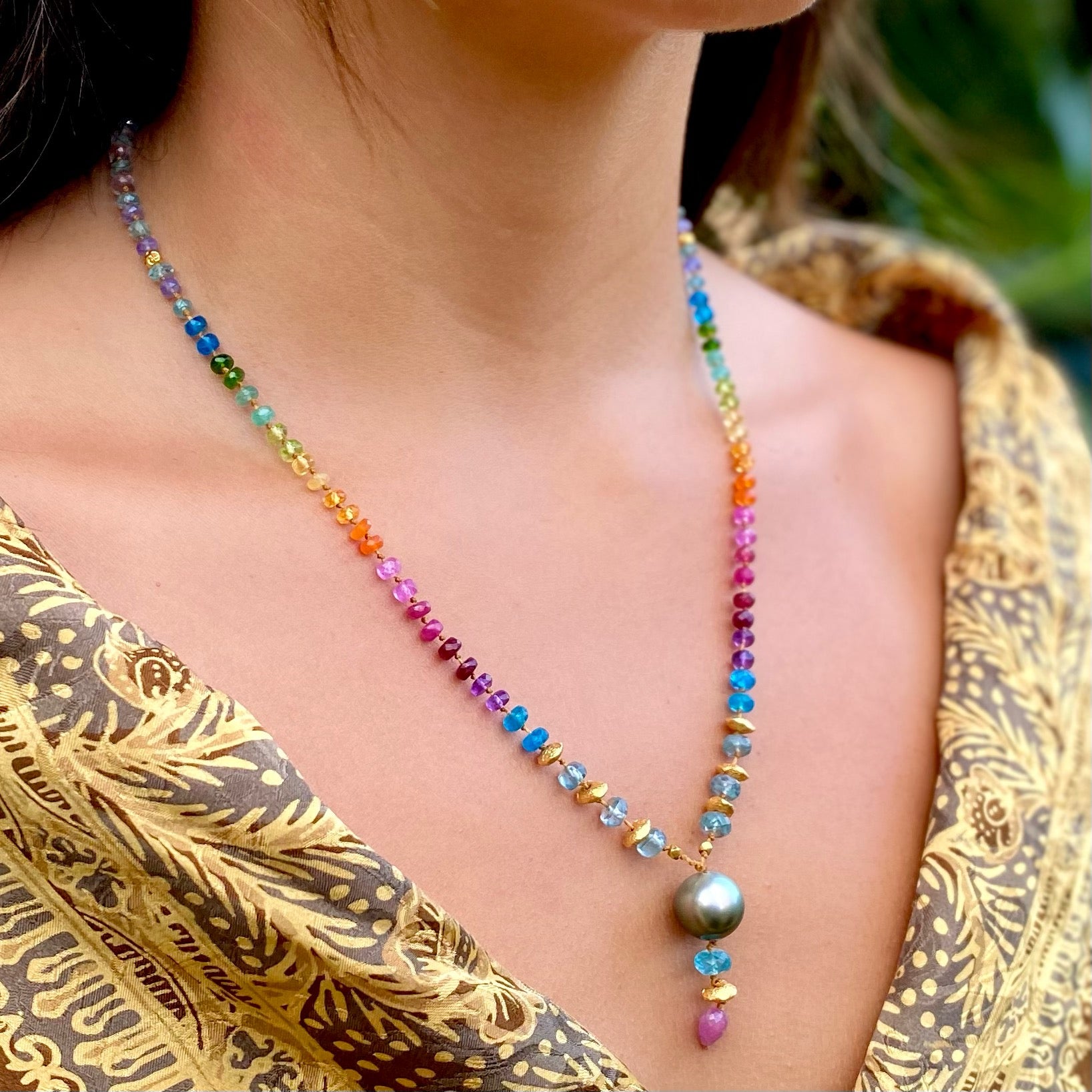 Inspired by the ethereal blessing of a rainbow as it breaks through the clouds in a show of light, the rainbow mana collection emanates an awe inspiring beauty that is food for the soul. Playing with the full light spectrum of color, these strands are saturated in rainbow hues featuring a substantial crystalline drop, making each a true power piece of resonant medicine. Like a deep base note, the rainbow mana collection brings depth, strengthening our inner vibration and heralding the abundance of our most radiant nature.