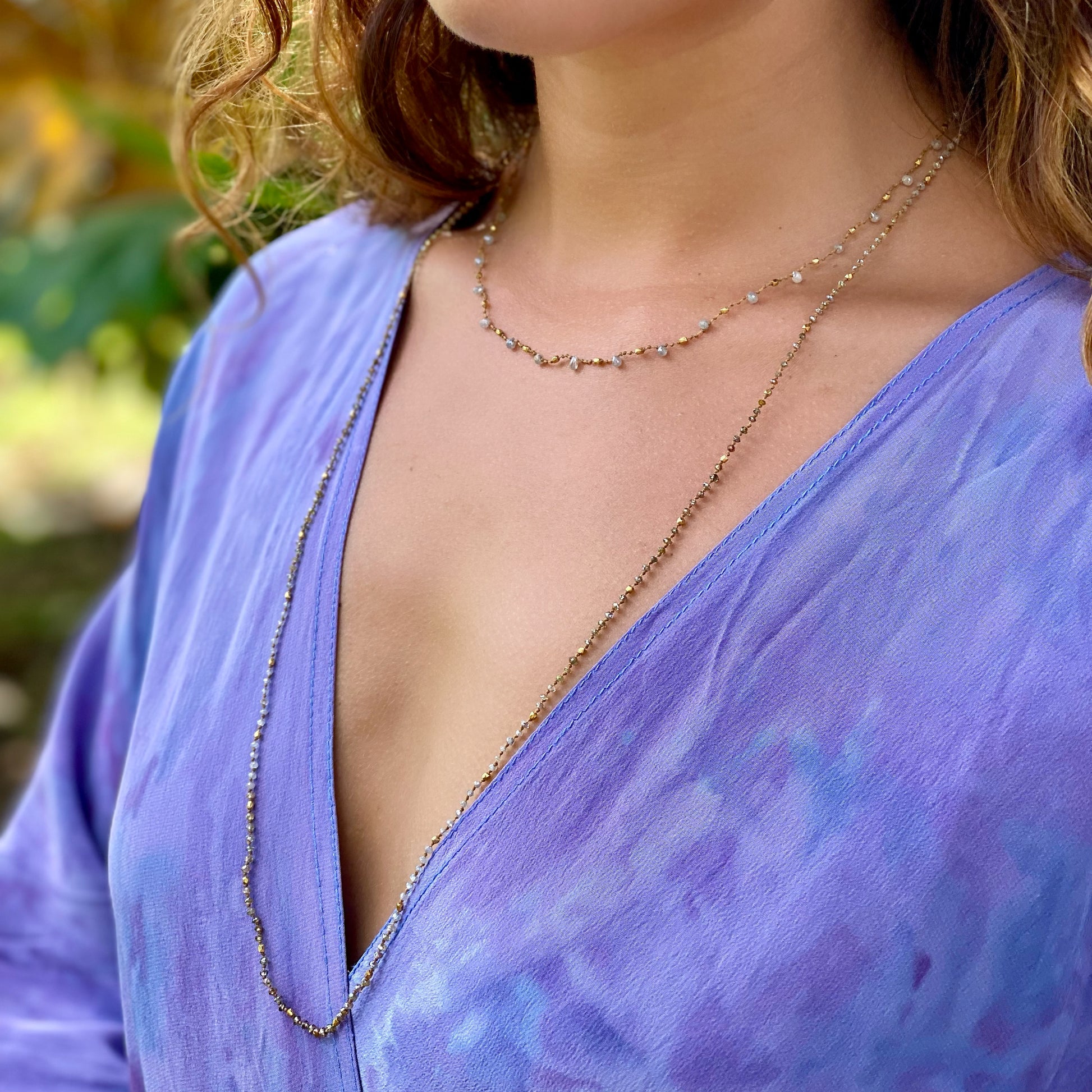 Part of our Royal Ali’i collection, these sky-lit pale Grey Diamonds twinkle between delicately spaced handmade solid 18k gold beads