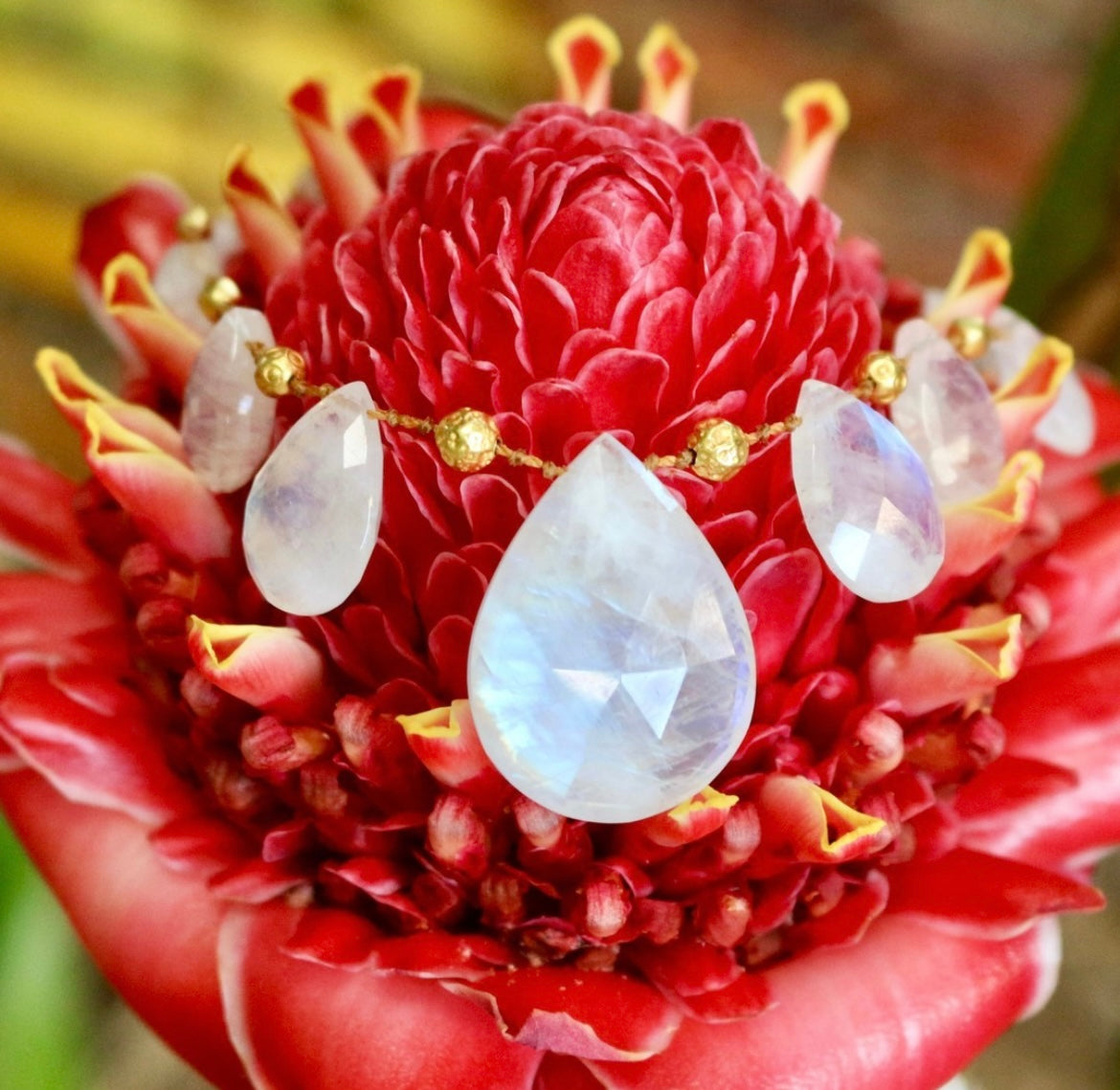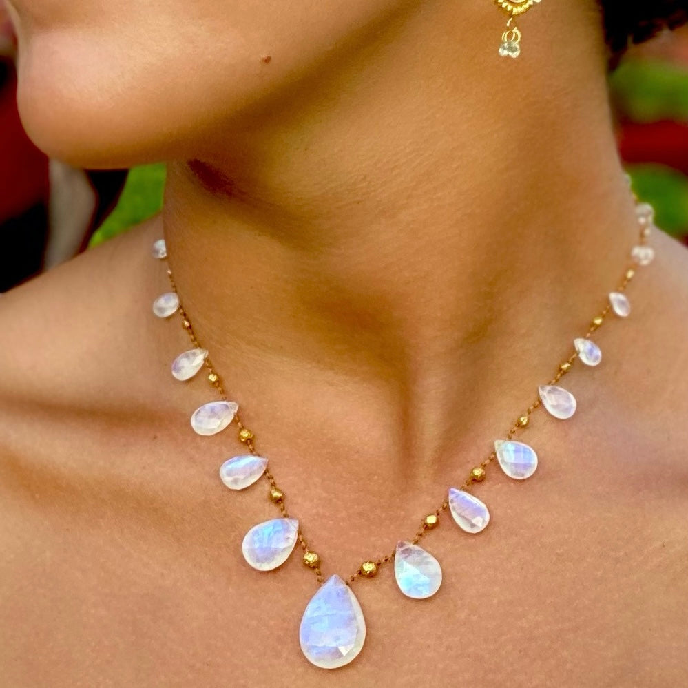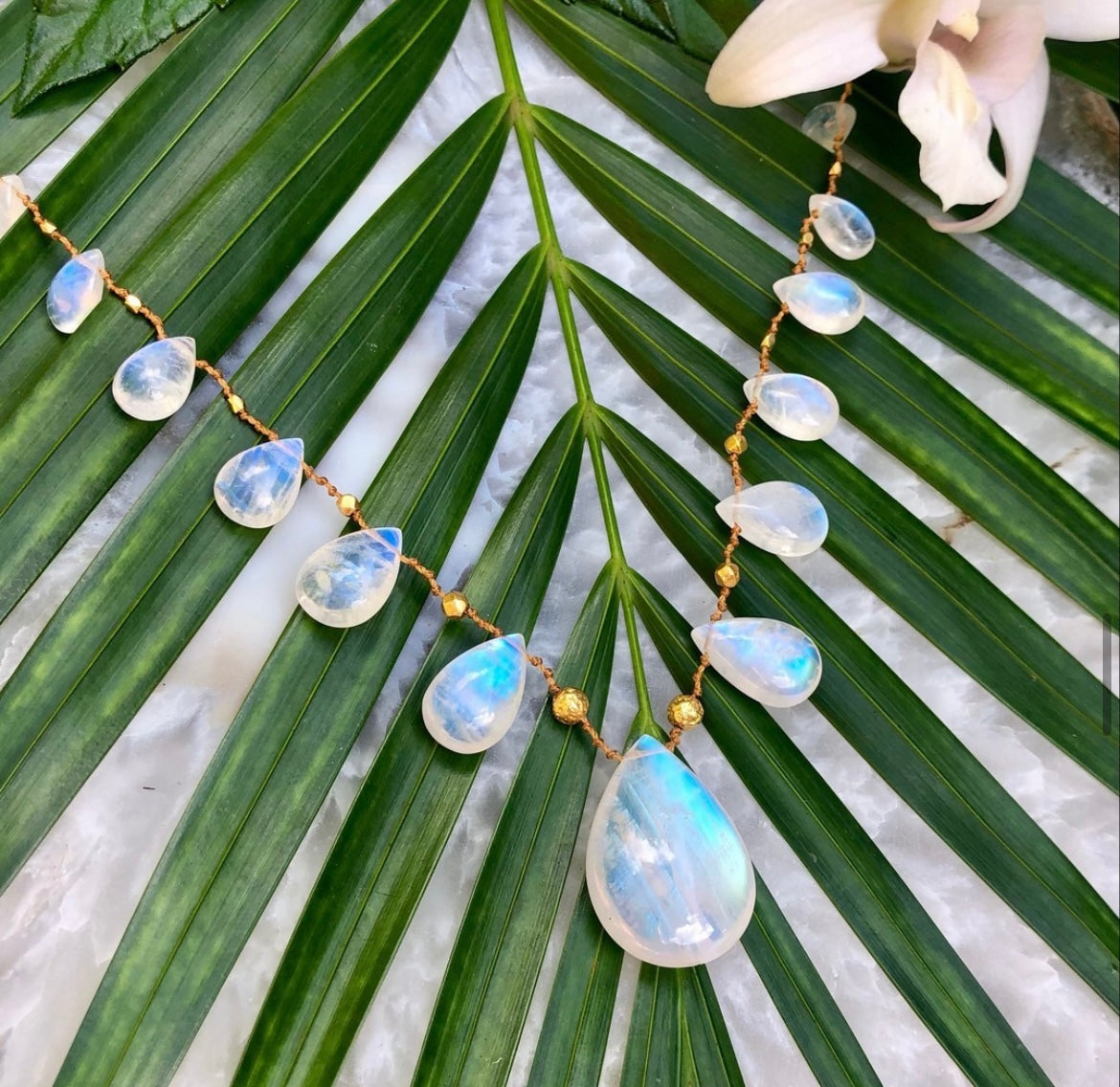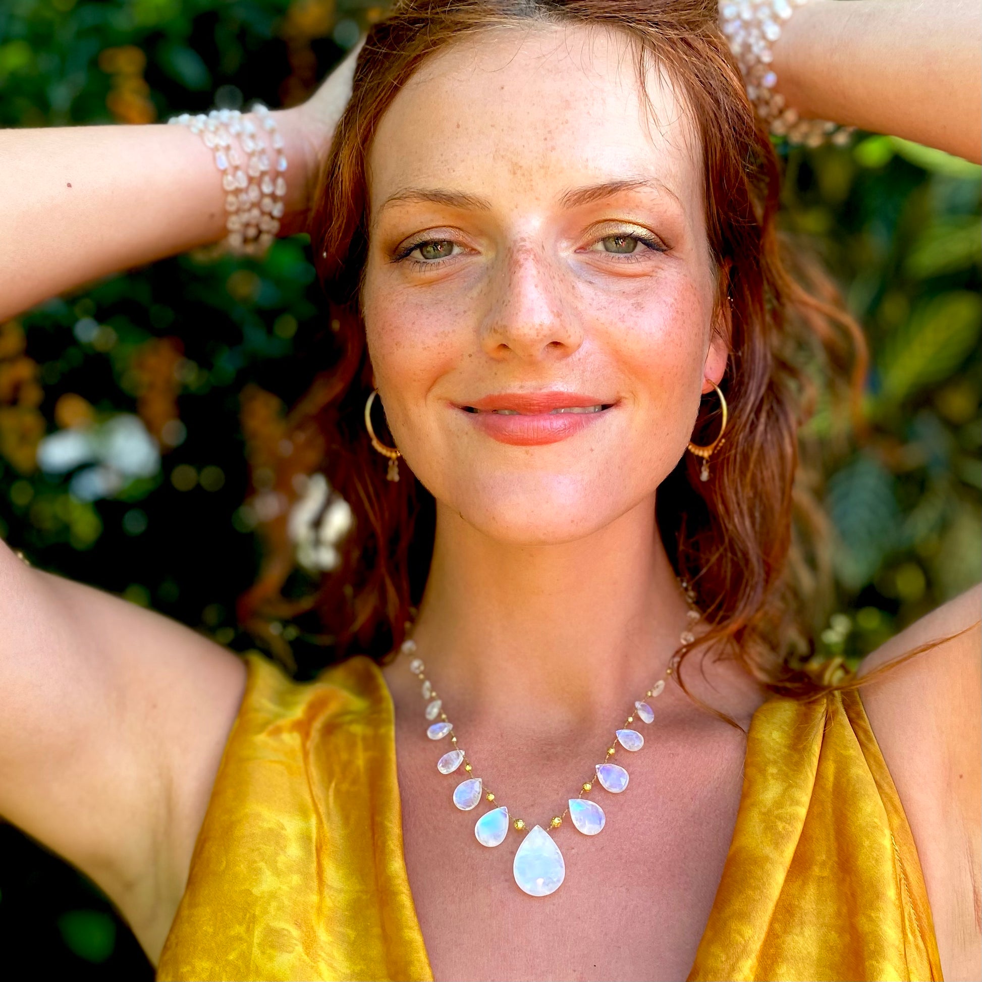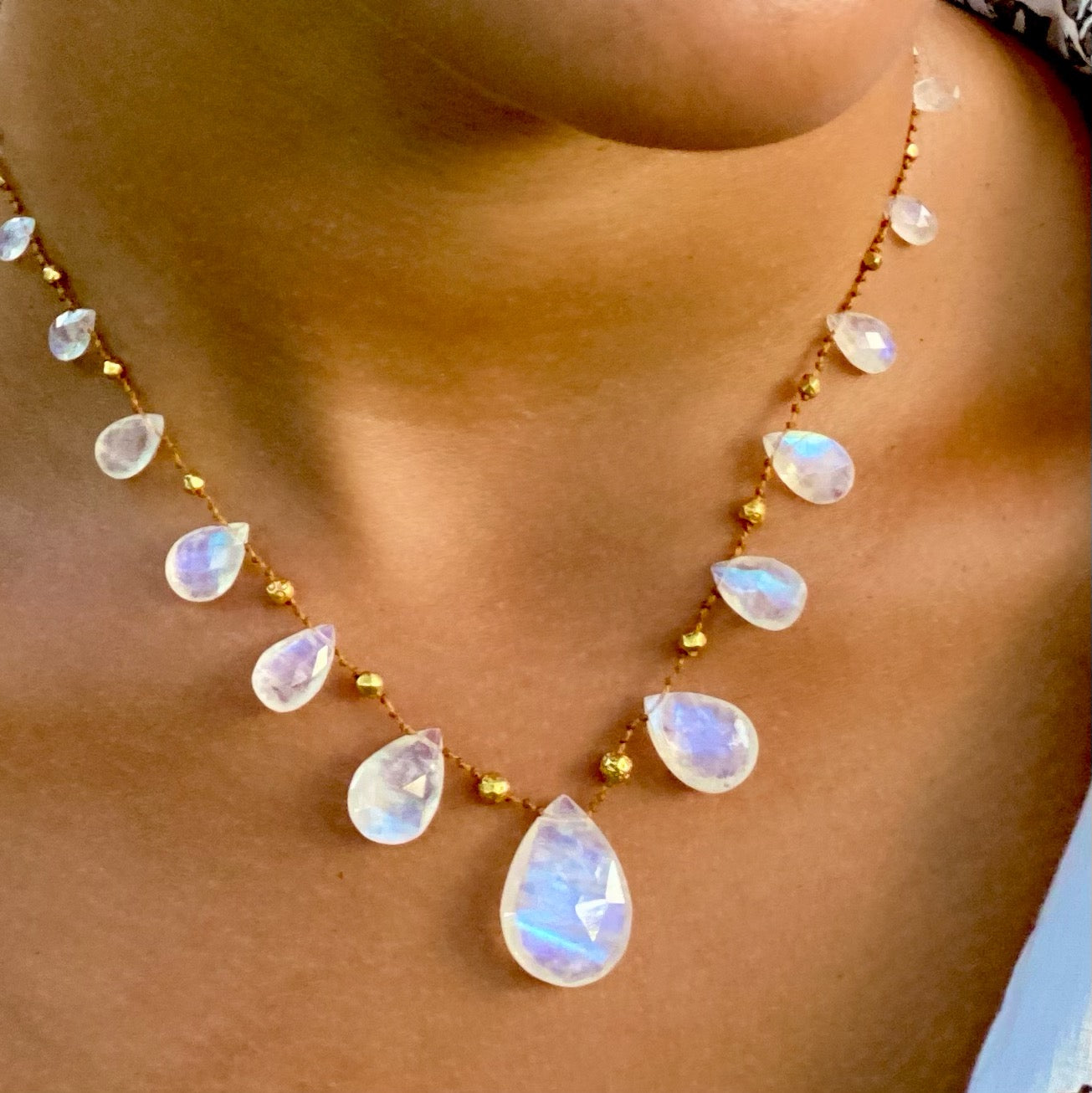 Iridescent Moonstone drops mesmerize and nourish in lunar frequencies sparkling with intuitive allegiance, dreamtime, emotional wisdom, cyclical attunement, and feminine empowerment. Graduated gems are set between handmade solid 18k gold beads.