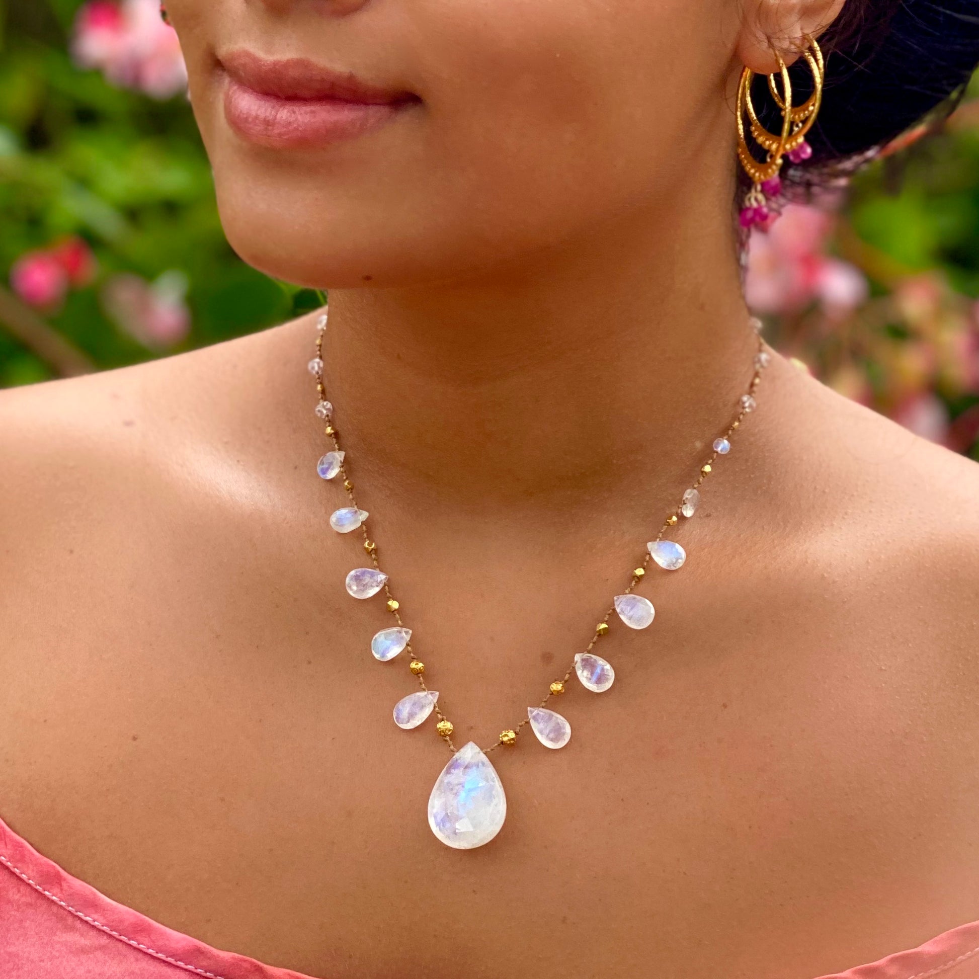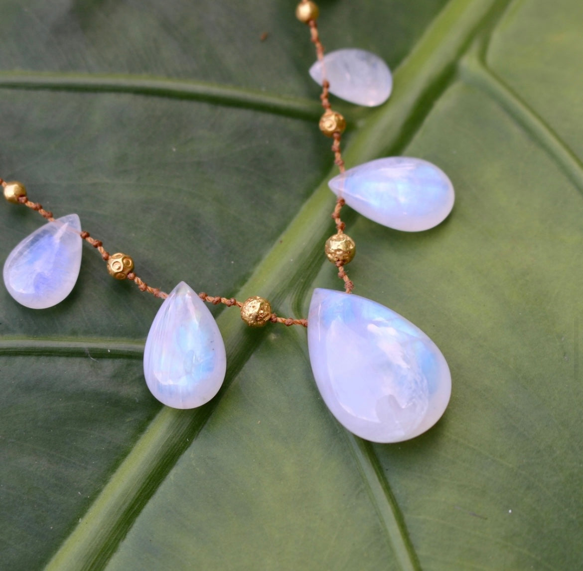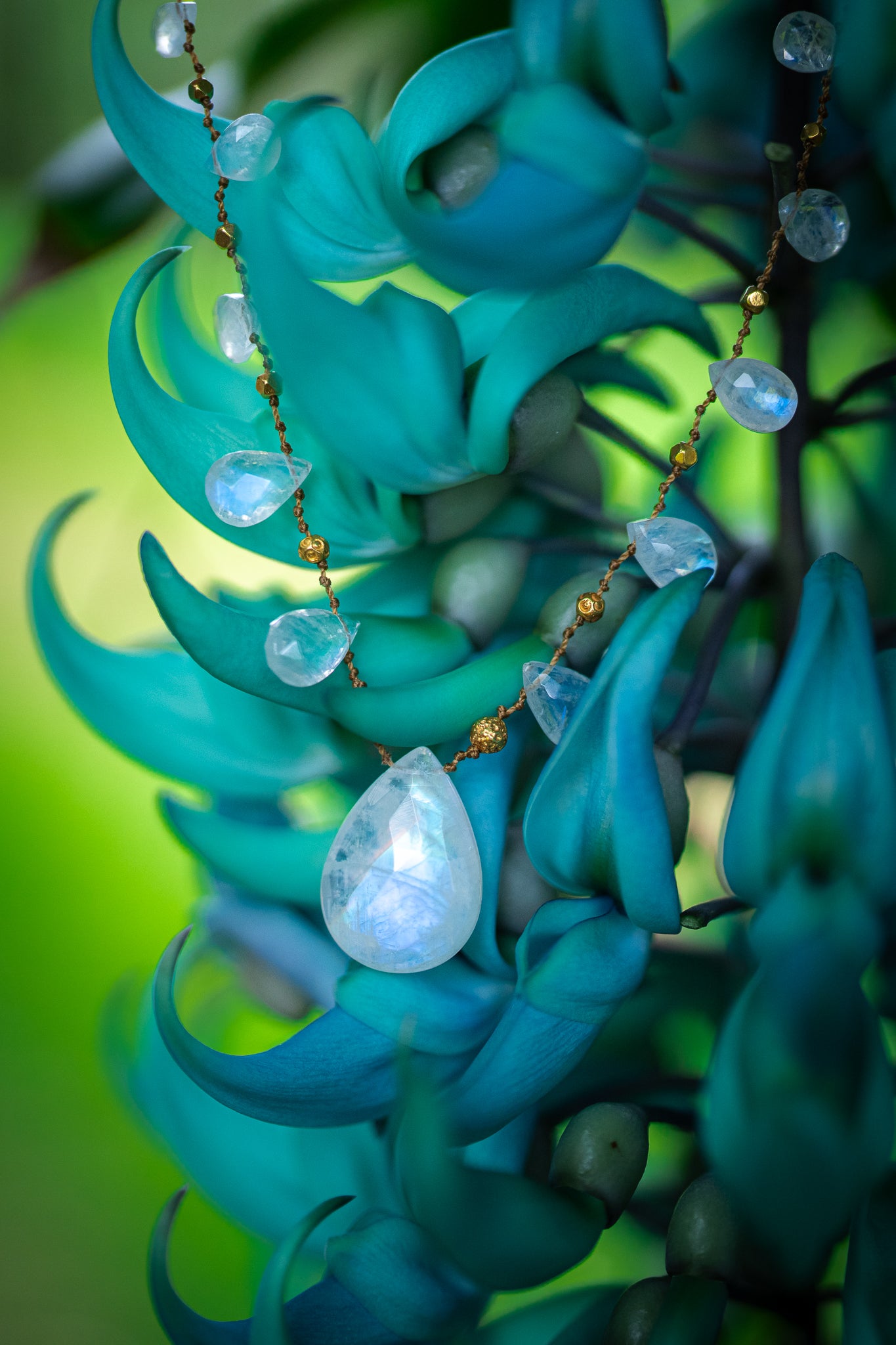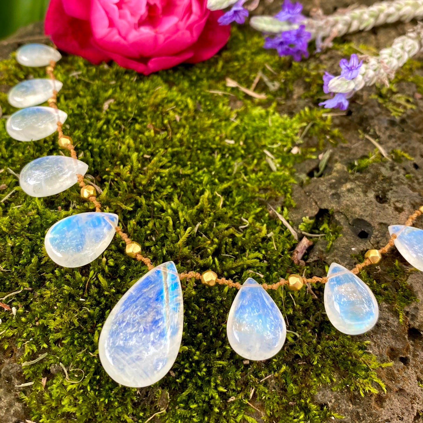 Iridescent Moonstone drops mesmerize and nourish in lunar frequencies sparkling with intuitive allegiance, dreamtime, emotional wisdom, cyclical attunement, and feminine empowerment. Graduated gems are set between handmade solid 18k gold beads.