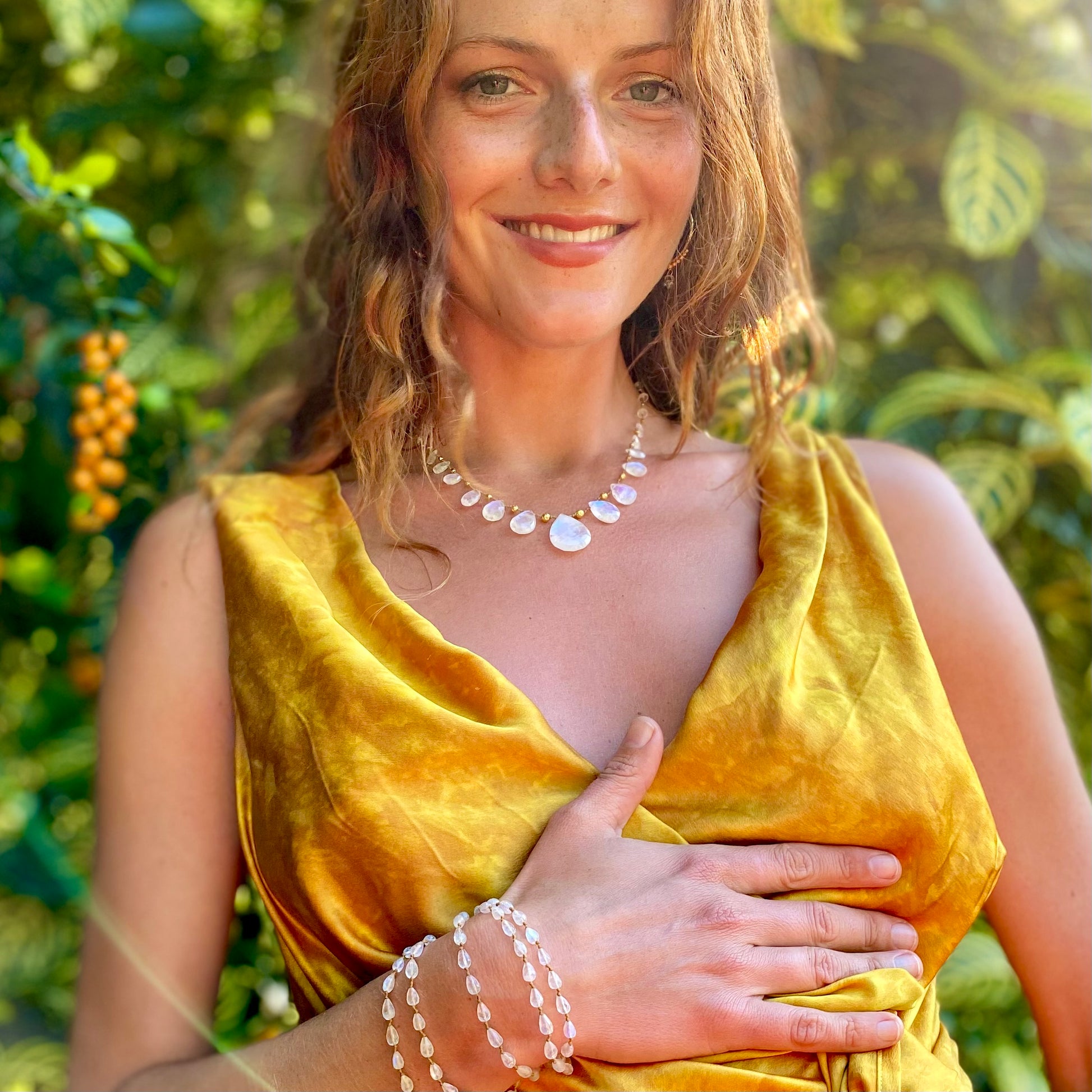 This luminous line provides a substantive dose of crystalline nutrition, pulsing with elevated earth frequencies from the body of nature herself. Designed for the noble-hearted, these regal priestess pieces are comprised of multi-dimensional drop gemstones, highlighted by handmade 18 karat gold beads. This is bling at its most blessed.