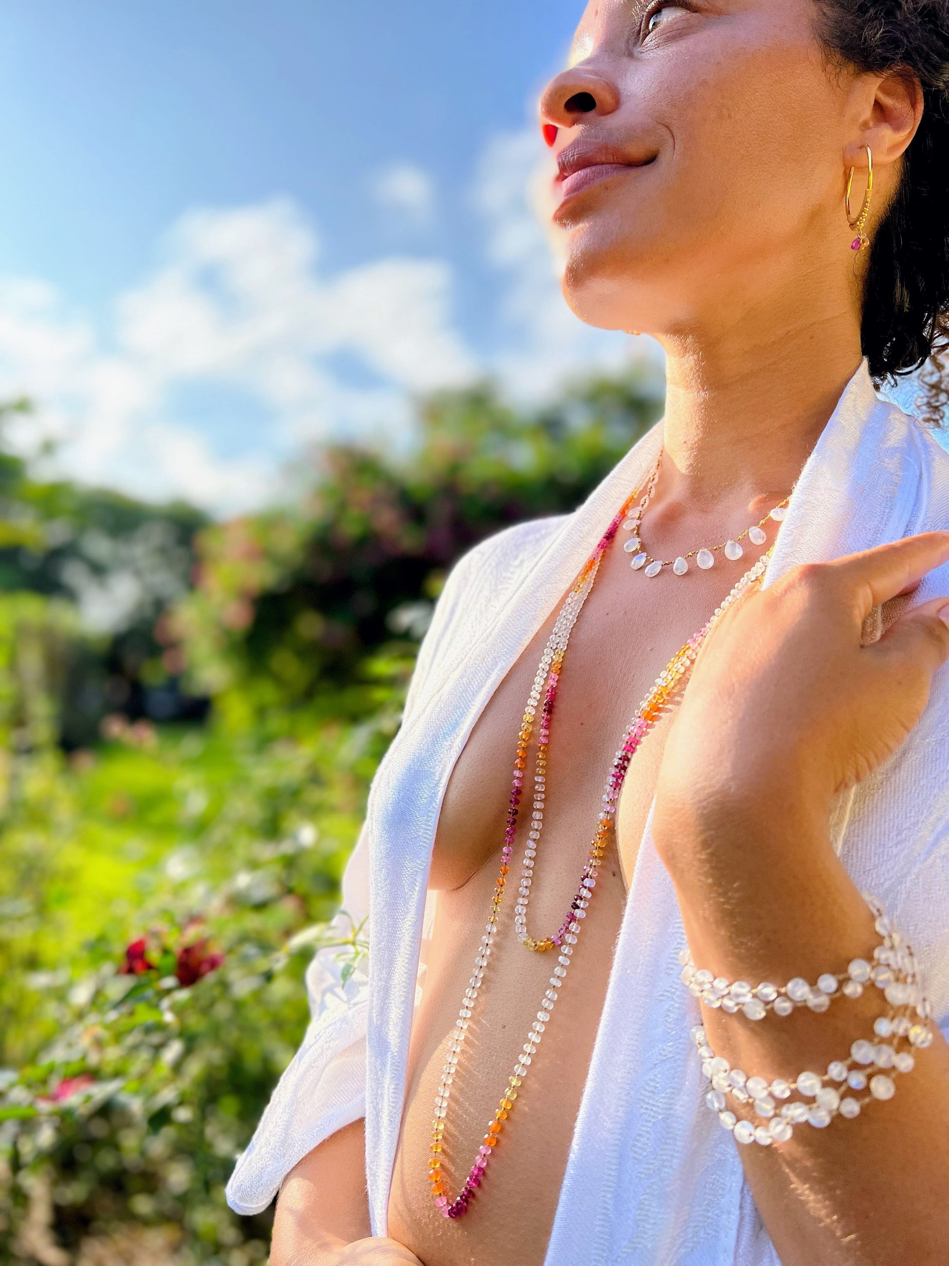 A bouquet of crystalline blessings featuring magical Moonstone. These stunning long leis can be worn long, doubled, or wrapped around the wrist.