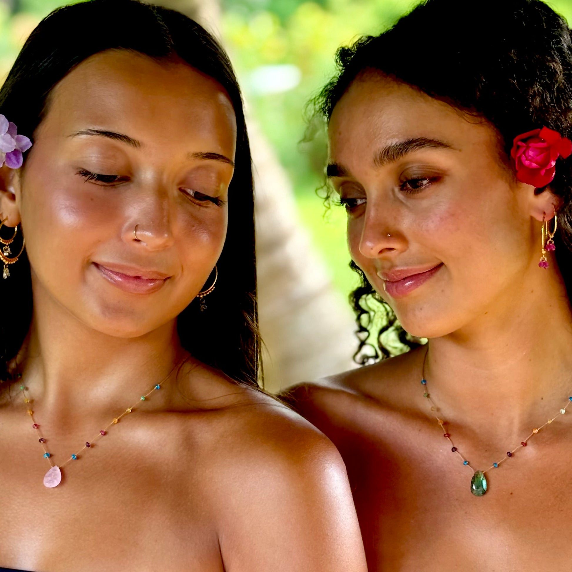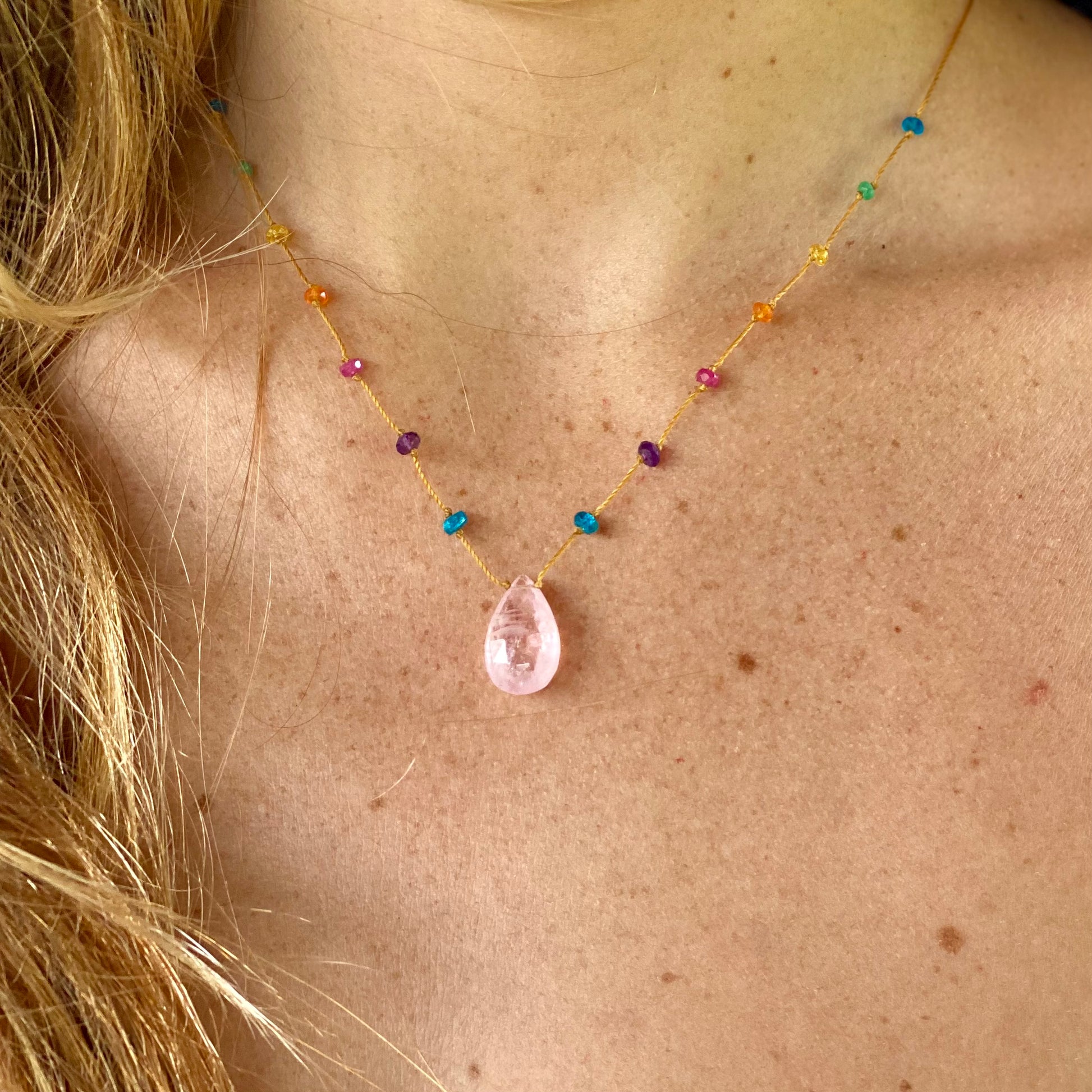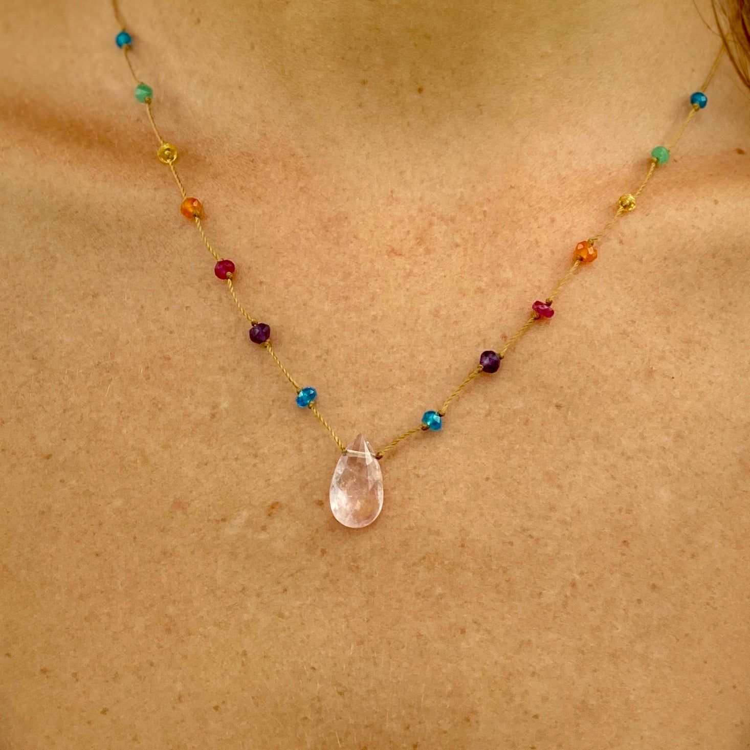 Perhaps the quintessential beginning of Rainbow Gems Kauai, our rainbow drops have been adorning people for over a decade. These delicate rainbow drops showcase the full light spectrum with carefully spaced individual gemstones, culminating in a featured crystalline drop. Just as rainbows herald new beginnings and luck these exquisite strands are the perfect place to begin your love affair with Amalia’s artwork. Many find that once they put on their rainbow drop they never take it off again, such is the nature of love. These strands are perfect for the minimalist at heart and make a striking impression stacked in a series with our other collections.