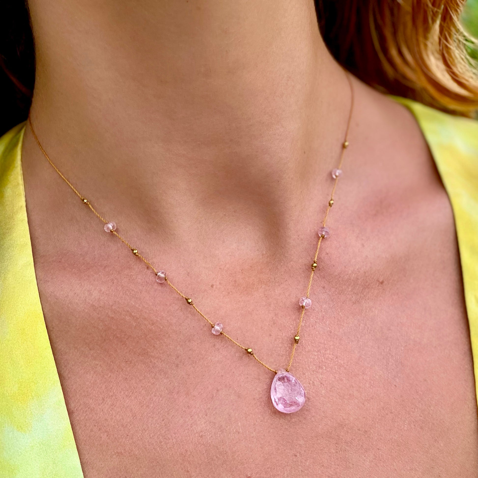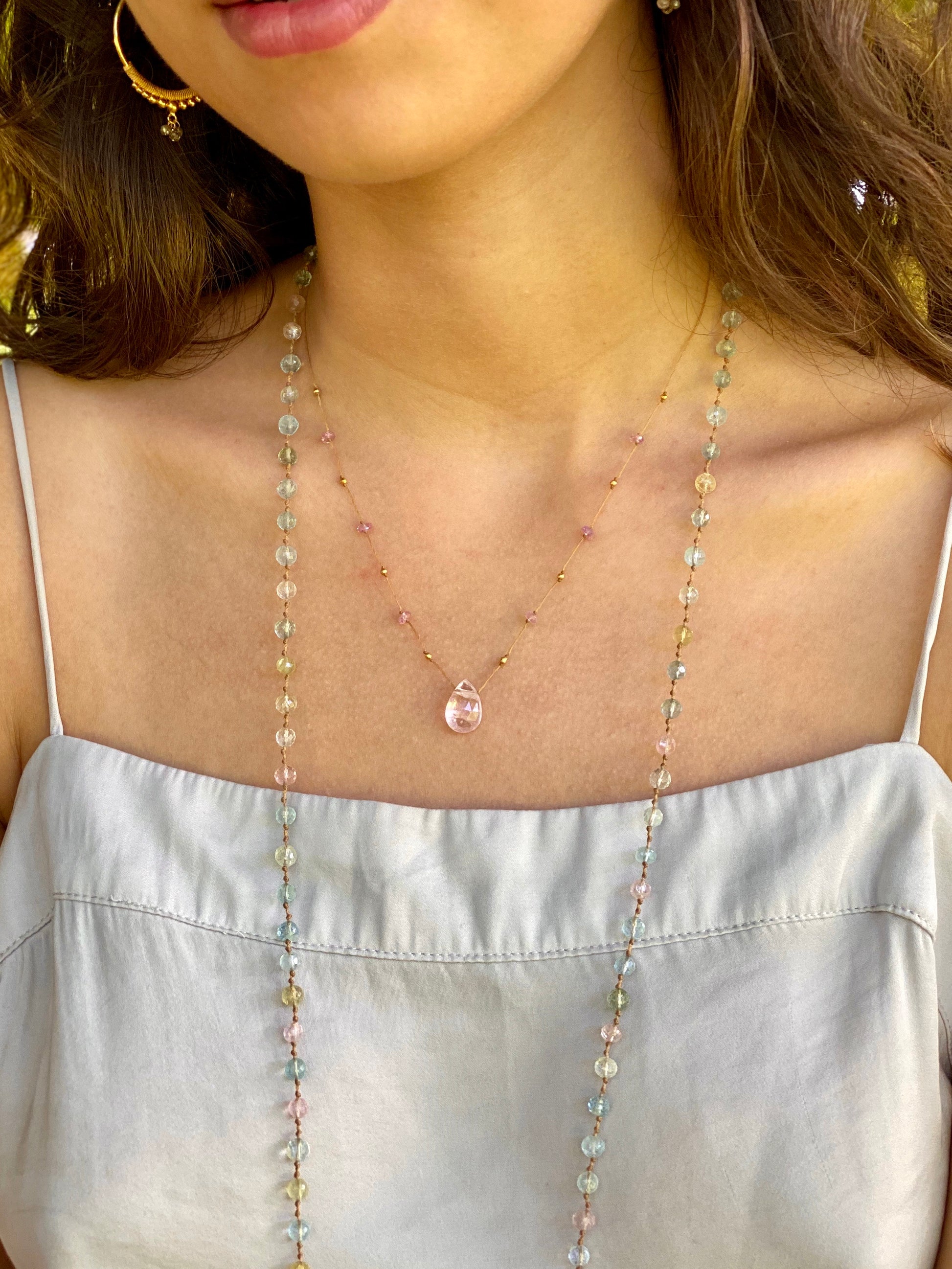 A lovely, soft Pink Aquamarine drop with Pink Sapphires and handmade solid 18k gold beads.