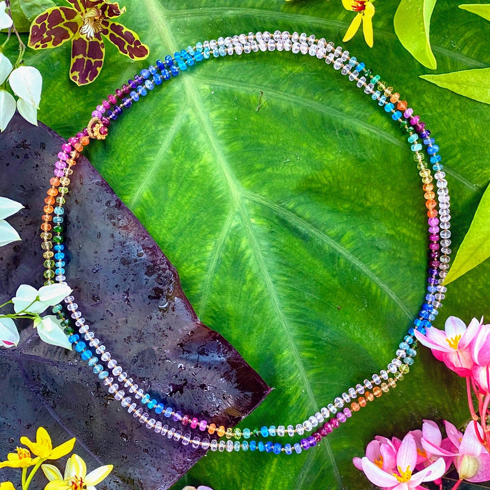 Leis are a quintessential expression of aloha and a stringed embrace of love, friendship, welcome, appreciation and honor. Rainbows are symbols of hope, new beginnings, equality for all beings, abundance, luck, and the bridge between human and spiritual worlds. Wearing this crystalline light spectrum is a bouquet of blessing, a welcoming of our embodied expression, and a powerful activation for new phases of life.