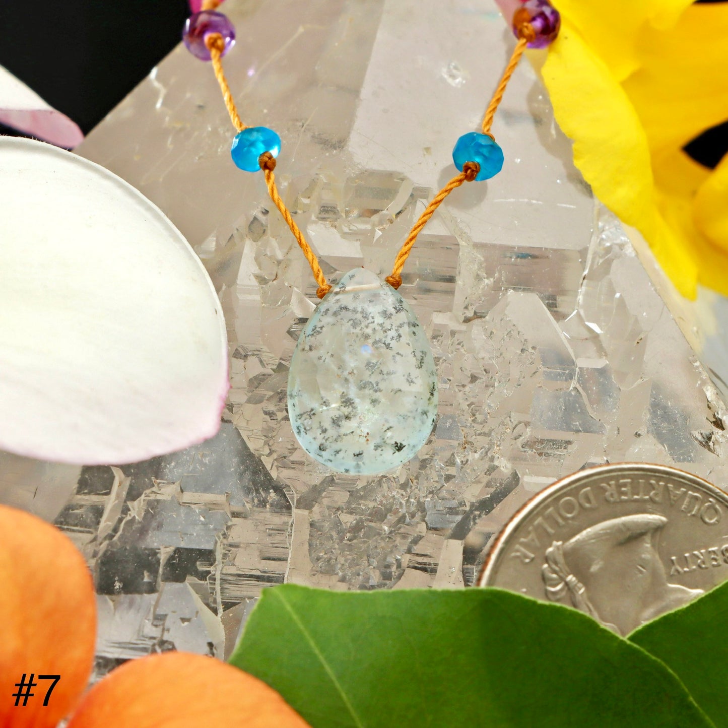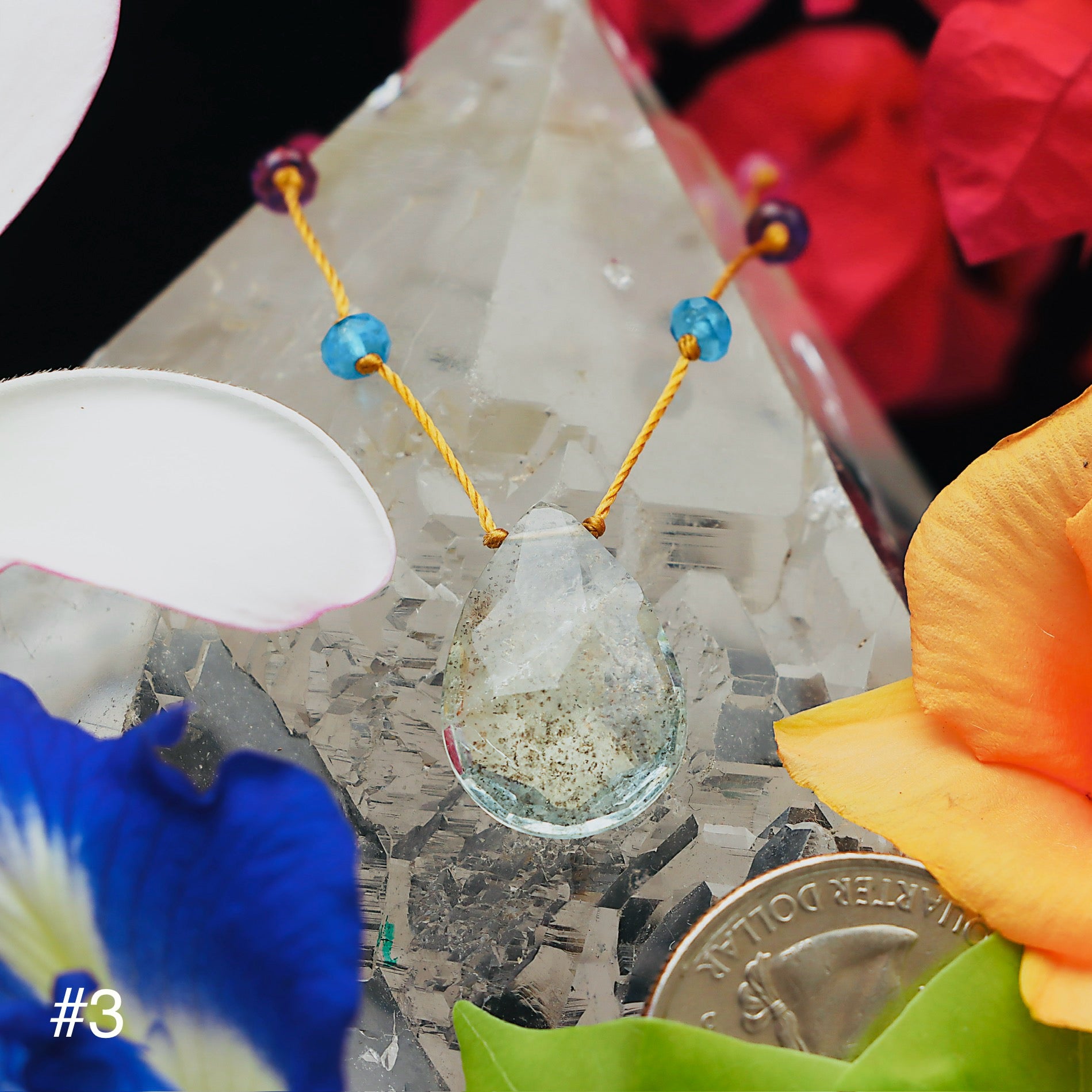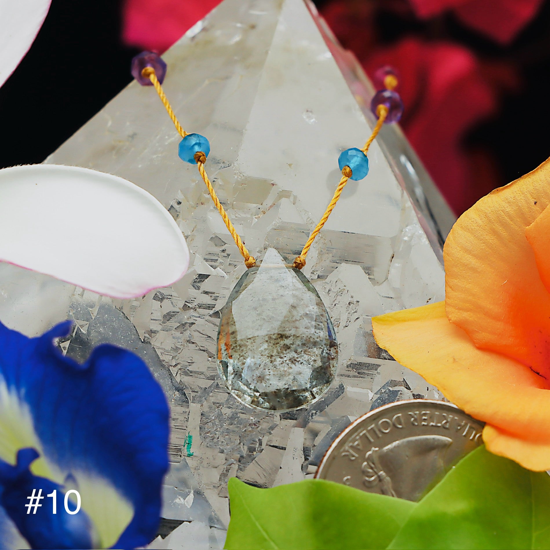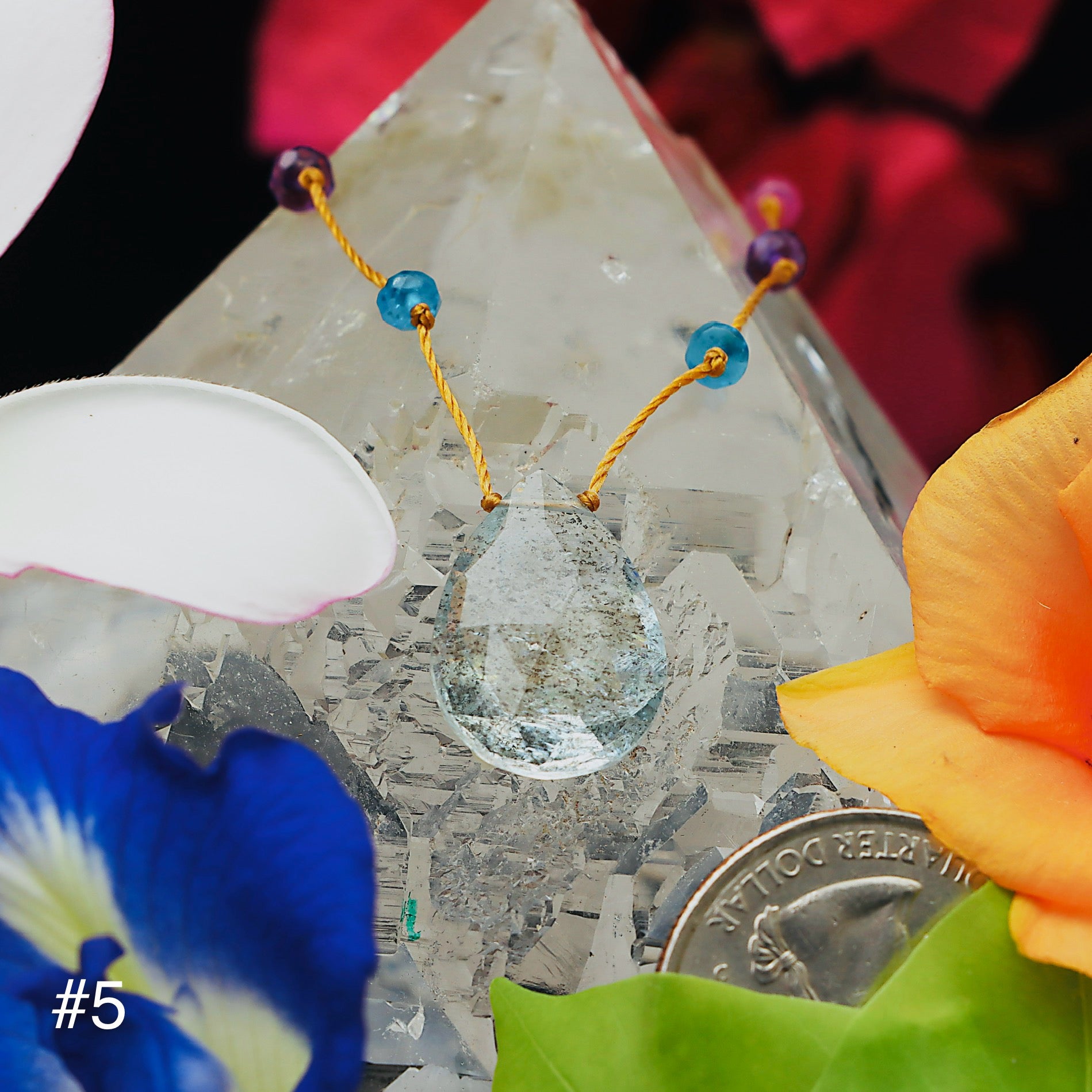 Perhaps the quintessential beginning of Rainbow Gems Kauai, our rainbow drops have been adorning people for over a decade. These delicate rainbow drops showcase the full light spectrum with carefully spaced individual gemstones, culminating in a featured crystalline drop. Just as rainbows herald new beginnings and luck these exquisite strands are the perfect place to begin your love affair with Amalia’s artwork. Many find that once they put on their rainbow drop they never take it off again, such is the nature of love. These strands are perfect for the minimalist at heart and make a striking impression stacked in a series with our other collections.