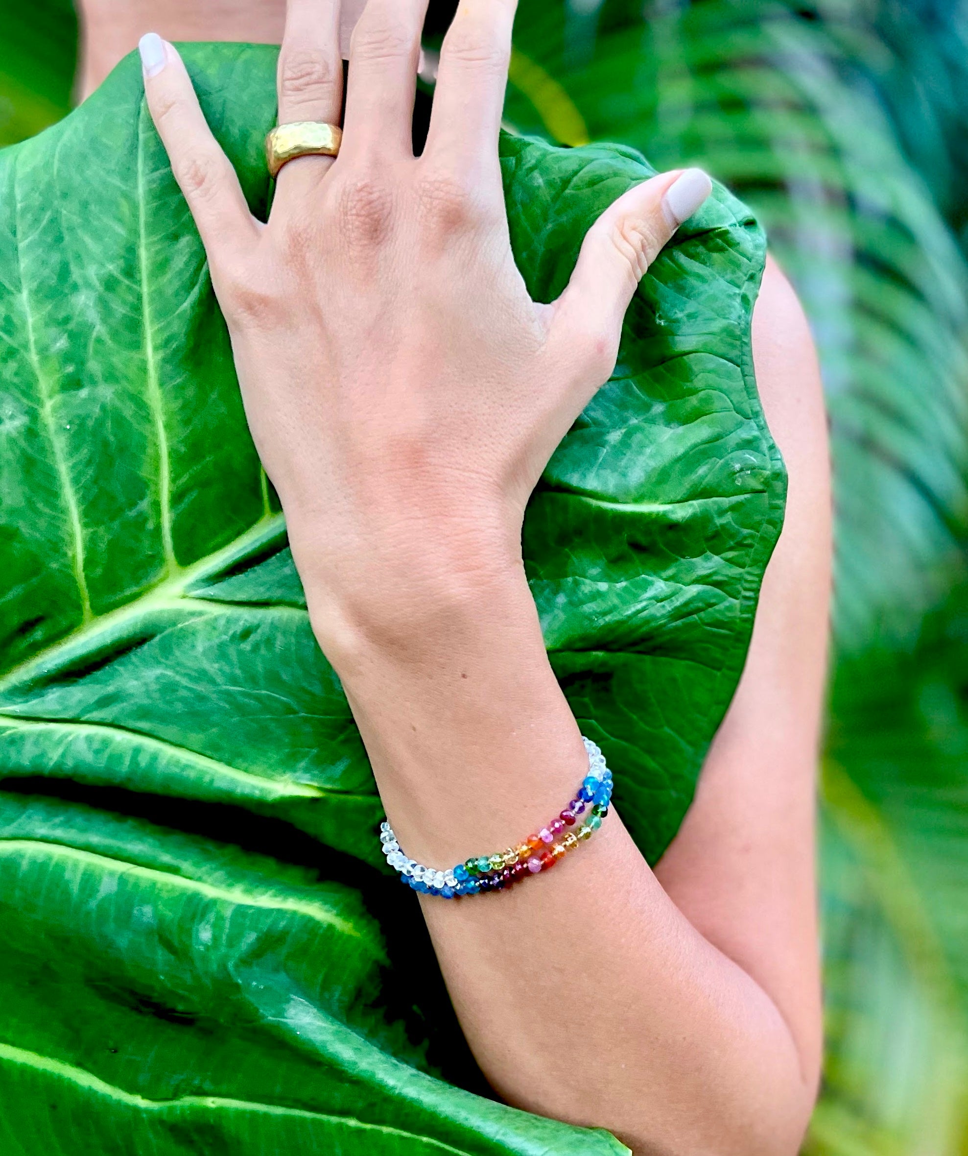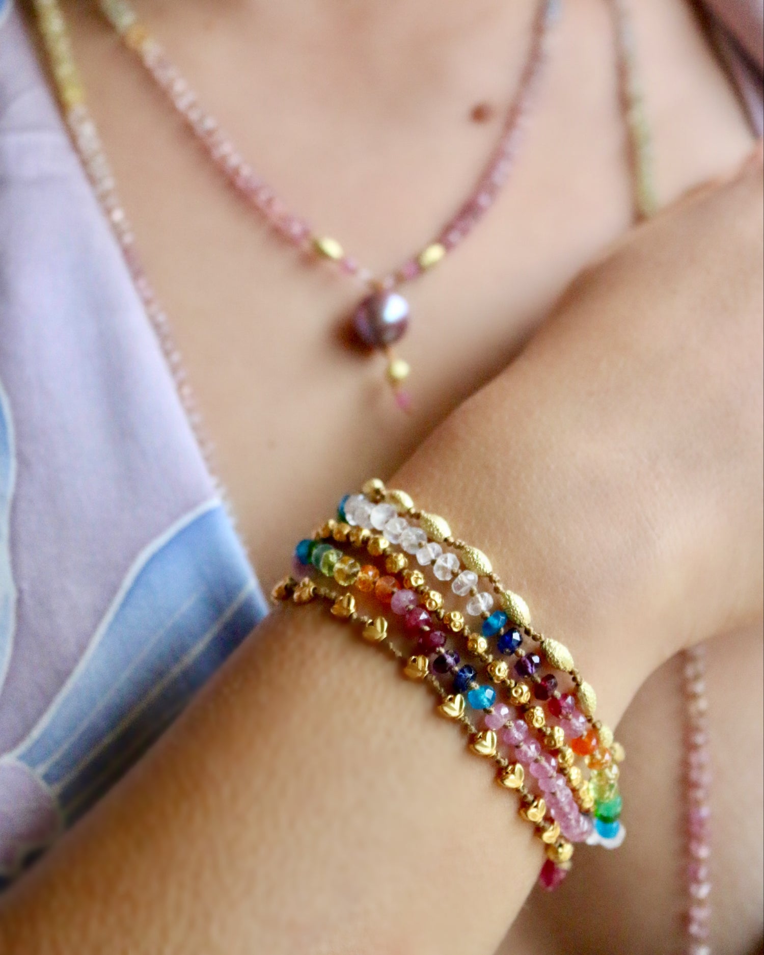 The hands are an extension of the heart, and as such, the wrists are a link between our passions and their expressions. As one of the most delicate joints in the body, they are responsible for movement, flexibility, dexterity, ease and skill. Celebrate, nourish, and embolden their expressions adorned in prismatic minerals that so eloquently highlight the finesse of love in action. Like all of Amalia’s pieces, our rainbow bracelets feature detailed knotting, precious gemstones, and a dash of uplifting rainbow magic. They also accent our other collections beautifully.