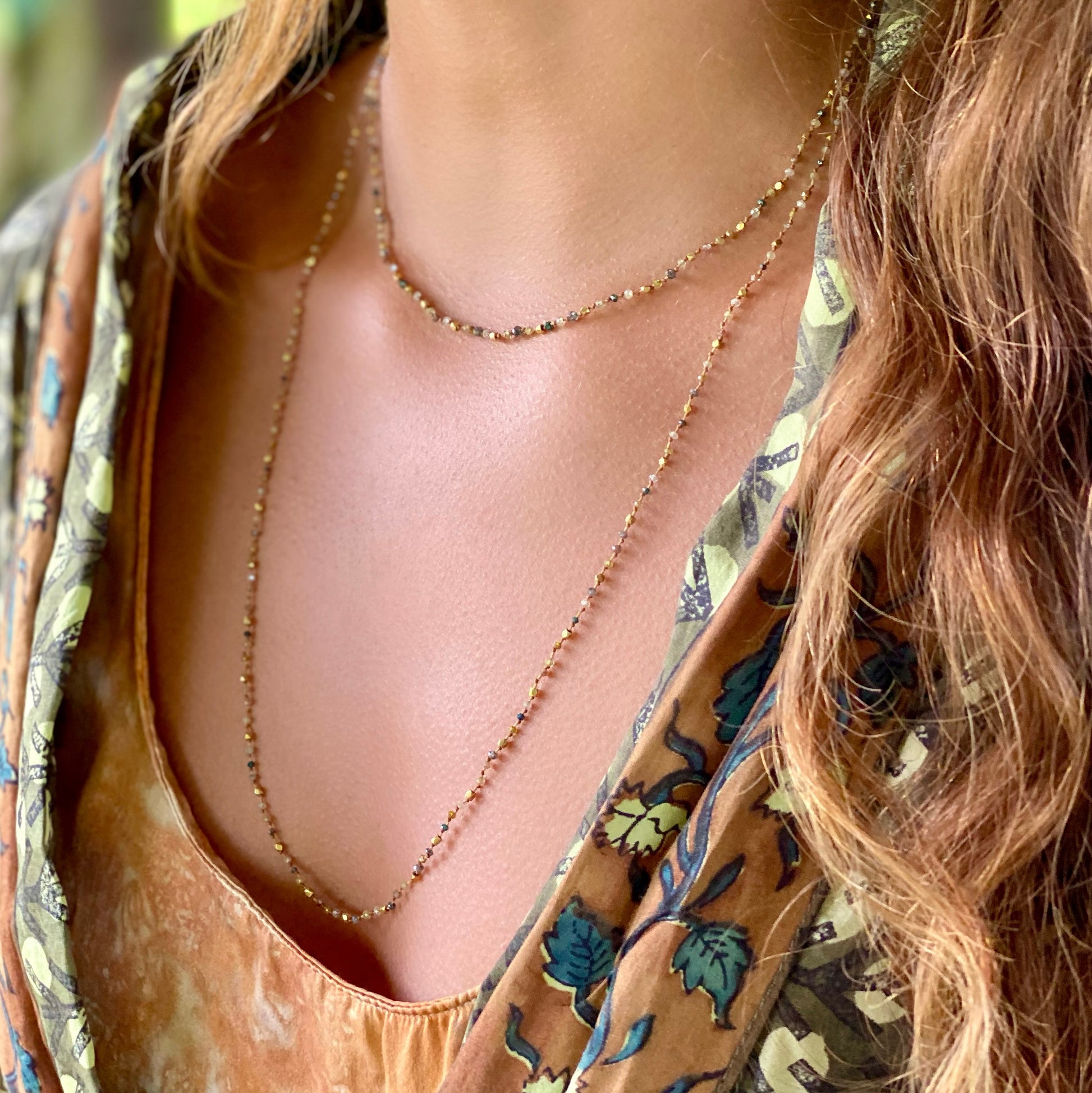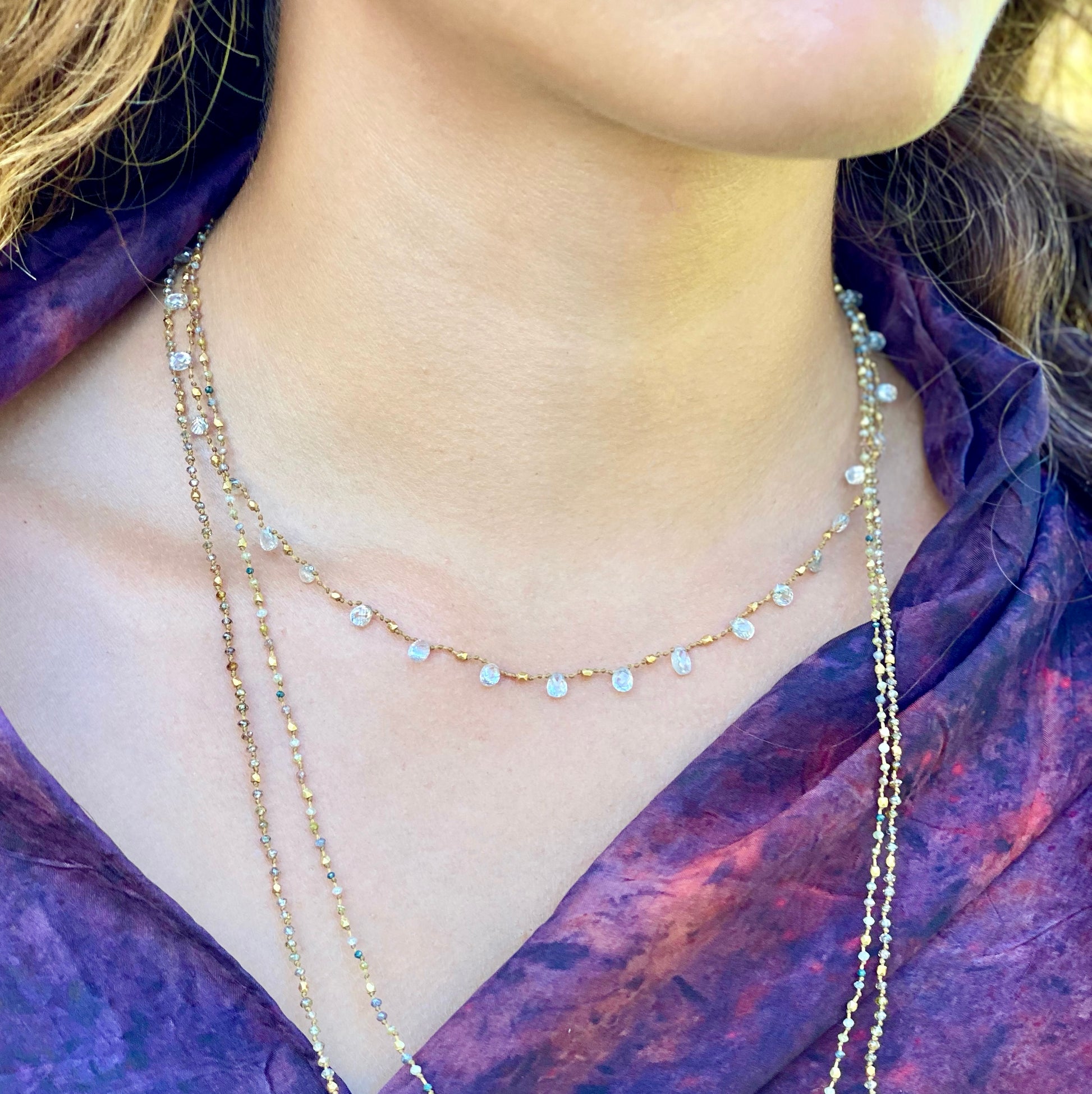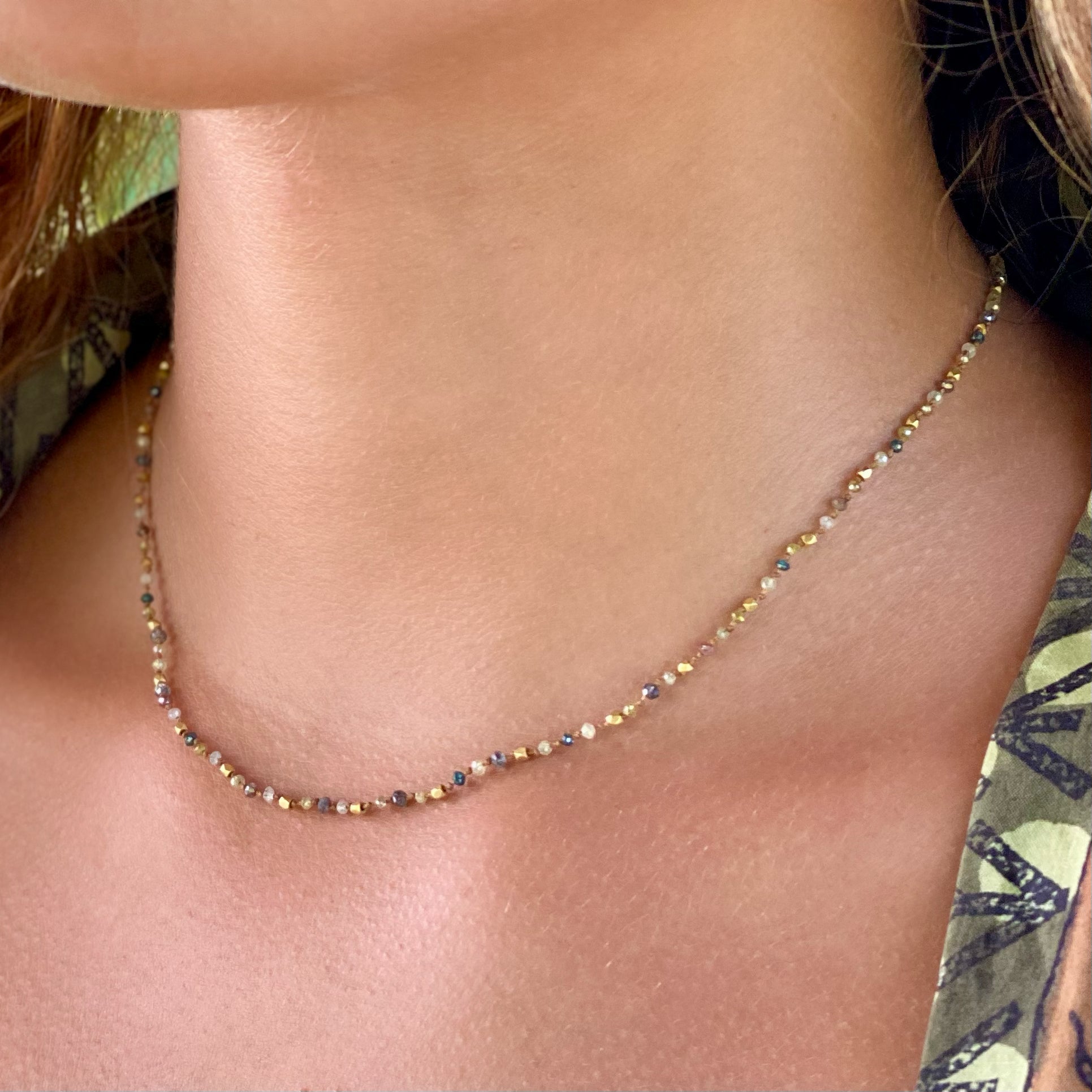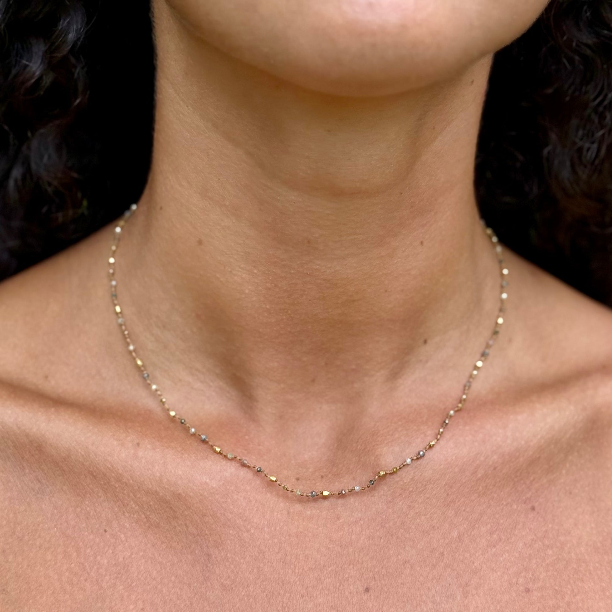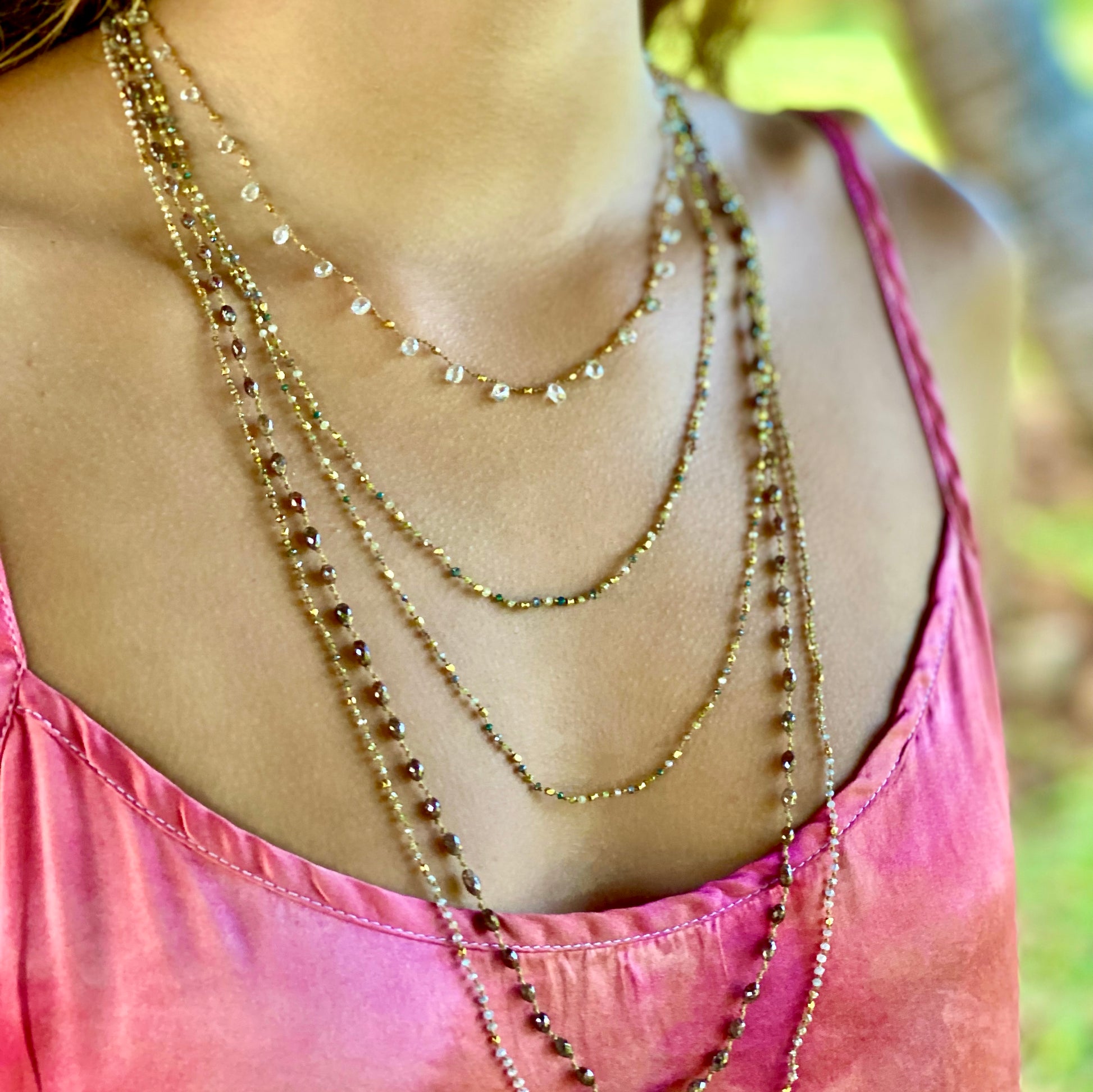 Dazzling and delicate Multi-color Diamond gradient including naturally occurring silver, yellow, green, teal, and chocolate Diamonds with tiny handmade solid 18k gold beads.
