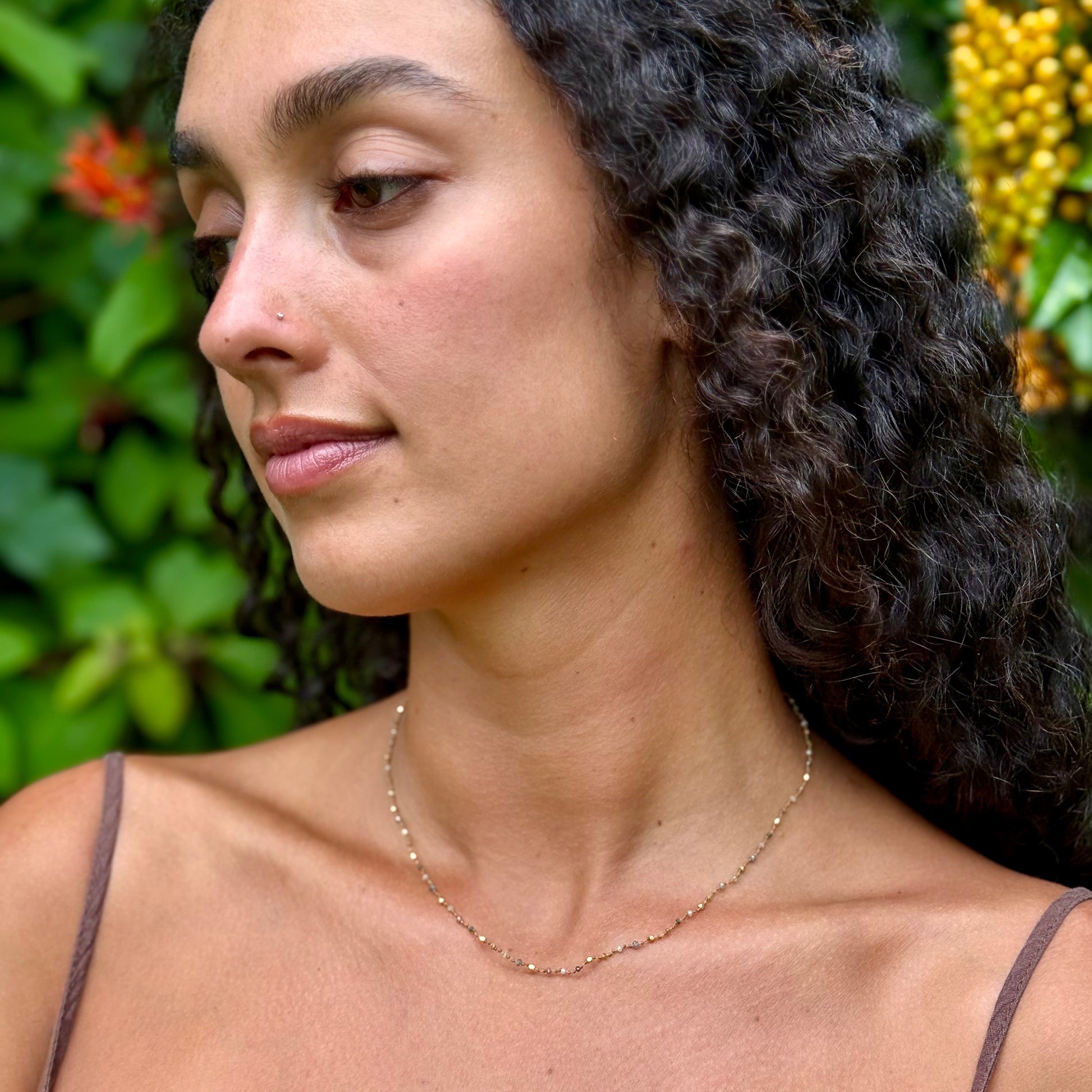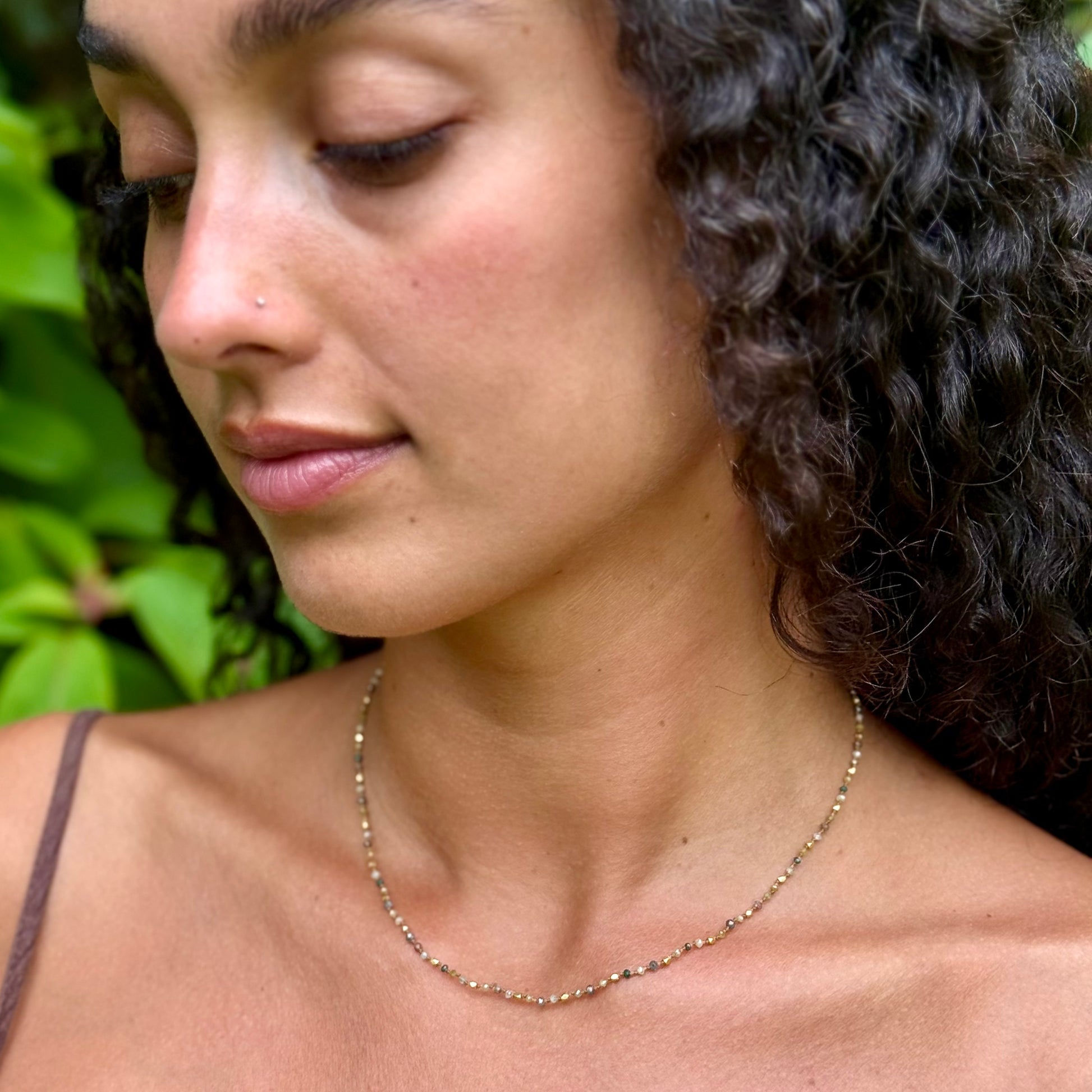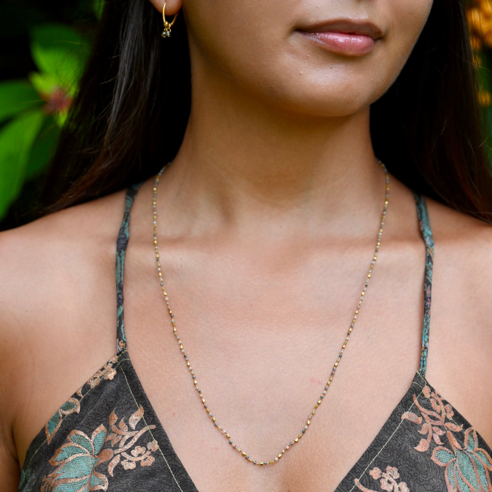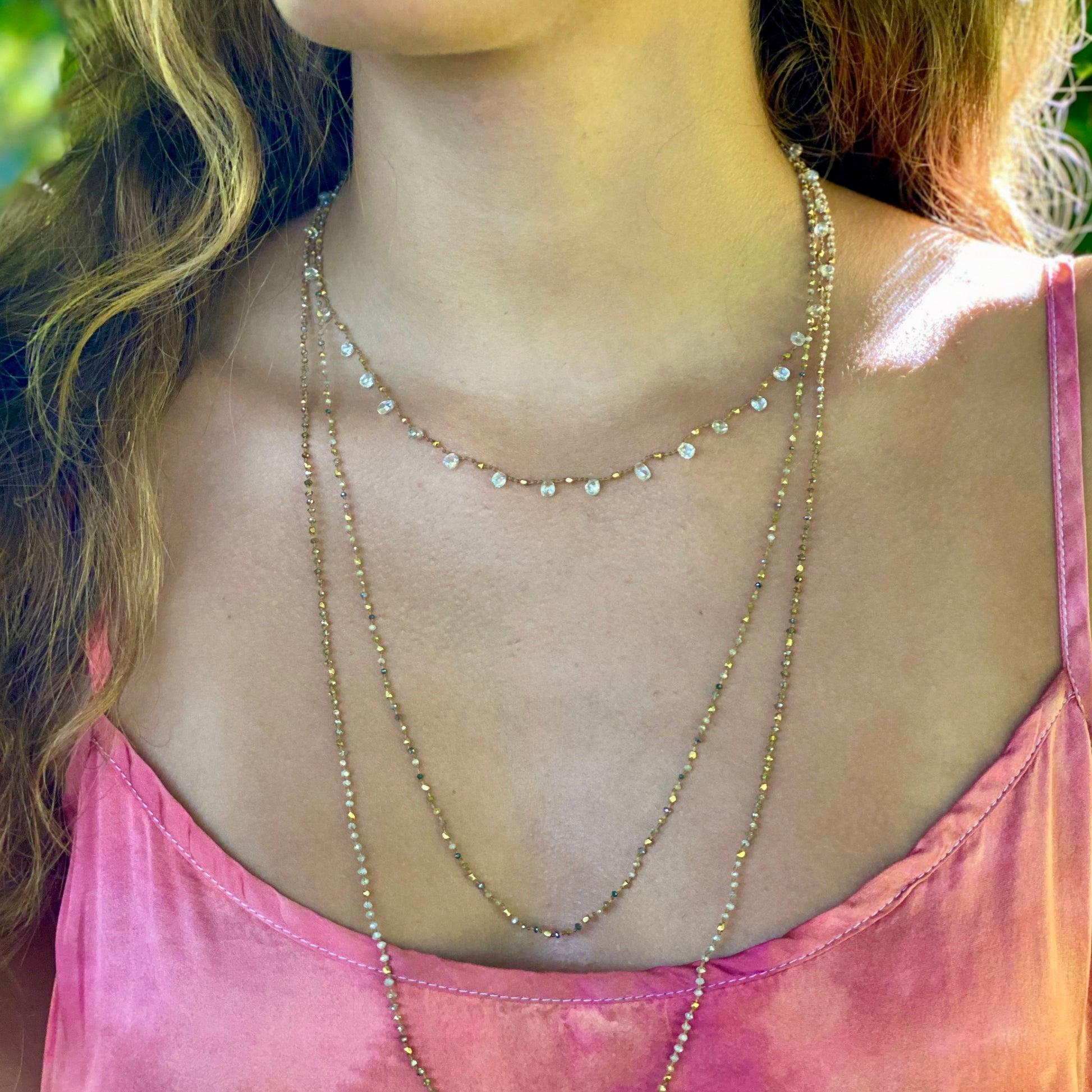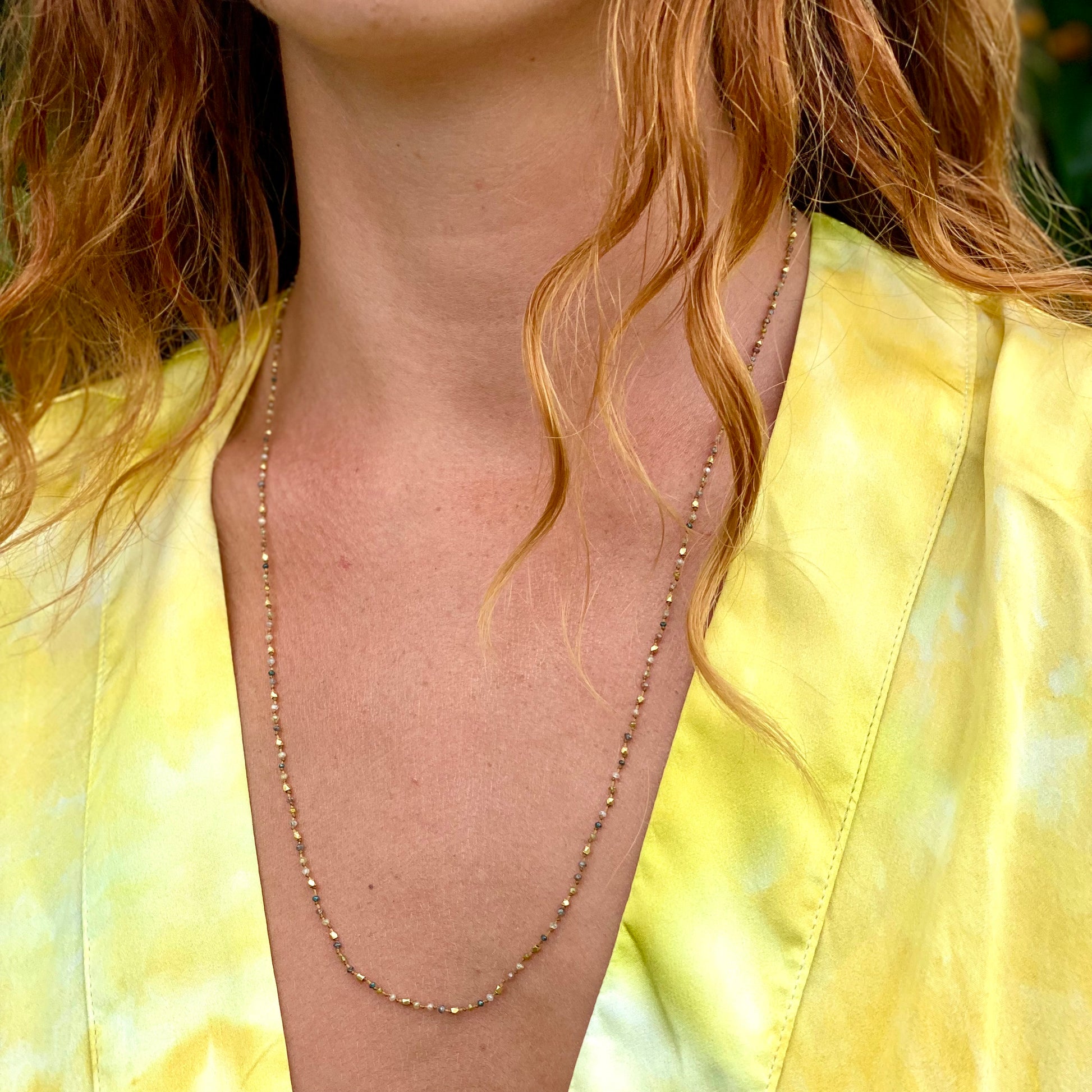 Dazzling and delicate Multi-color Diamond gradient including naturally occurring silver, yellow, green, teal, and chocolate Diamonds with tiny handmade solid 18k gold beads.