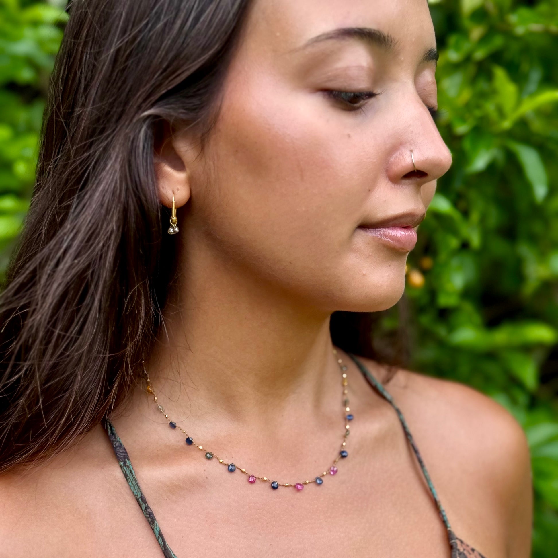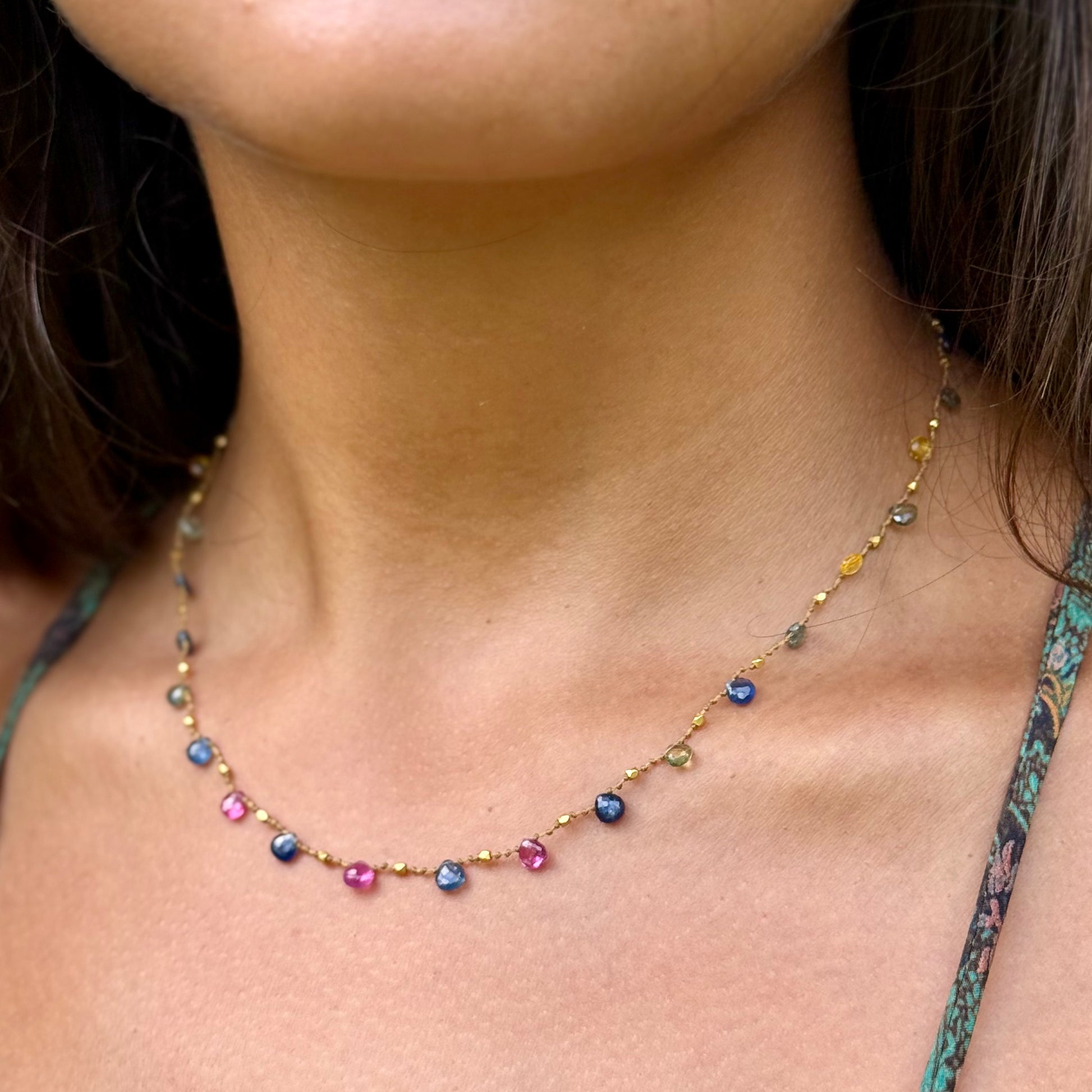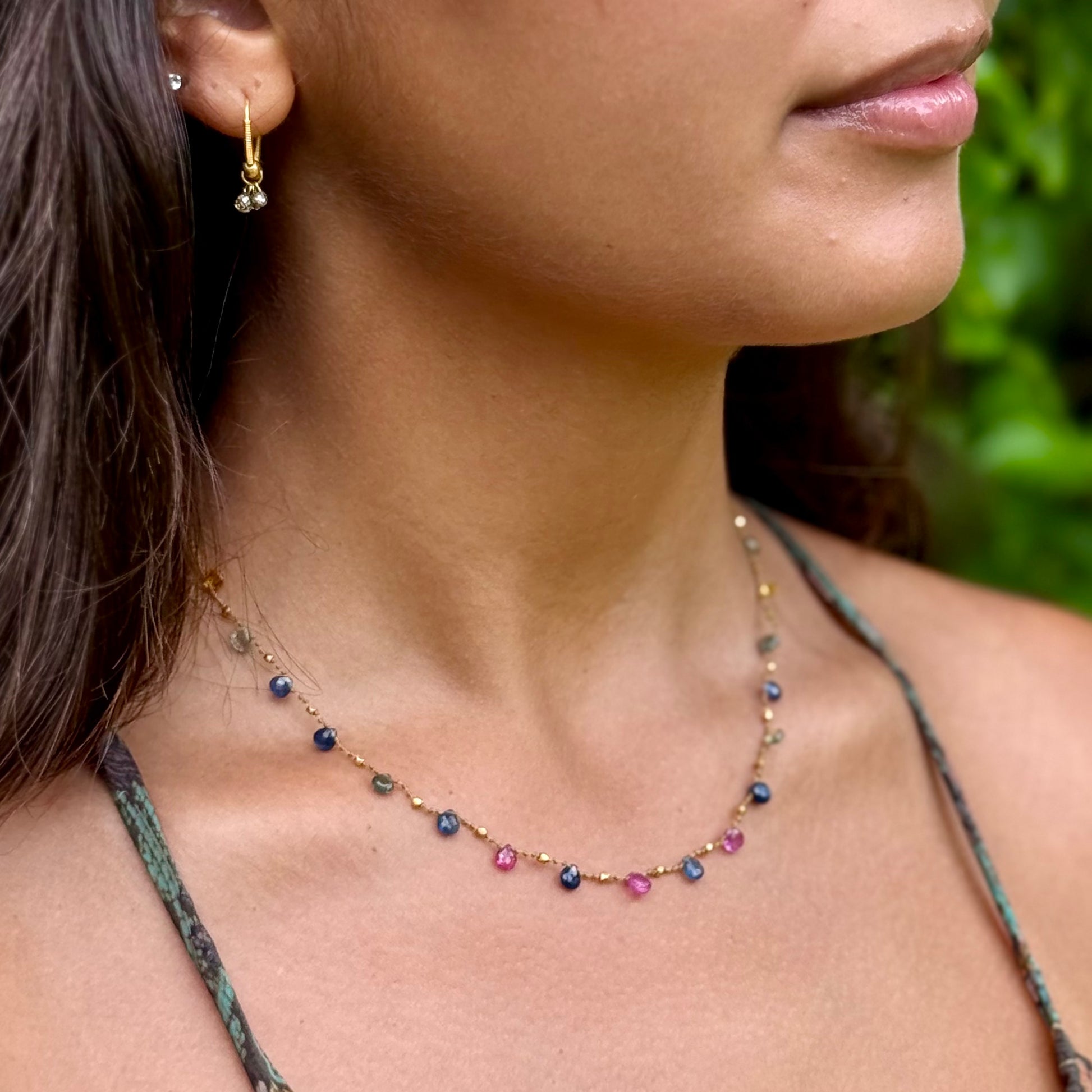 Twilight-hued Sapphire drops delicately spaced with handmade solid 18k gold beads. Each precious stone whispers its own note in a harmonious flow of color and light, a statement of elegance and timeless grace.