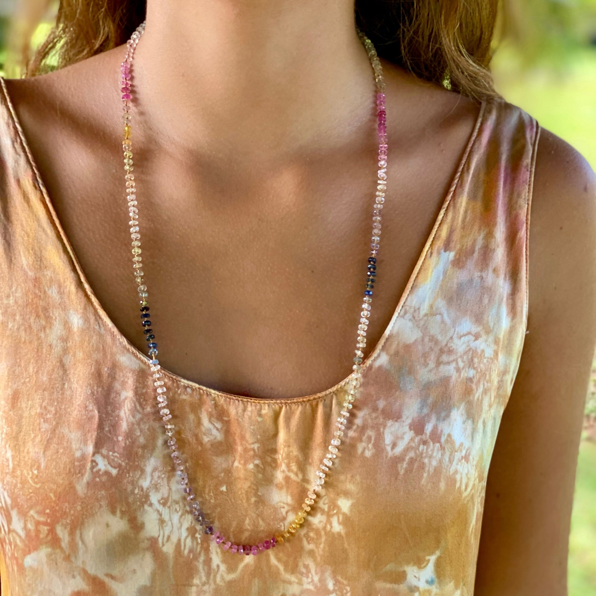 Powerful and playful, this full spectrum of vibrant sapphires shine in tandem and derive their colors by varying degrees of mineral presence. This rainbow partnership may be useful in aligning chakras and balancing our unique elemental constitutions. All sapphires are considered precious stones and are a powerful amulet for those on a spiritual path seeking to connect with the energy of purpose and prayer. Stones of calm authority and decisive action rooted in truth, wisdom, and integrity, sapphires uplift and protect the noble-hearted.