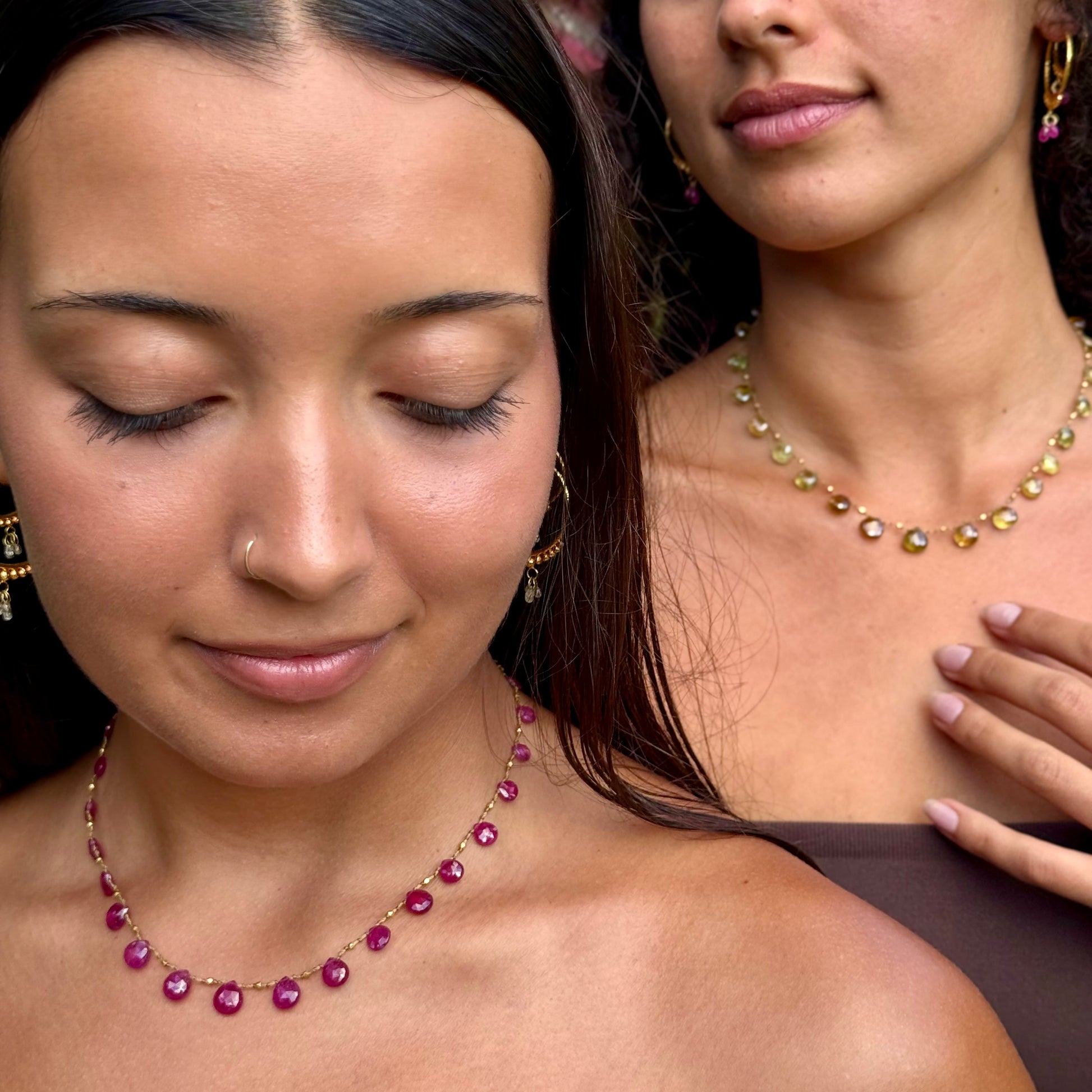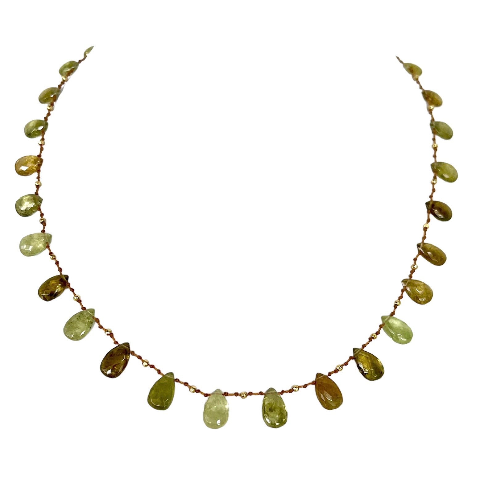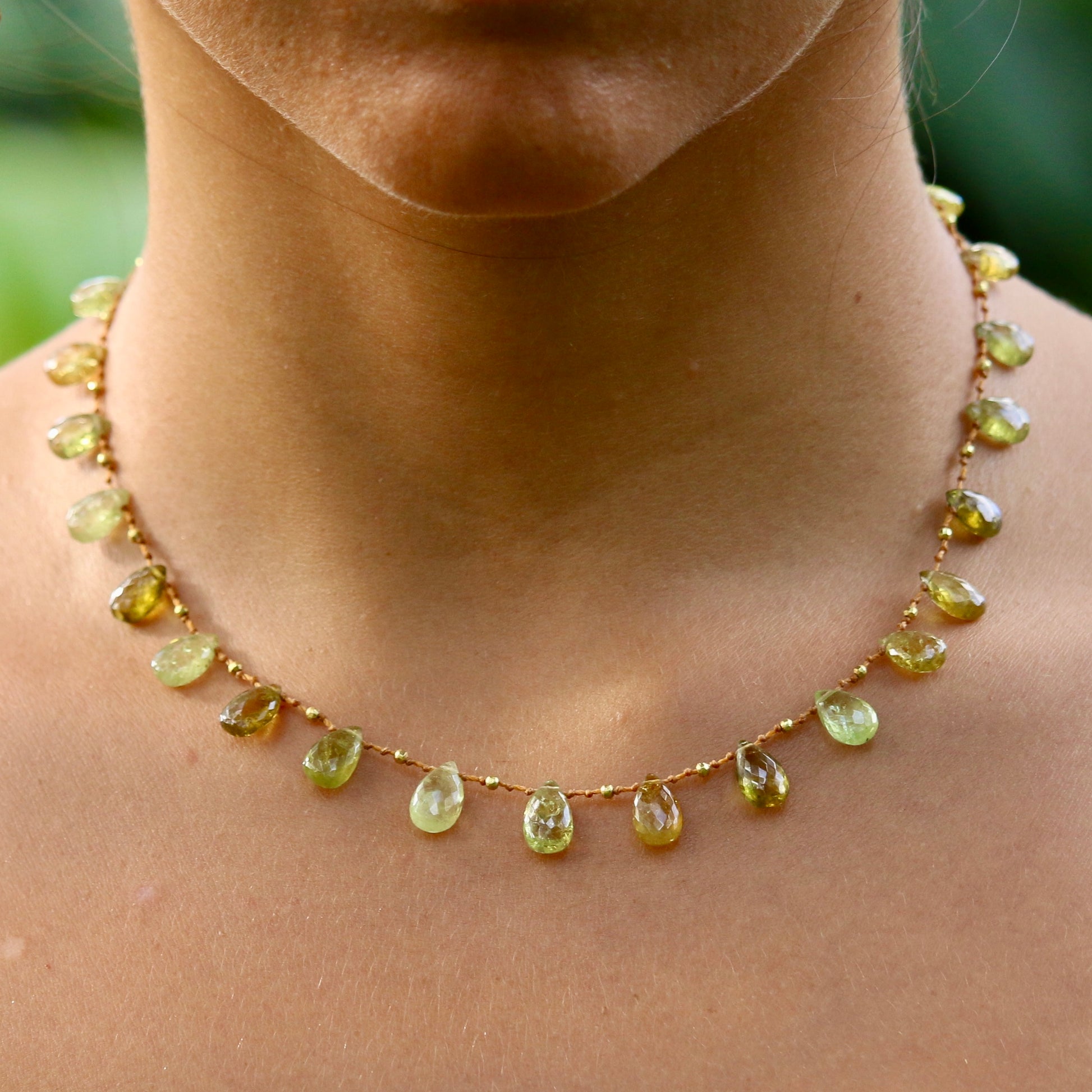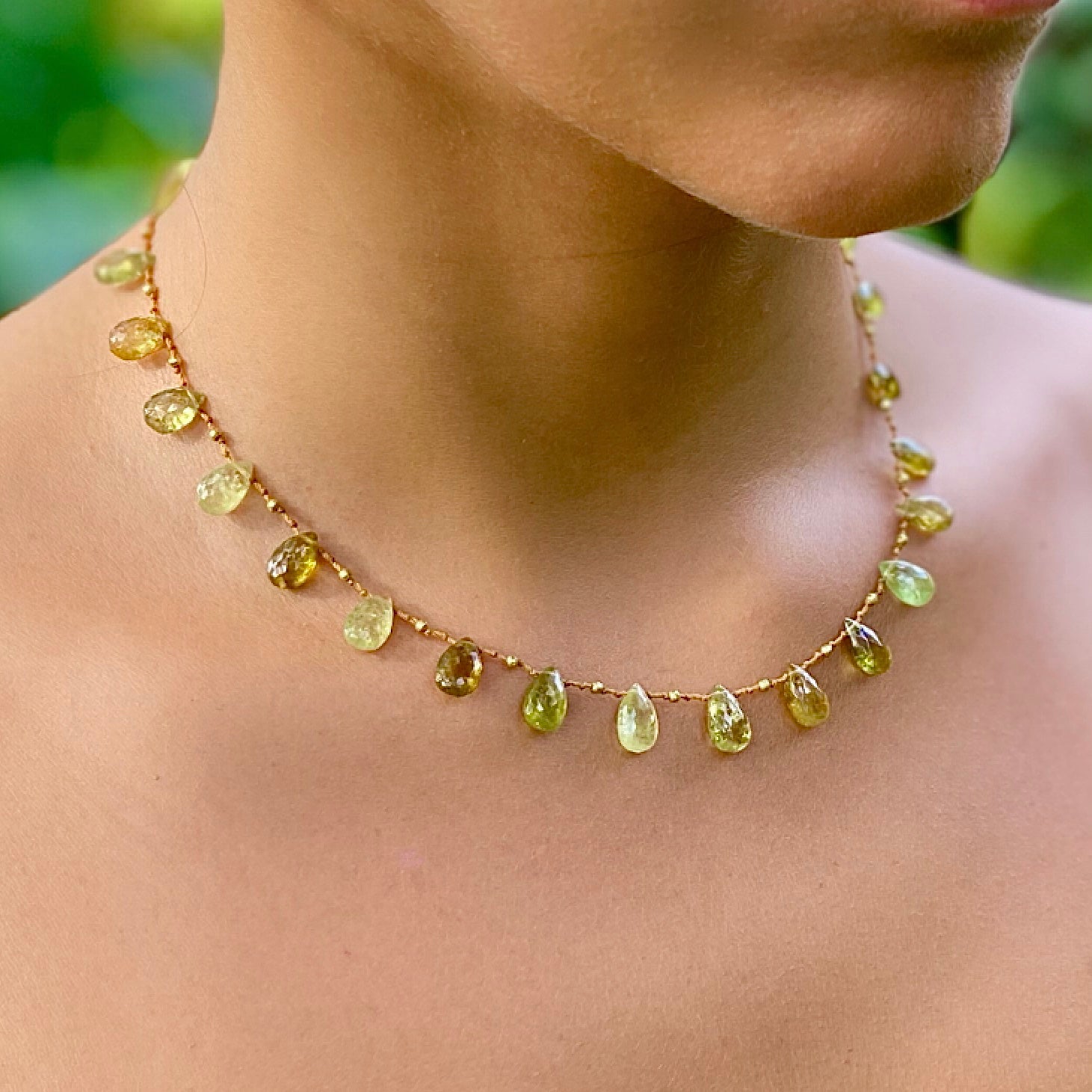 Shades of Green Garnet delicately spaced with handmade solid 18k gold beads