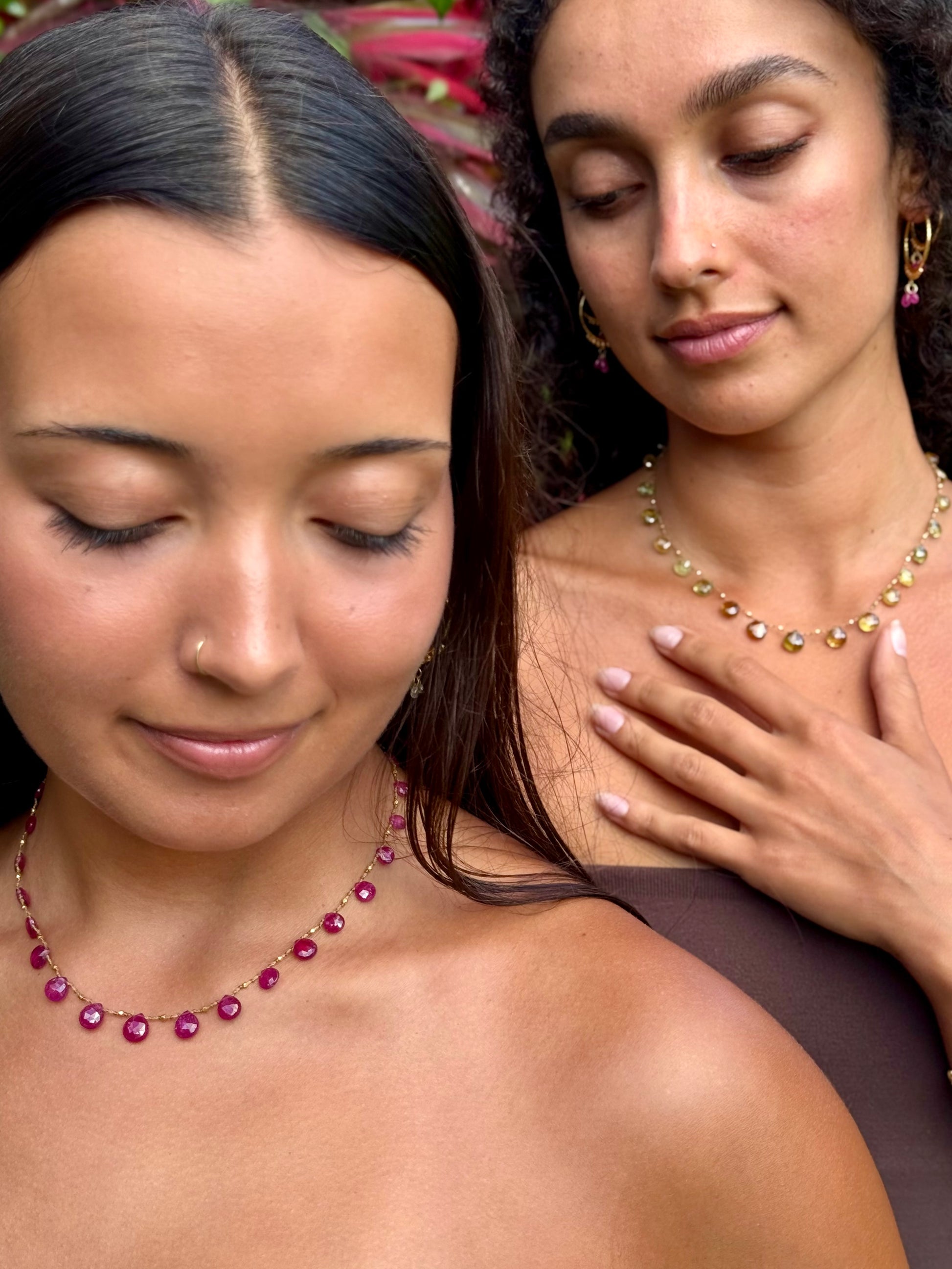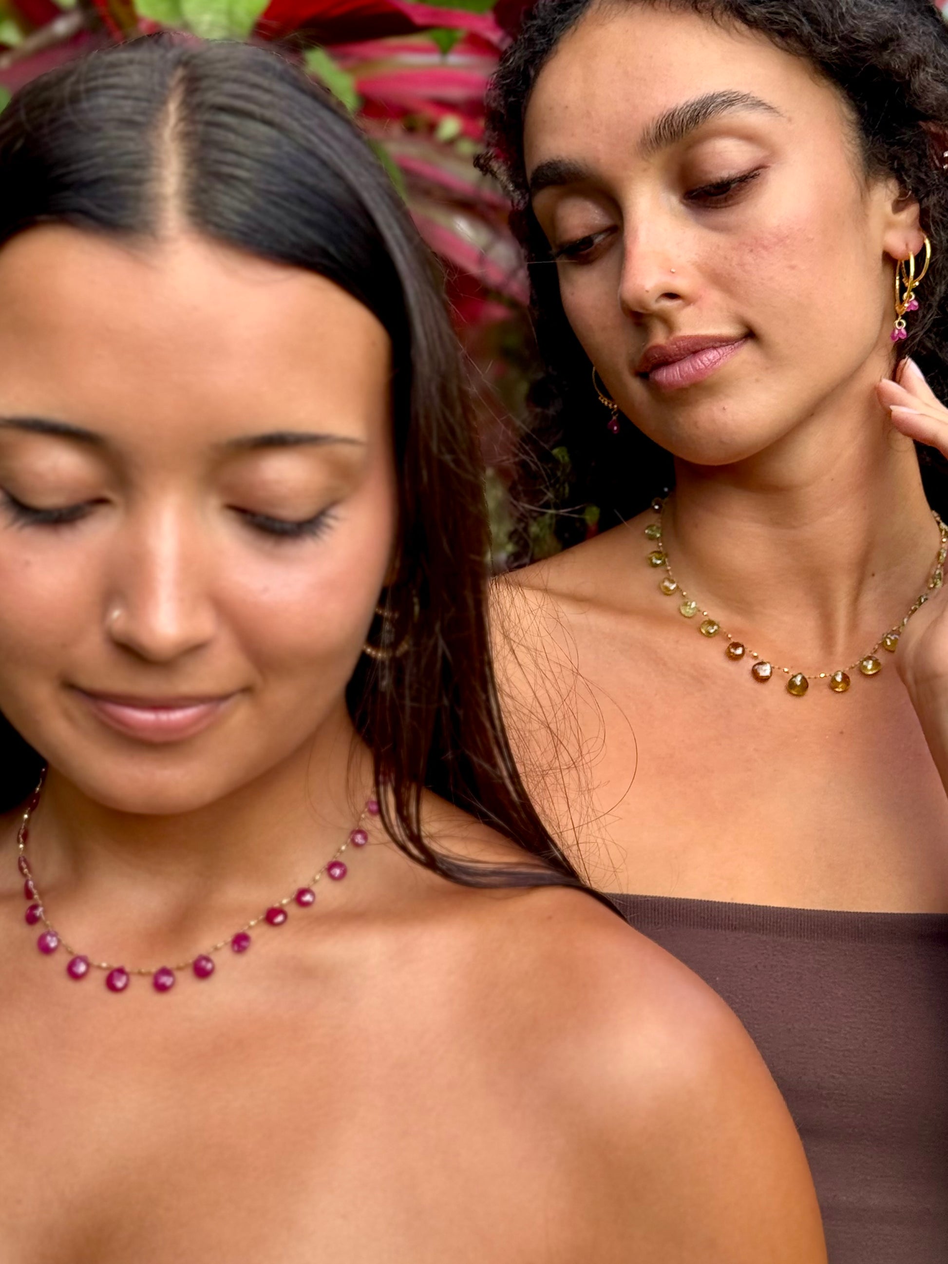 I decided to expand my collection and delve deeper into the Ali'i series. I chose five different gemstones for Ali'i necklaces, each representing one of the five elements. For the element of Metal/White, I have selected Moonstone. Emerald, a beautiful green gemstone, represents the element of Wood. To embody the element of Water/Blue, I have chosen Aquamarine and Blue Sapphire. For Fire/Red, I have opted for Pink Sapphire (or Ruby). To symbolize the element of Earth/Yellow, I have selected Pomegranate Gems and Citrine. These gemstones possess vibrant colors and distinct energies that bring a sense of balance and harmony to my personal practice. I LOVE all of my Ali'i necklaces.