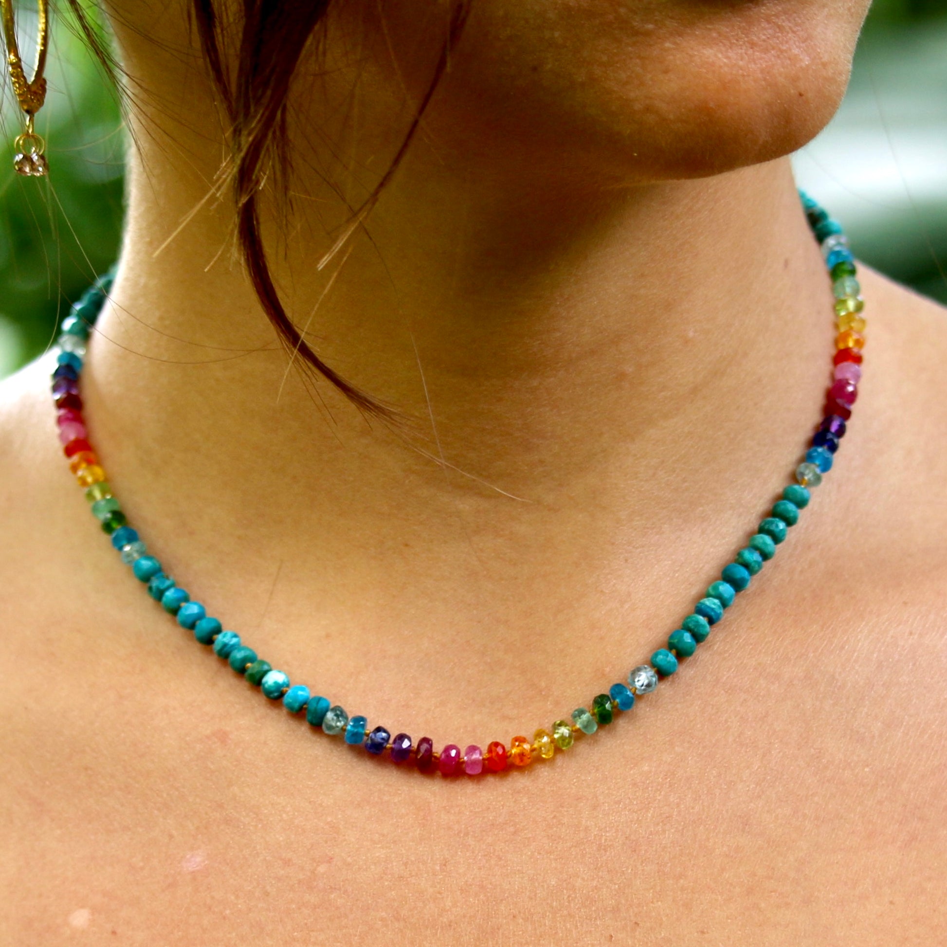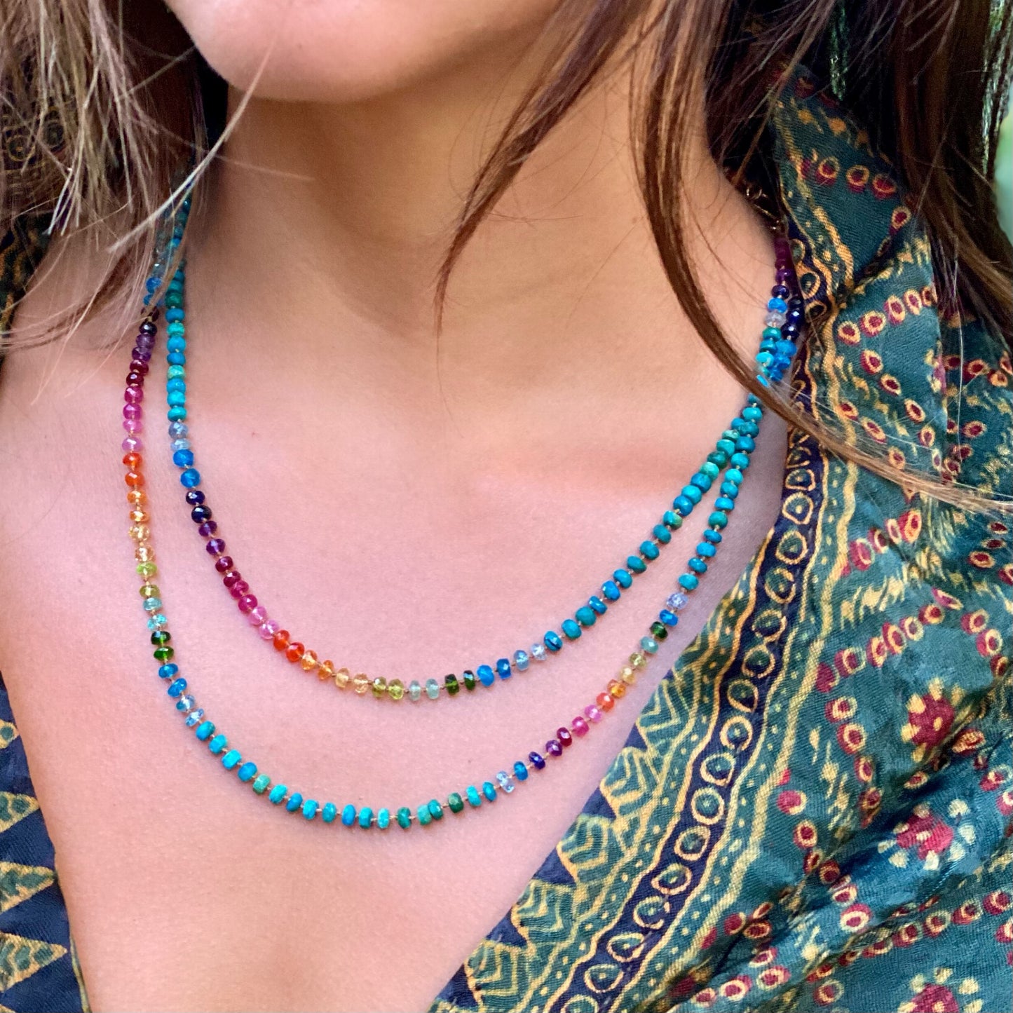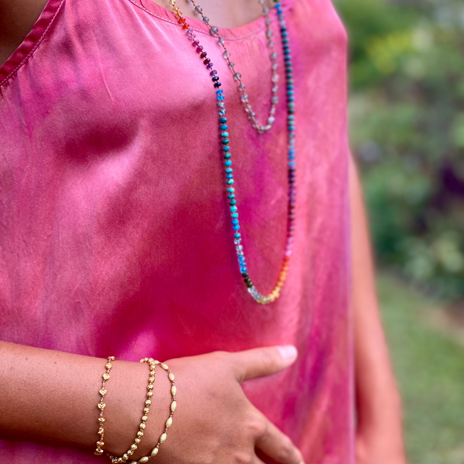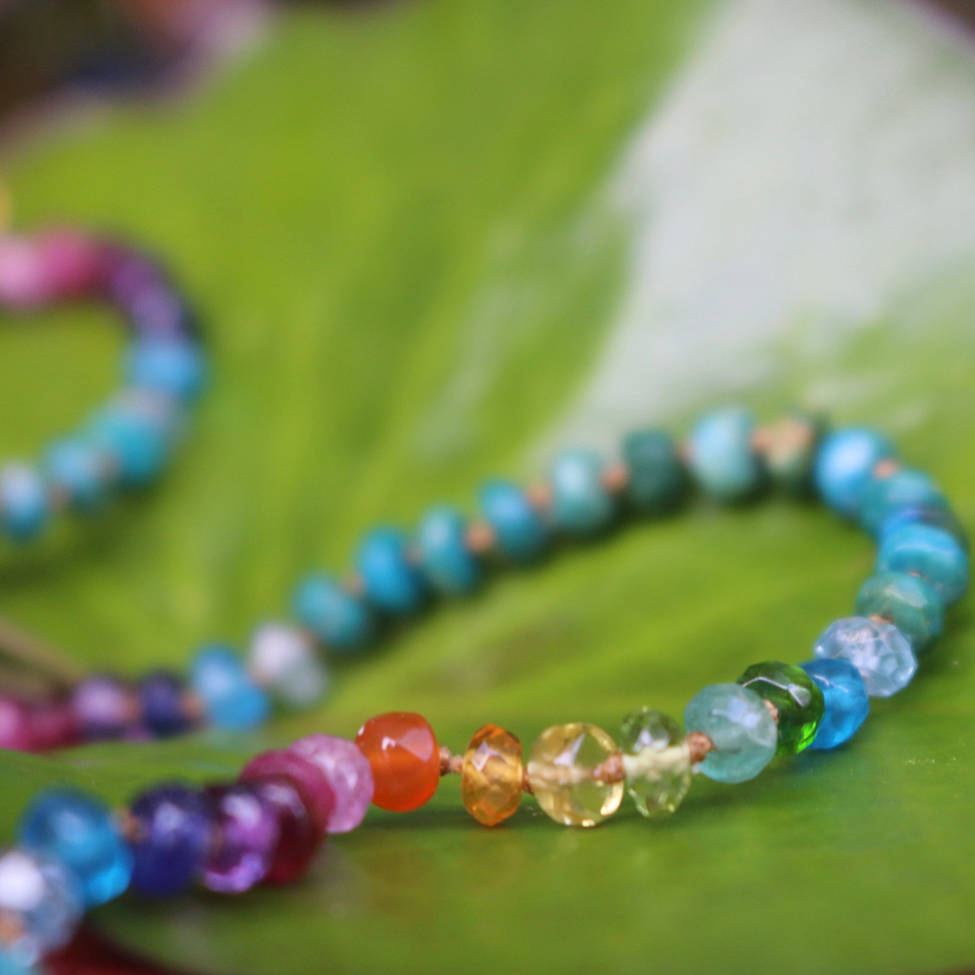 You can layer Rainbow Leis with with both our Alohi or Rainbow Drop collections. They are also a lovely compliment to our Rainbow Mana pieces and can be worn to bring forth dynamic color contrast or chosen mineral emphasis.