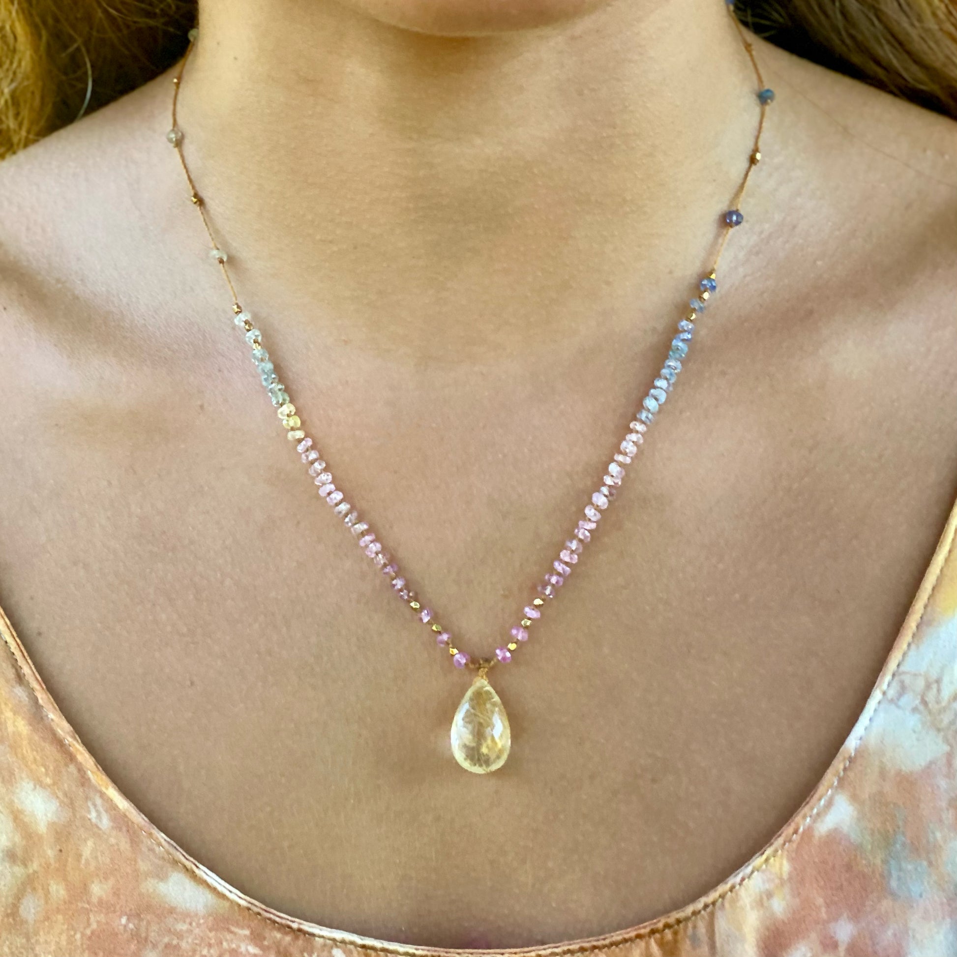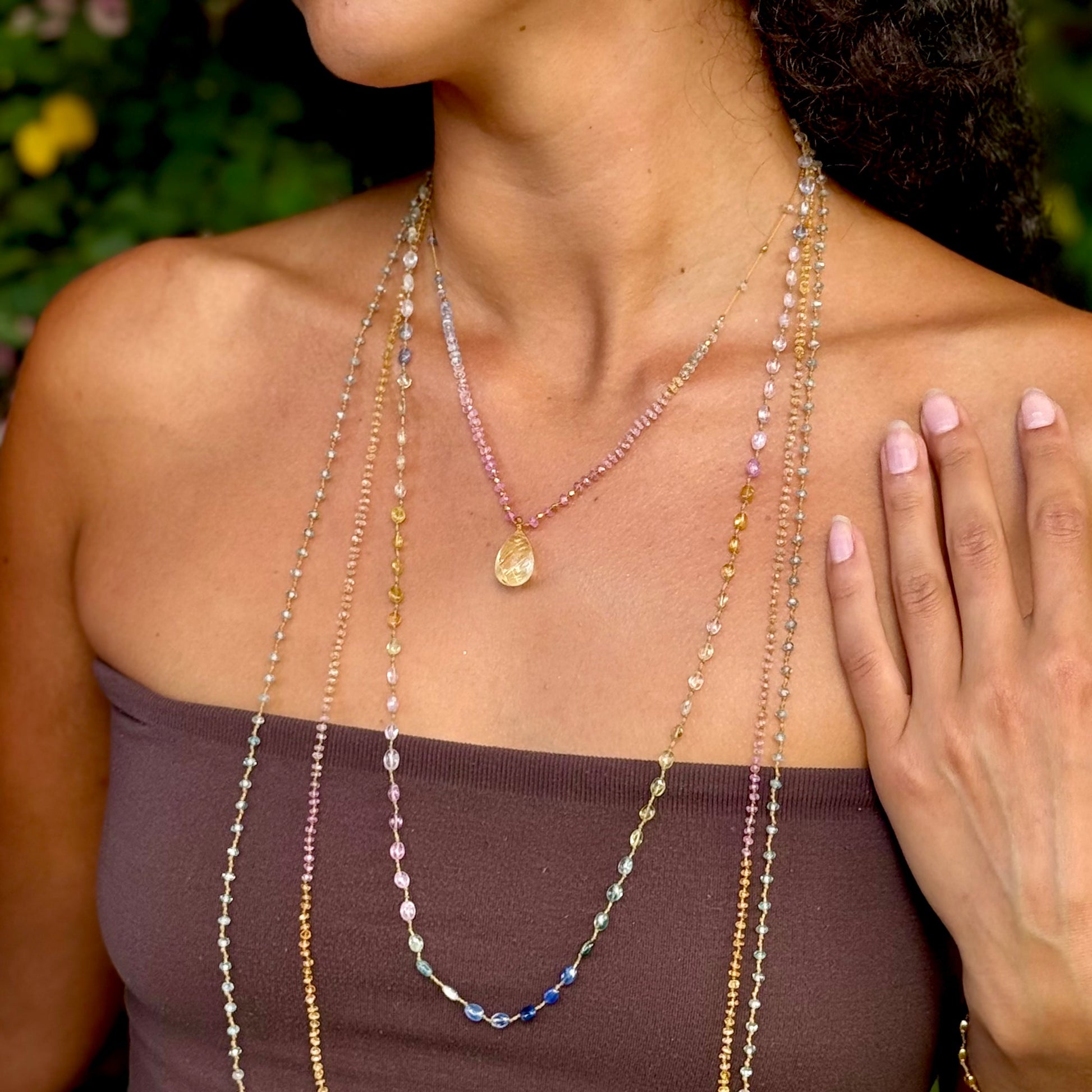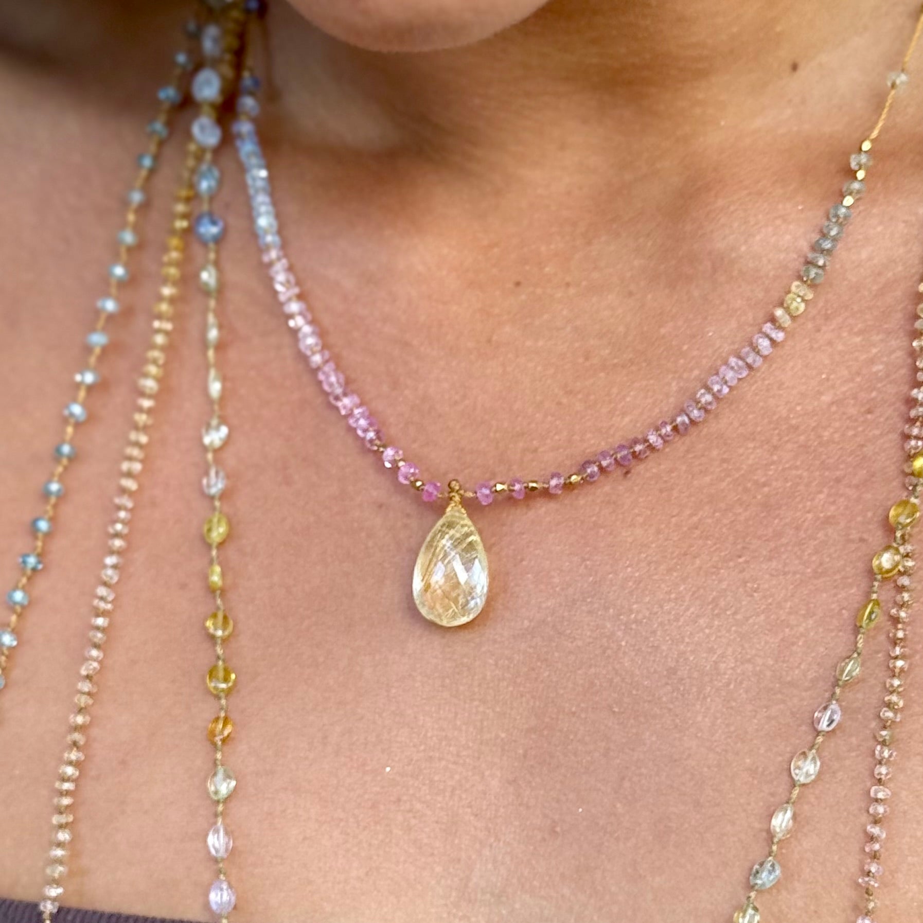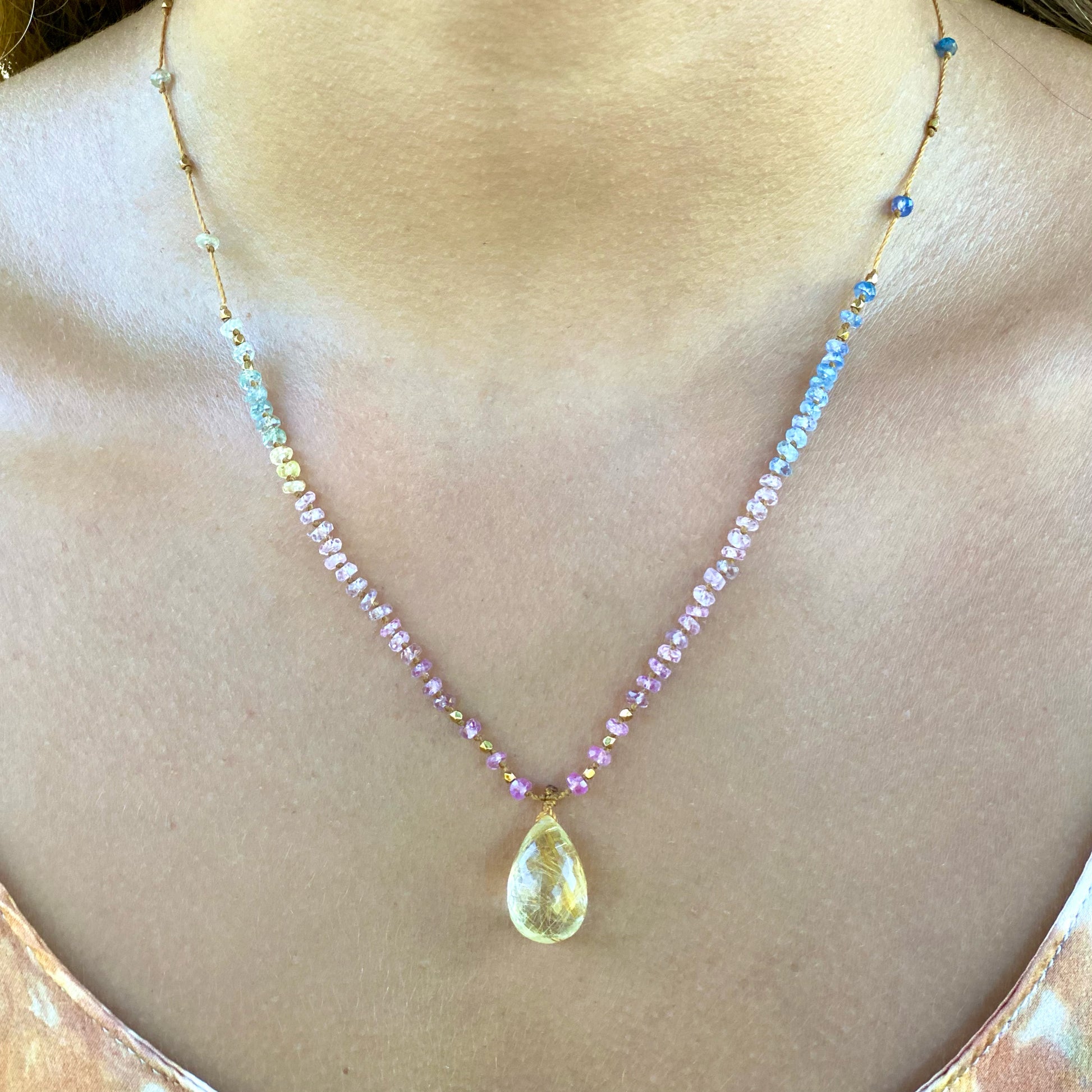 Part of our divinely inspired Pastel Sapphire collection this piece features a luminous Rutilated Quartz with a pastel gradation of Sapphires and handmade solid 18k gold beads.