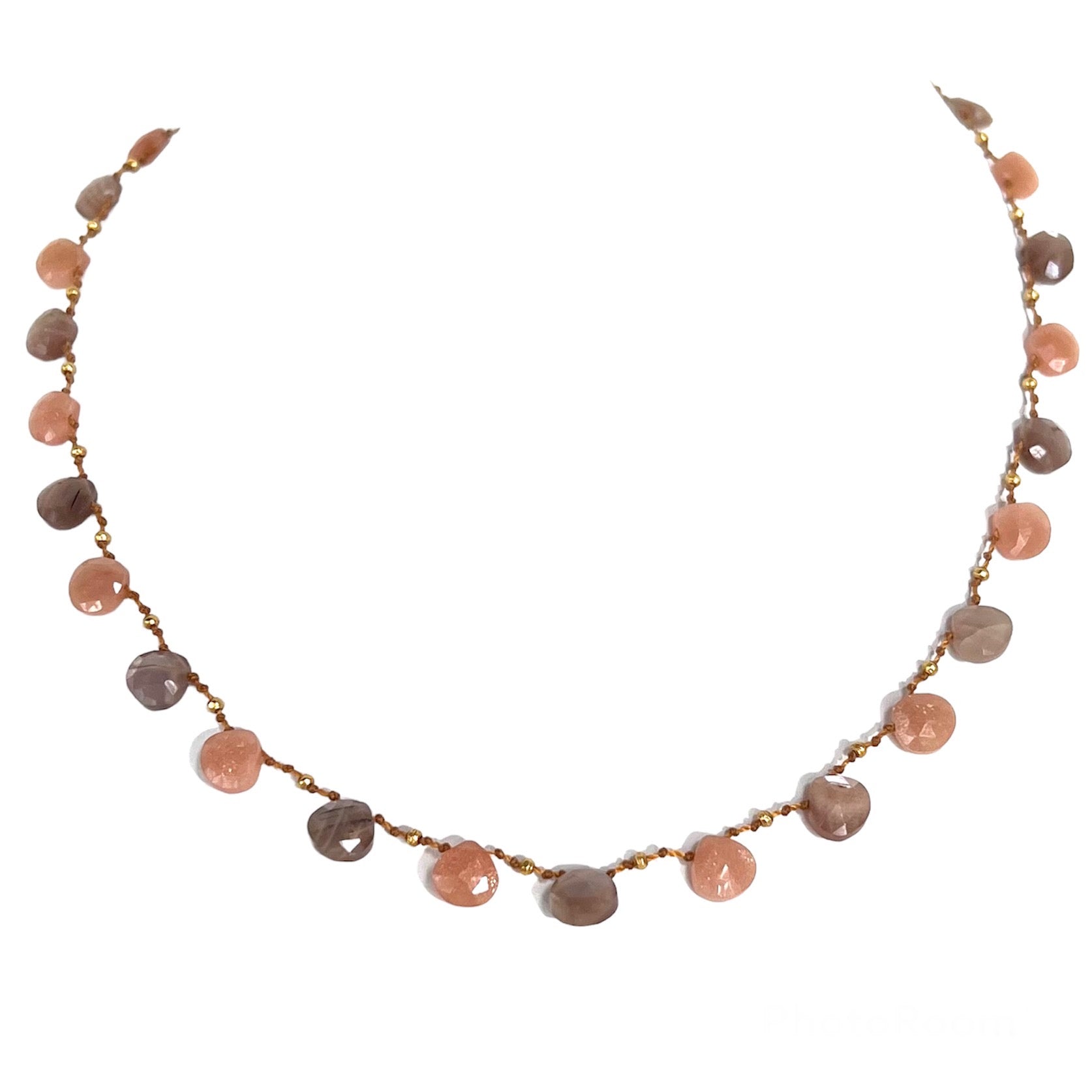 Enchanting Peach and Chocolate Moonstones delicately spaced with handmade solid 18k gold beads