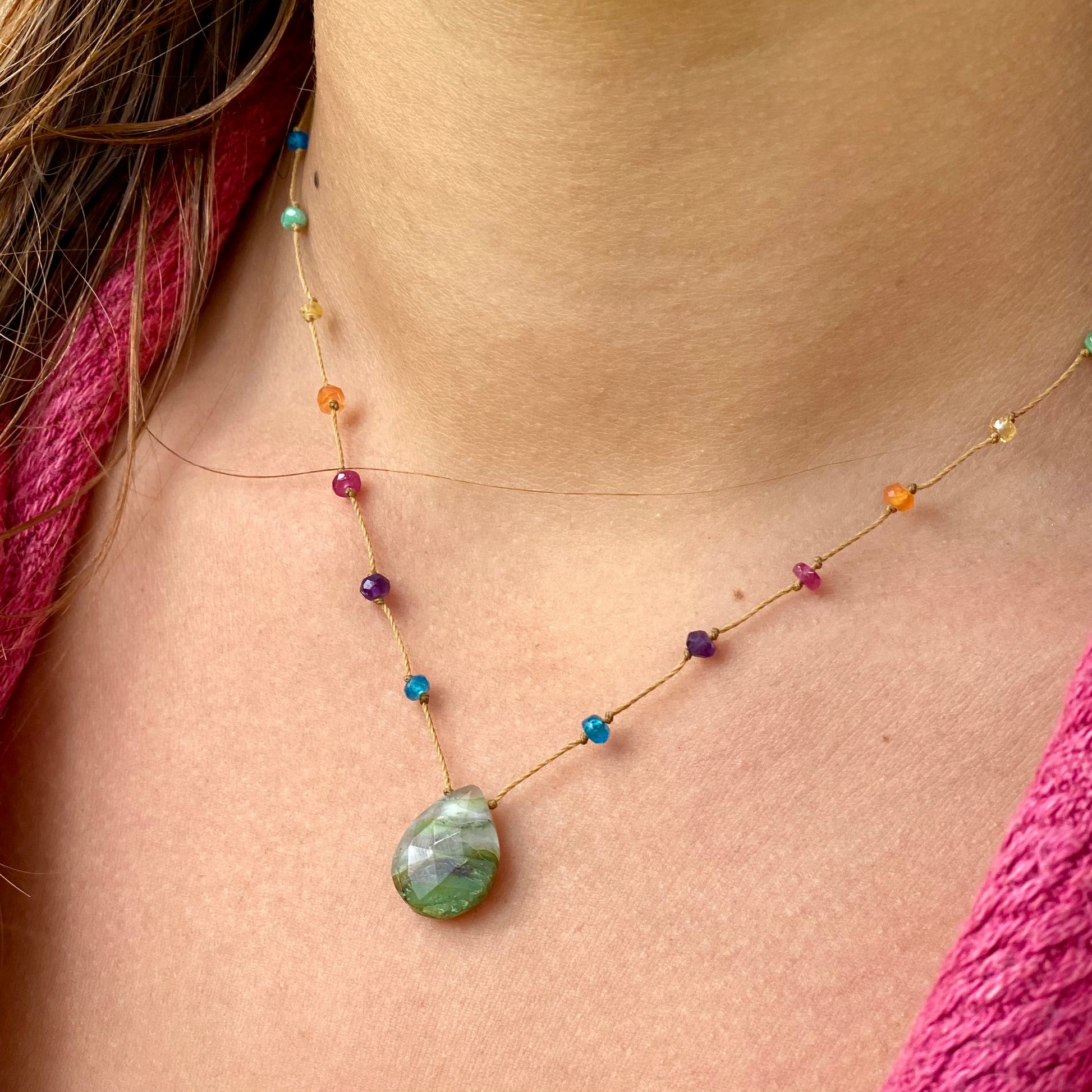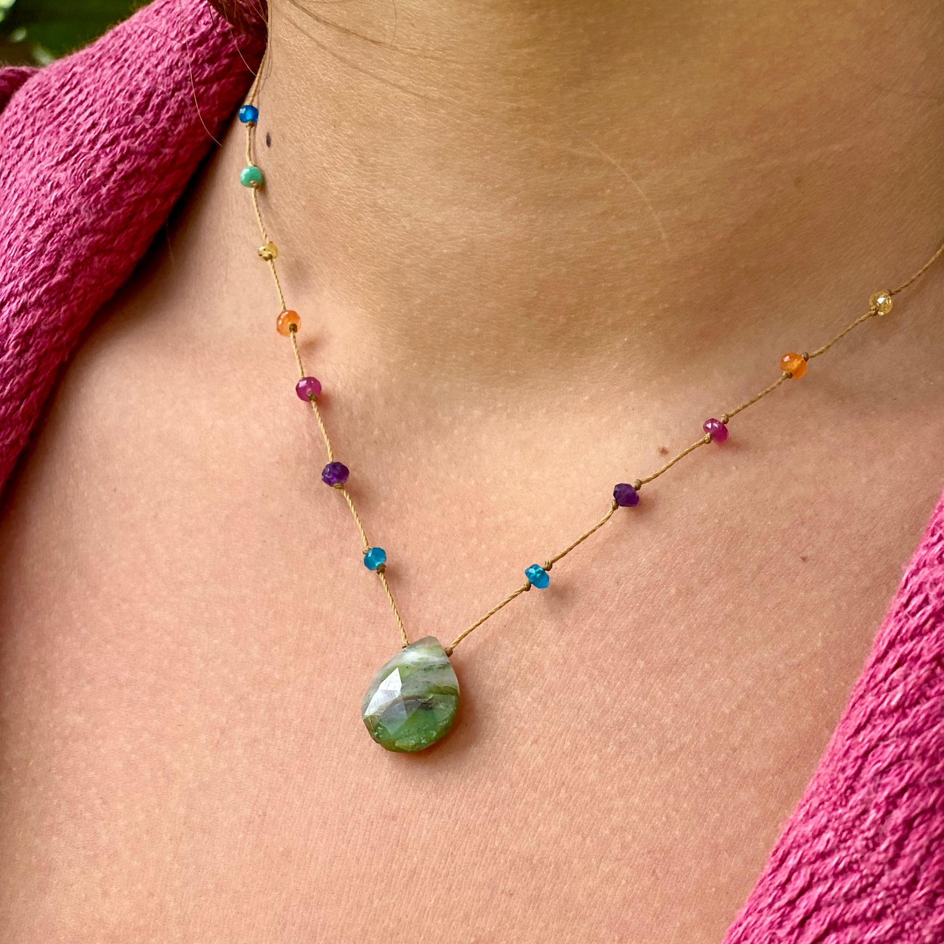 Perhaps the quintessential beginning of Rainbow Gems Kauai, our rainbow drops have been adorning people for over a decade. These delicate rainbow drops showcase the full light spectrum with carefully spaced individual gemstones, culminating in a featured crystalline drop. Just as rainbows herald new beginnings and luck these exquisite strands are the perfect place to begin your love affair with Amalia’s artwork. Many find that once they put on their rainbow drop they never take it off again, such is the nature of love. These strands are perfect for the minimalist at heart and make a striking impression stacked in a series with our other collections.