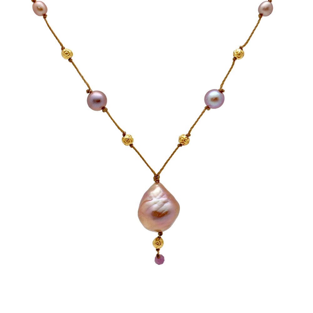 Stunning all natural Pink Edison Pearls with handmade solid 18k gold beads and pink Pearl beads.