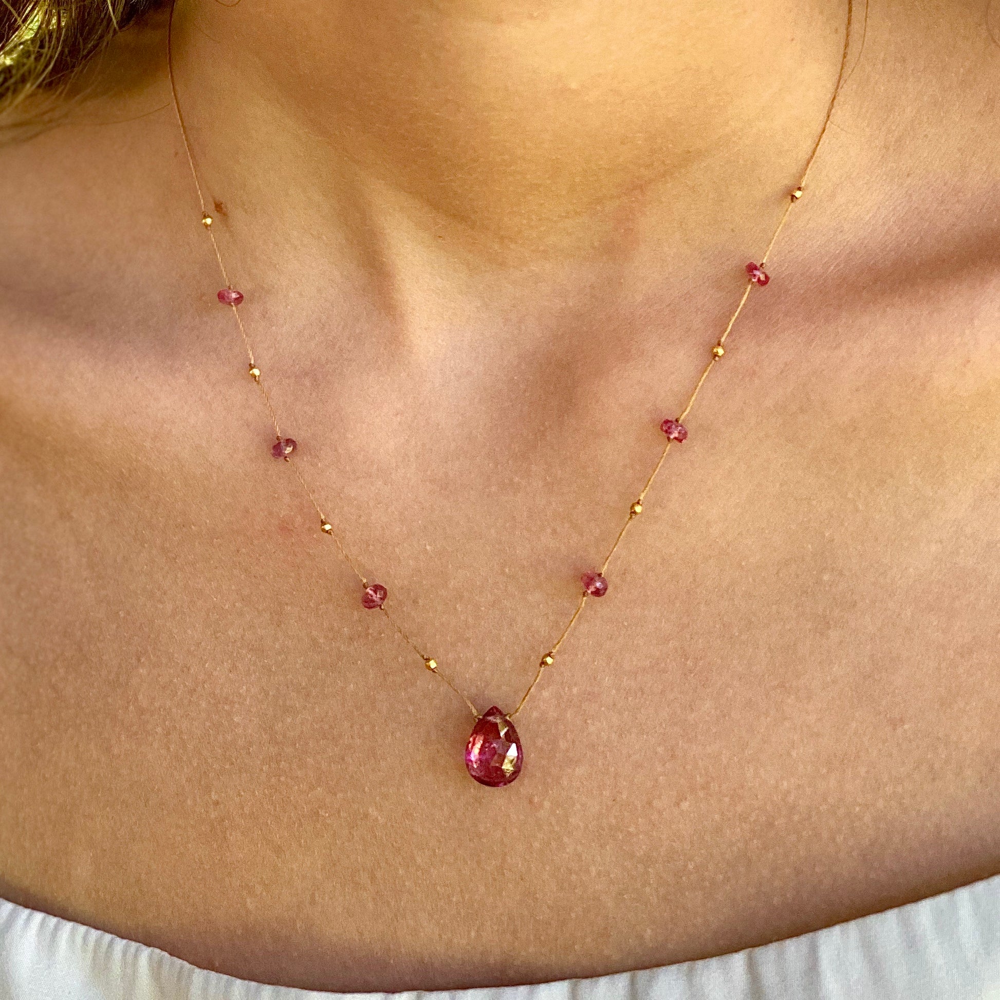 A gorgeous Pink Tourmaline drop with handmade solid 18k gold beads. A beautiful ally in protecting one's heart and supporting the flowering of self-love.