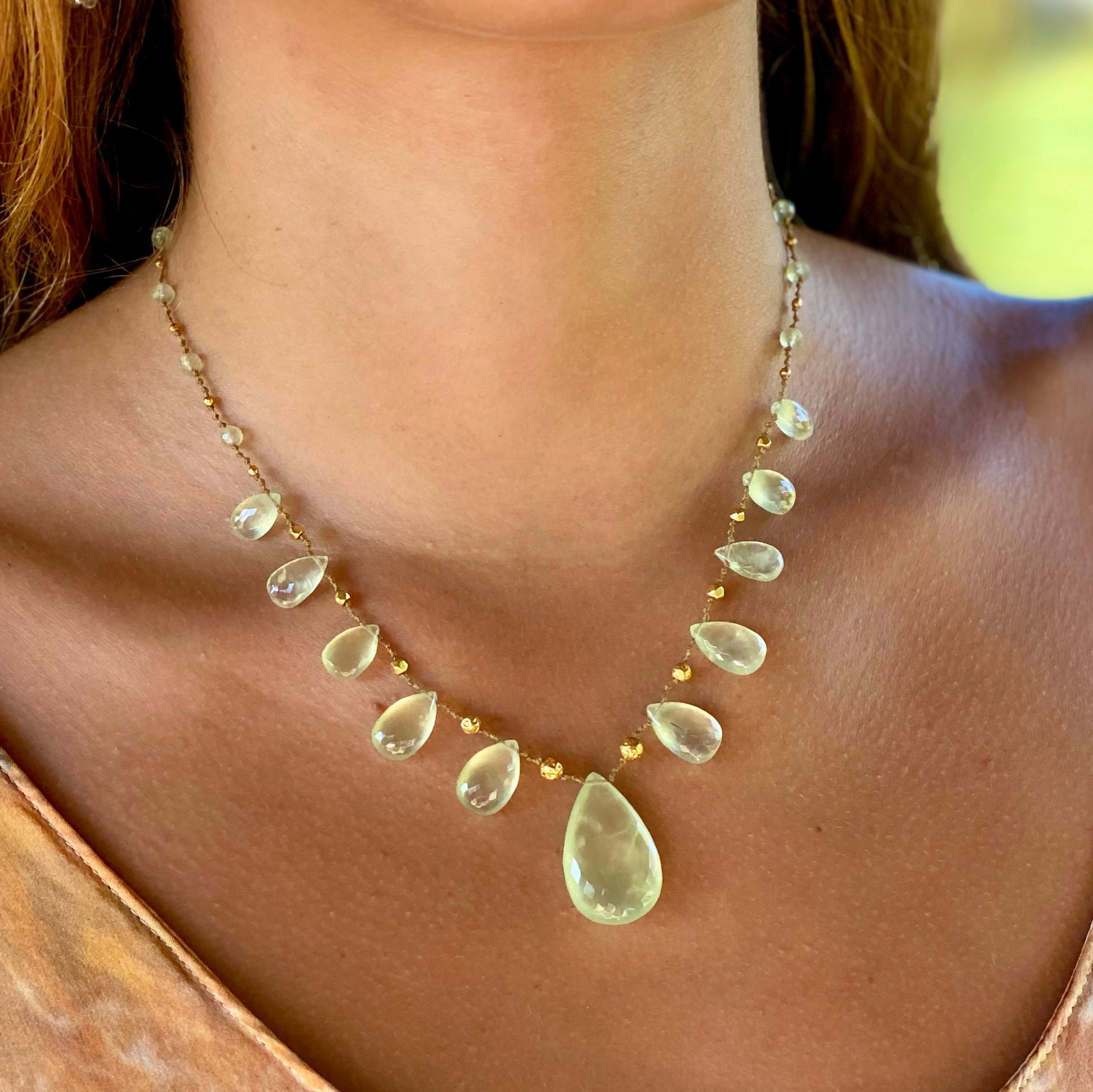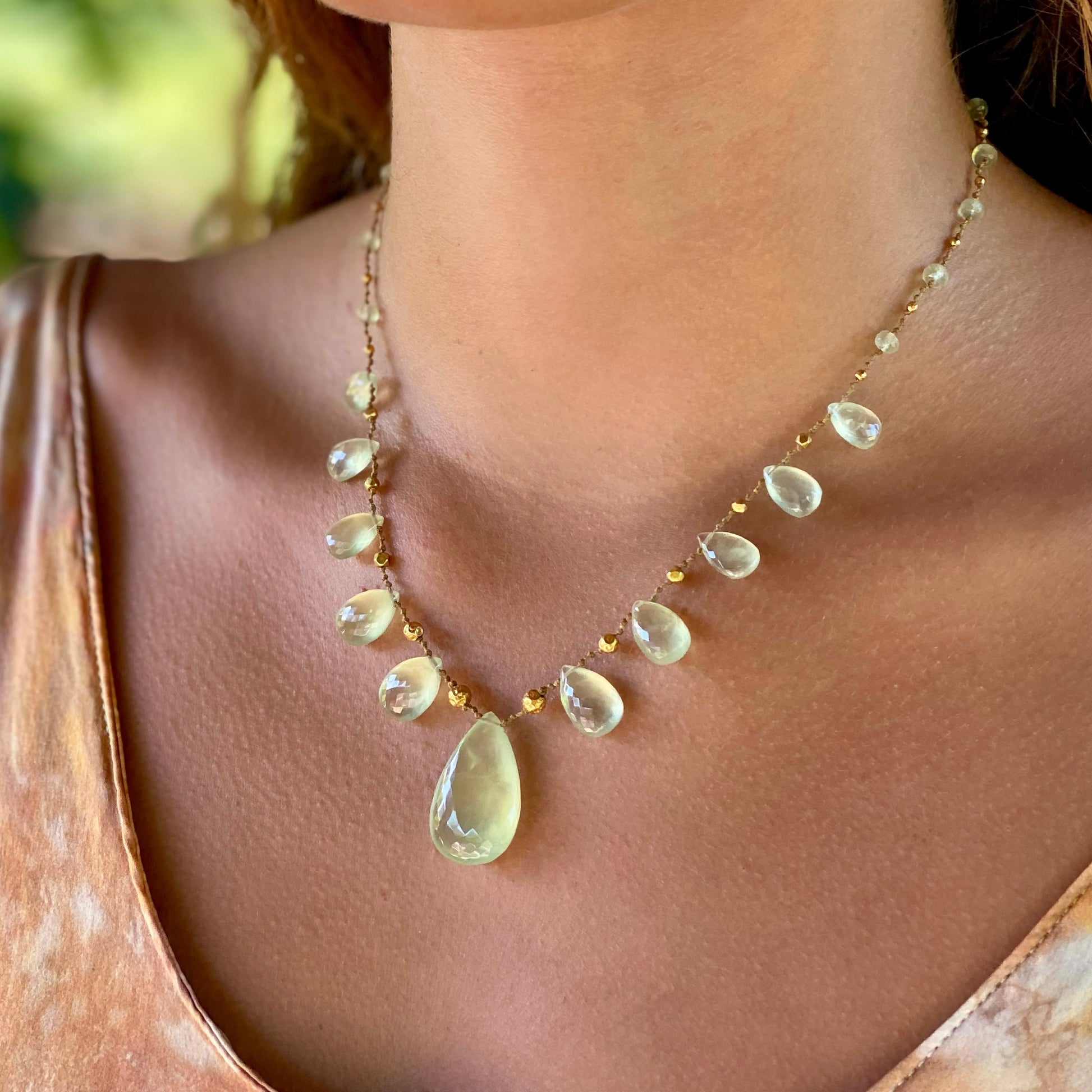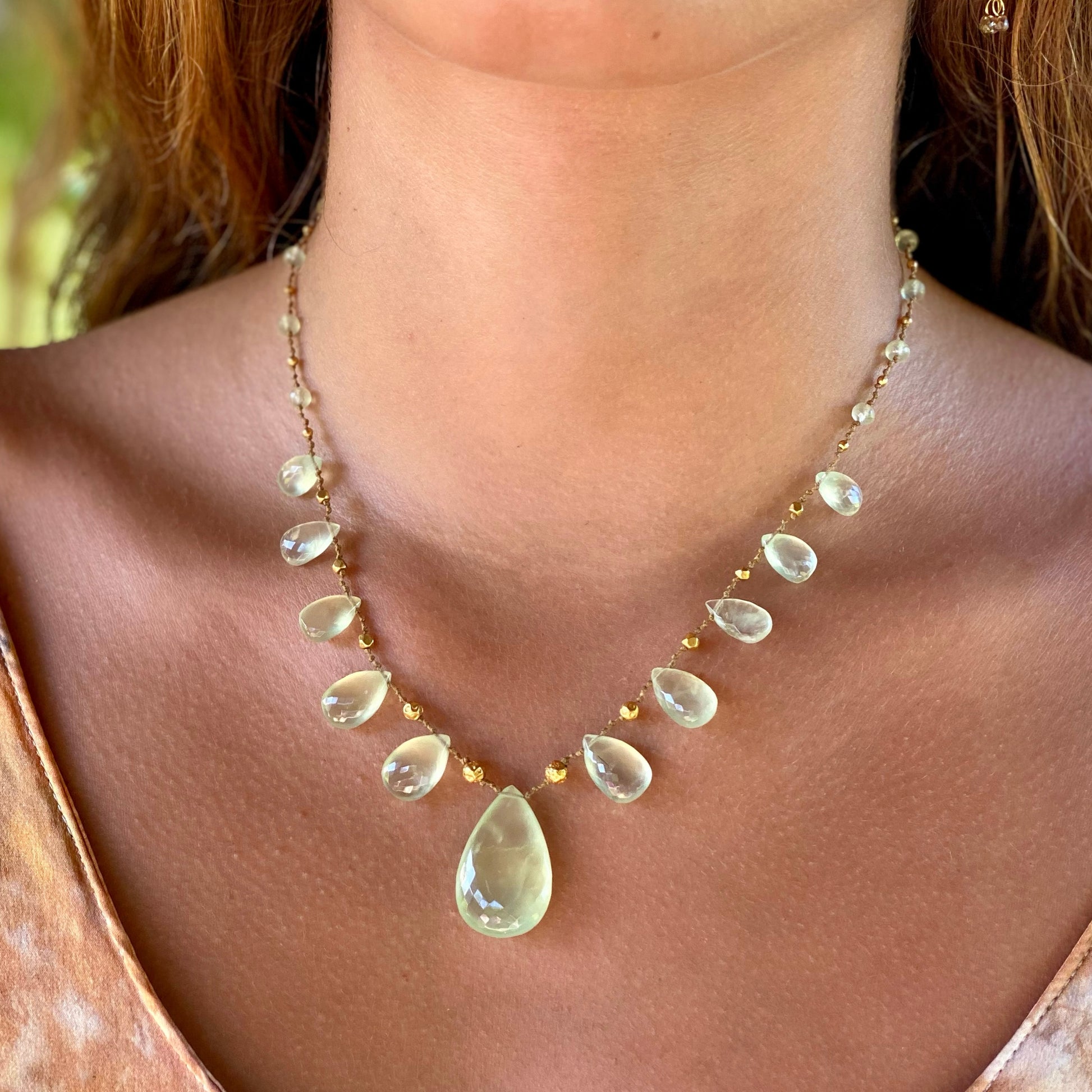 Dreamlike Prhenite is the stone to heal the healer, embodying the peaceful power of aligned heart and will. A beacon of unconditional love, a reminder of confidence, and a promise of prophecy, these glowing graduated gems are set between handmade solid 18k gold beads.