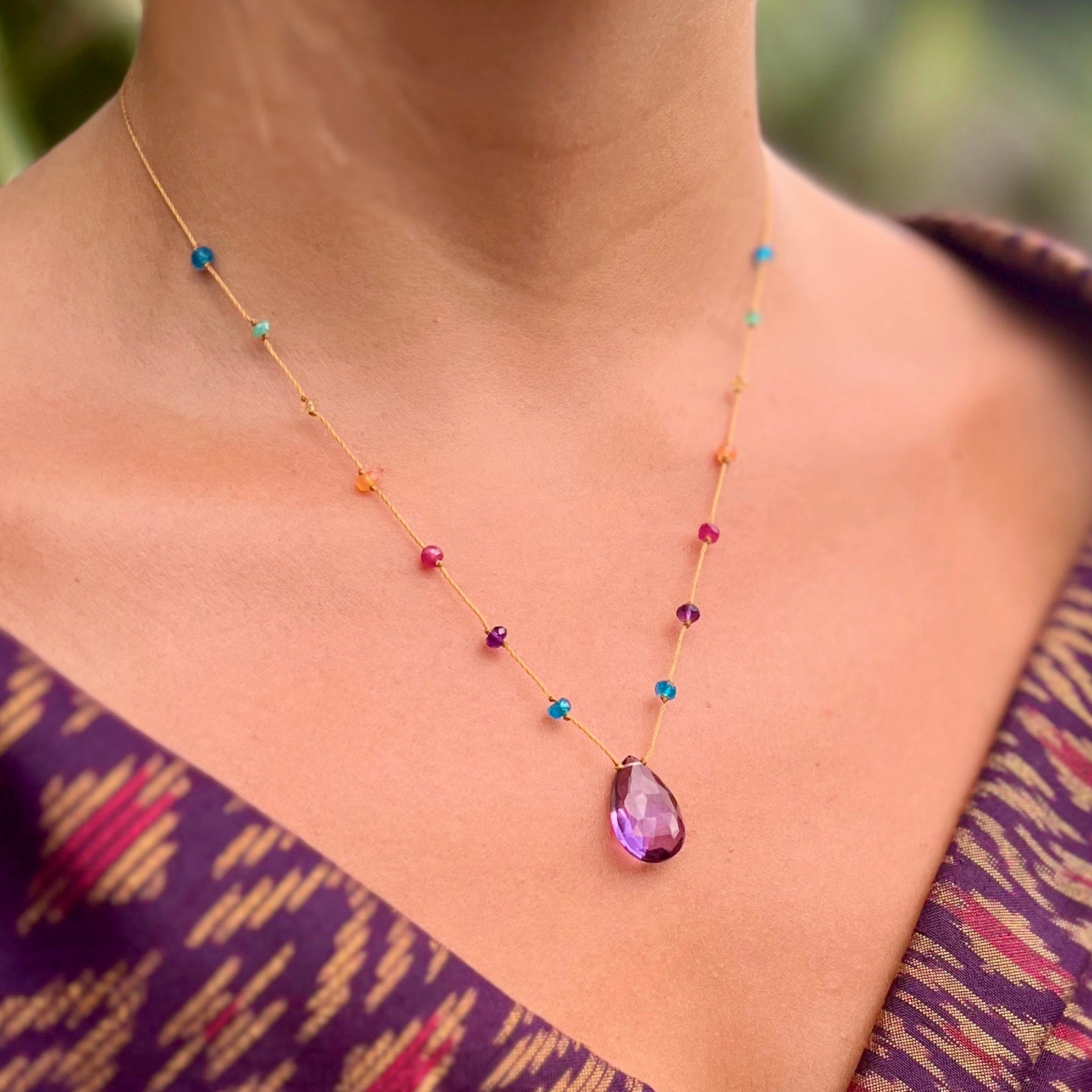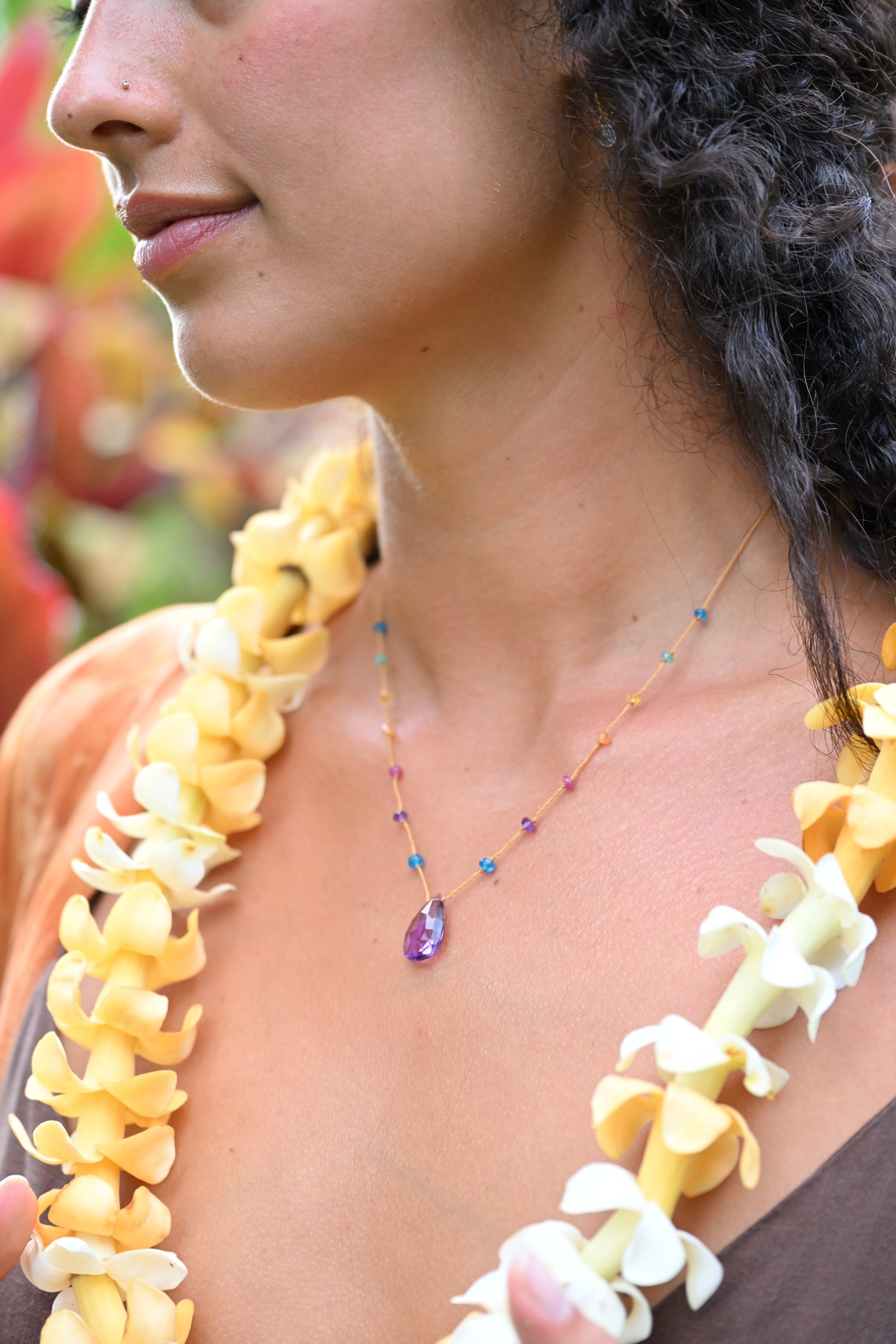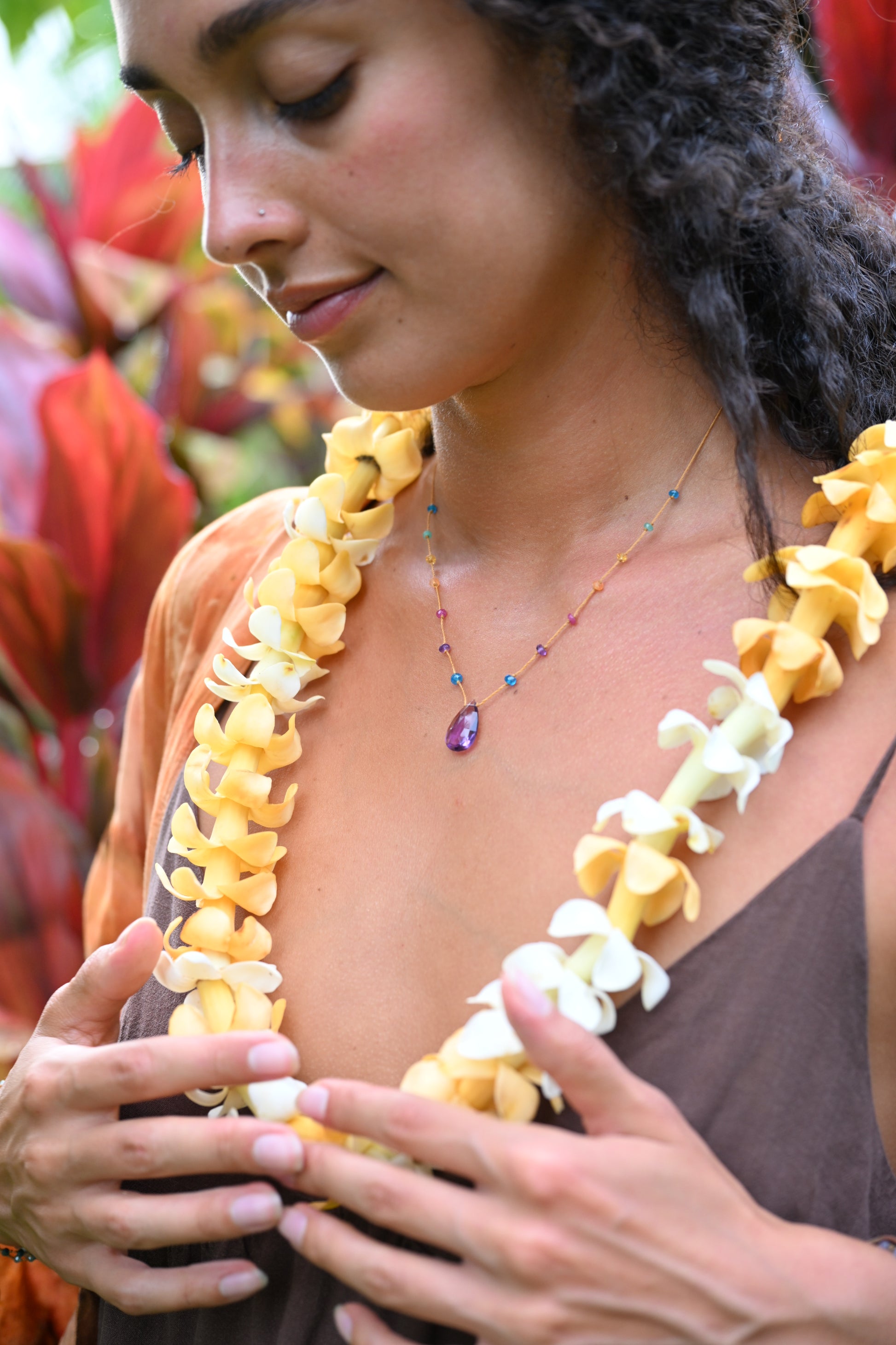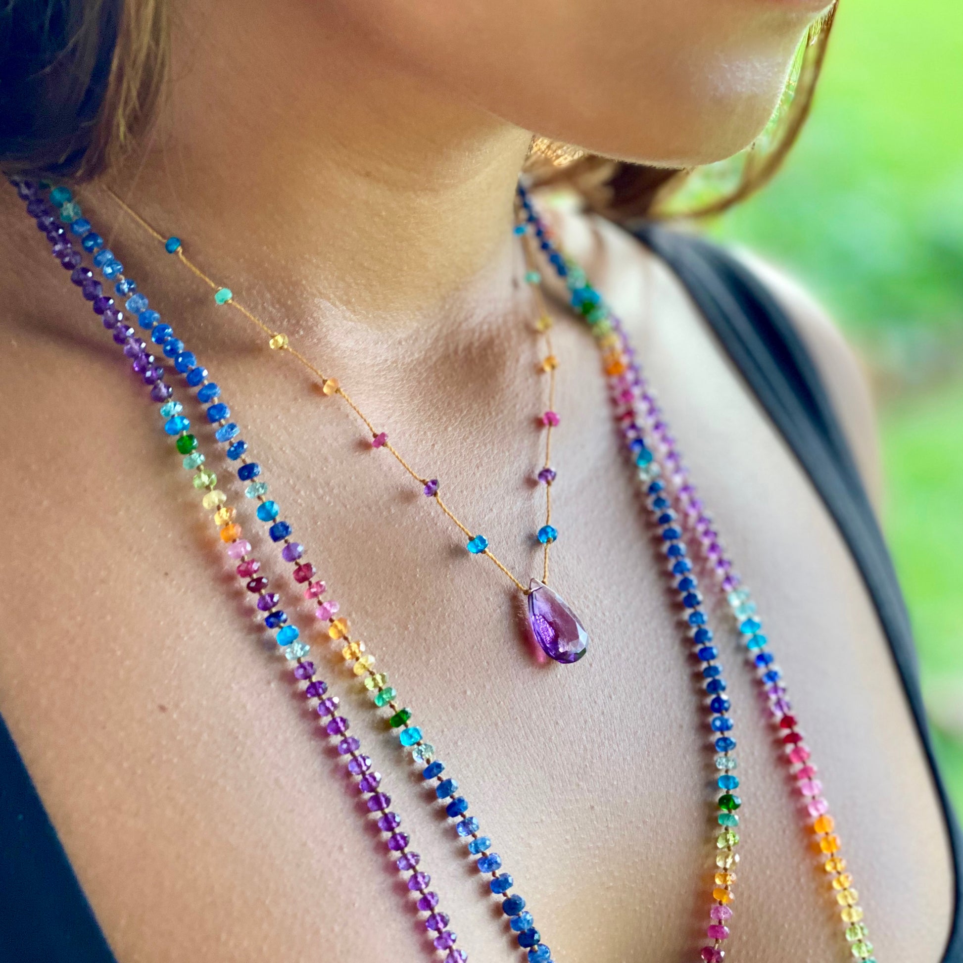 Perhaps the quintessential beginning of Rainbow Gems Kauai, our rainbow drops have been adorning people for over a decade. These delicate rainbow drops showcase the full light spectrum with carefully spaced individual gemstones, culminating in a featured crystalline drop. Just as rainbows herald new beginnings and luck these exquisite strands are the perfect place to begin your love affair with Amalia’s artwork. Many find that once they put on their rainbow drop they never take it off again, such is the nature of love. These strands are perfect for the minimalist at heart and make a striking impression stacked in a series with our other collections.