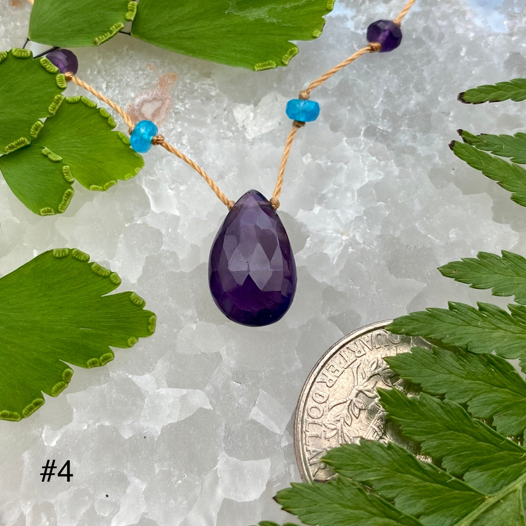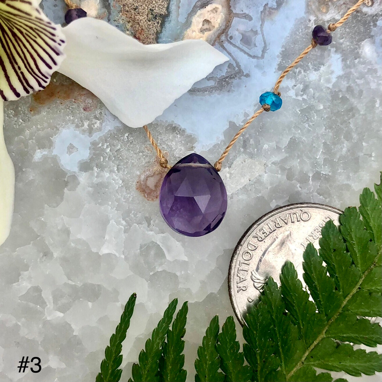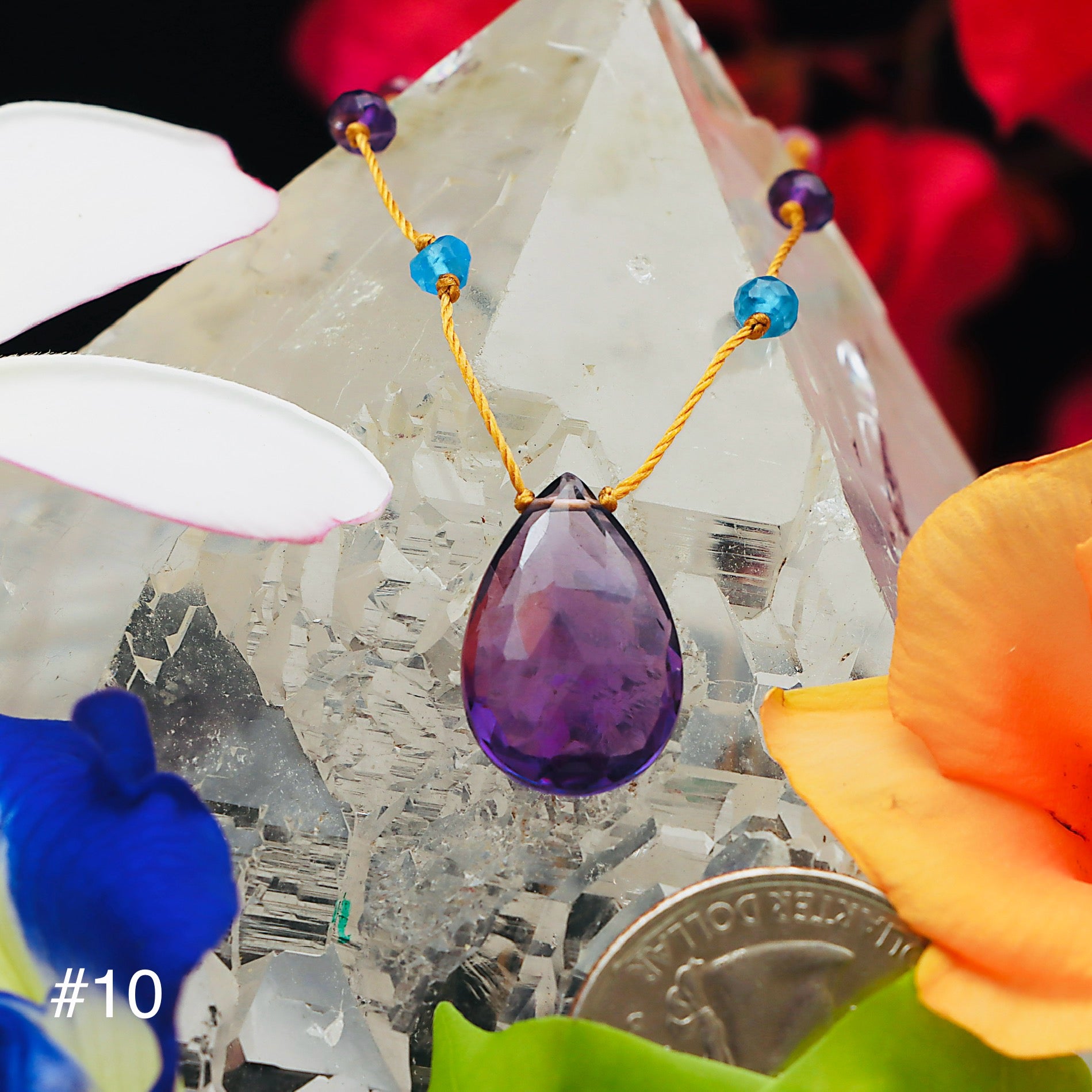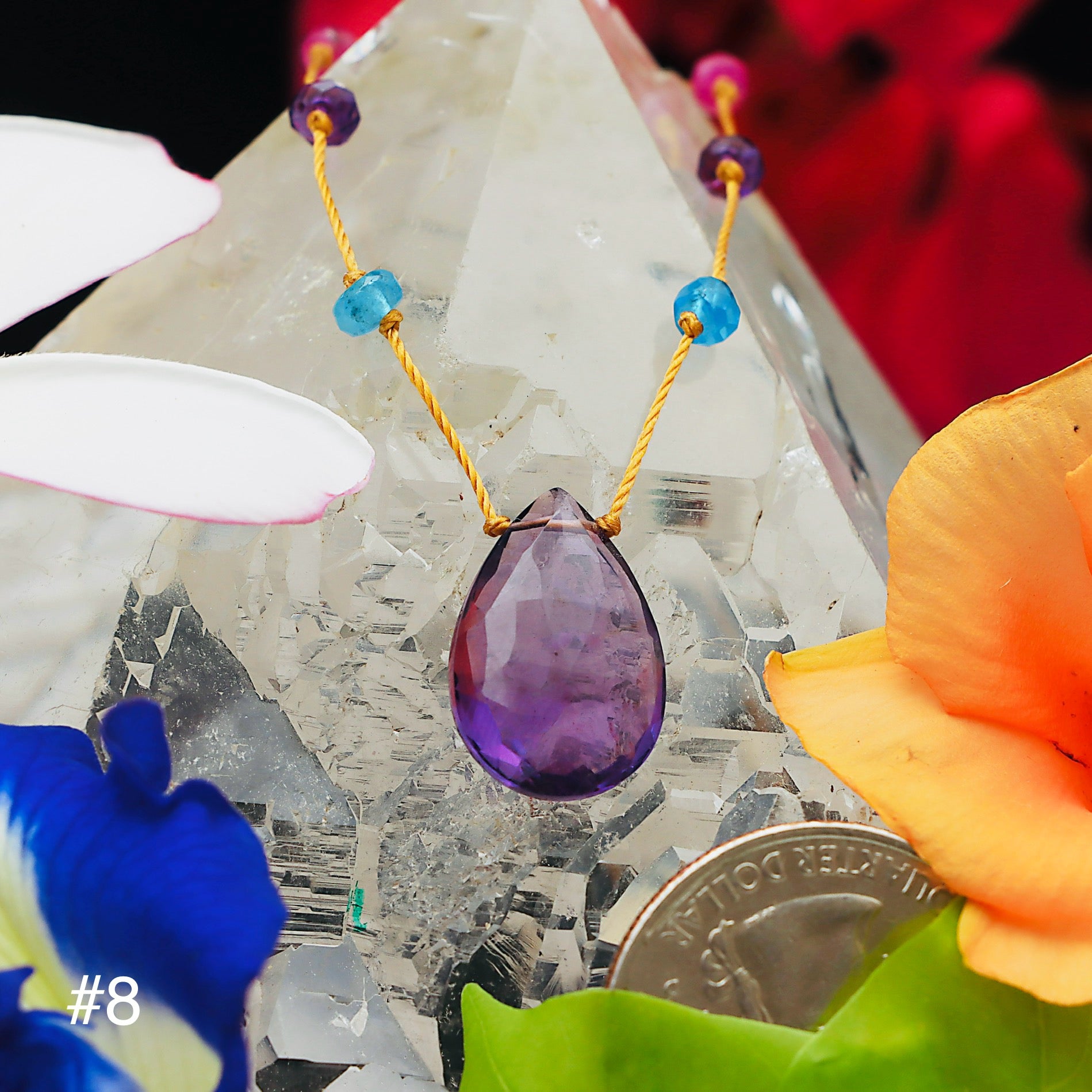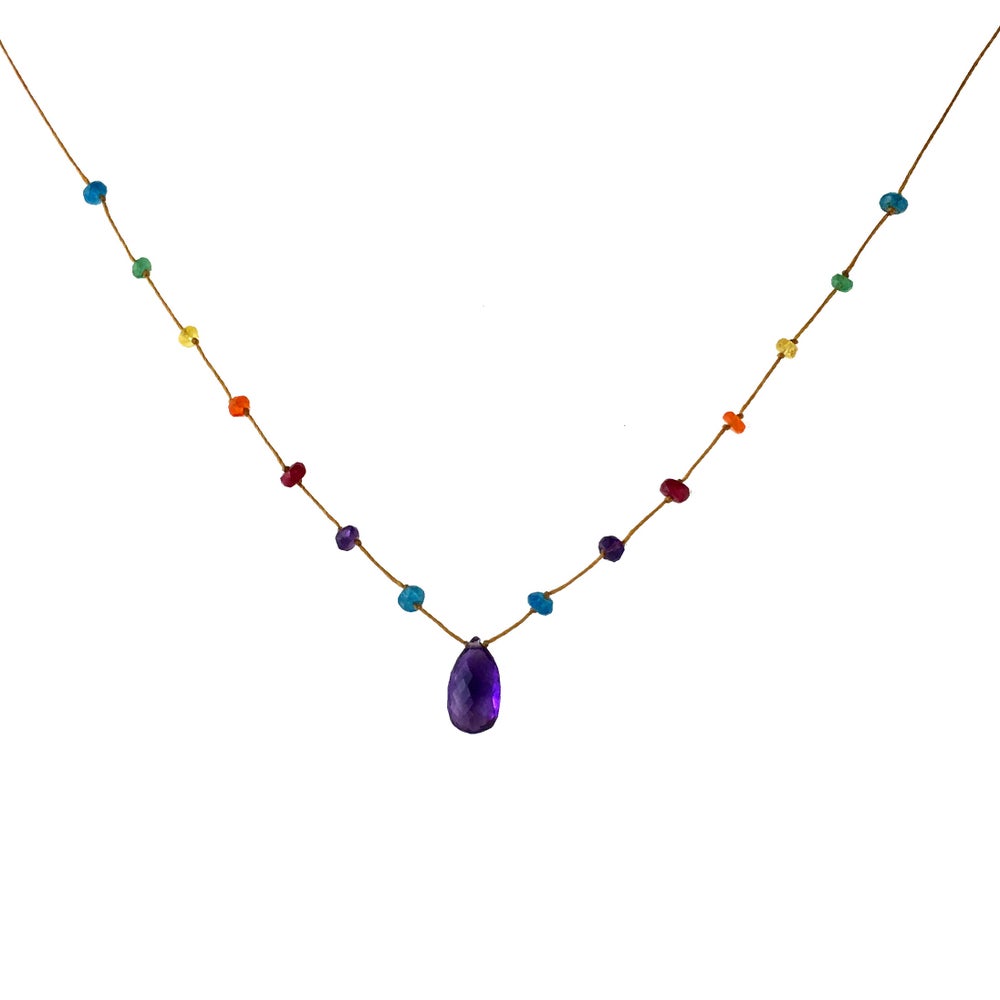 Perhaps the quintessential beginning of Rainbow Gems Kauai, our rainbow drops have been adorning people for over a decade. These delicate rainbow drops showcase the full light spectrum with carefully spaced individual gemstones, culminating in a featured crystalline drop. Just as rainbows herald new beginnings and luck these exquisite strands are the perfect place to begin your love affair with Amalia’s artwork. Many find that once they put on their rainbow drop they never take it off again, such is the nature of love. These strands are perfect for the minimalist at heart and make a striking impression stacked in a series with our other collections.
