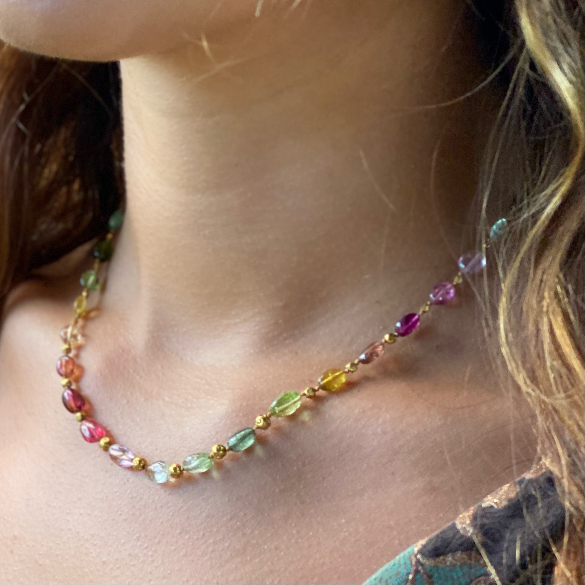 Rare, Rainbow-shaded Tourmalines in smooth organically shaped ovals, paired with handmade solid 18k gold beads. A wonderful stone to connect root and heart, this full spectrum Tourmaline is fondly thought of as the “happy maker.”