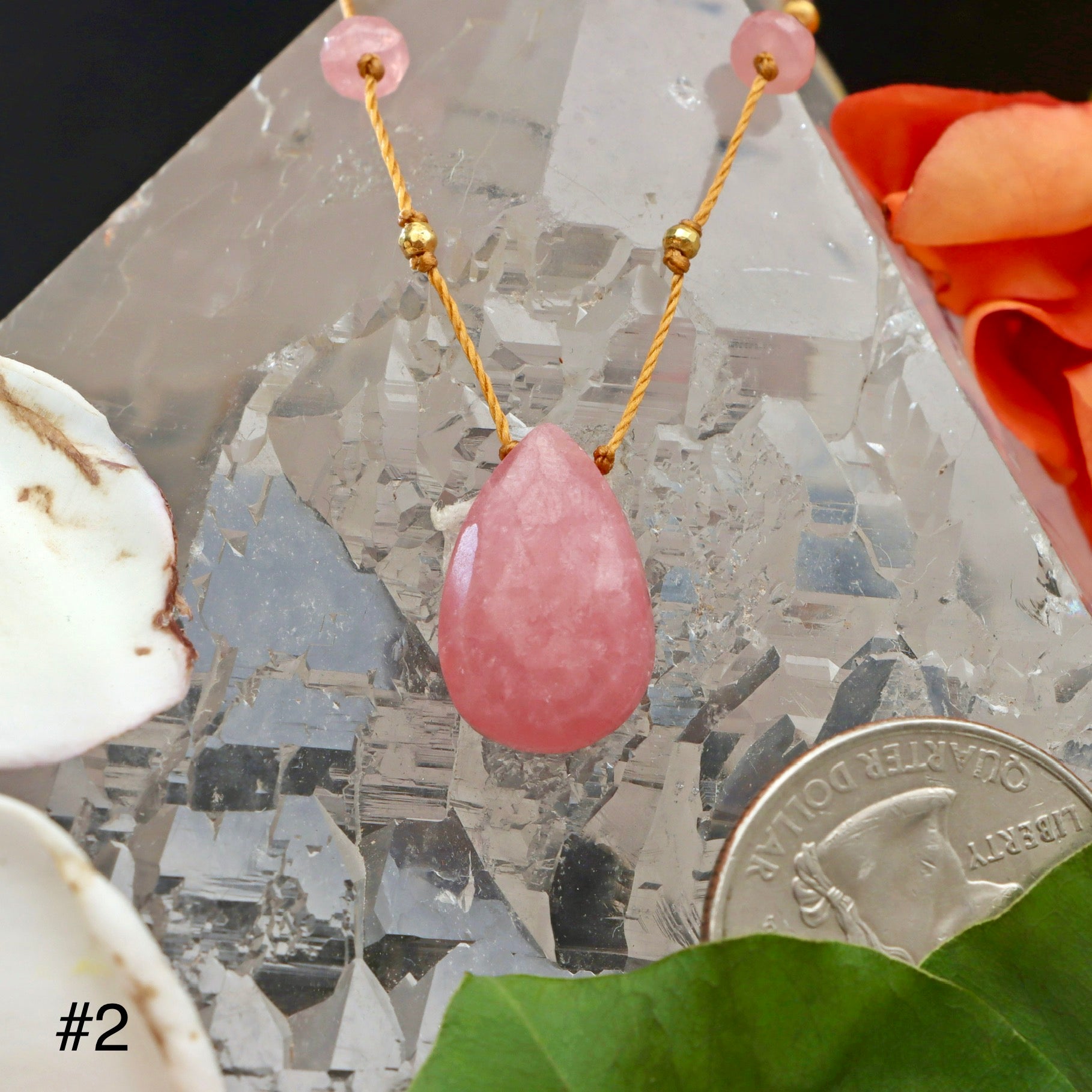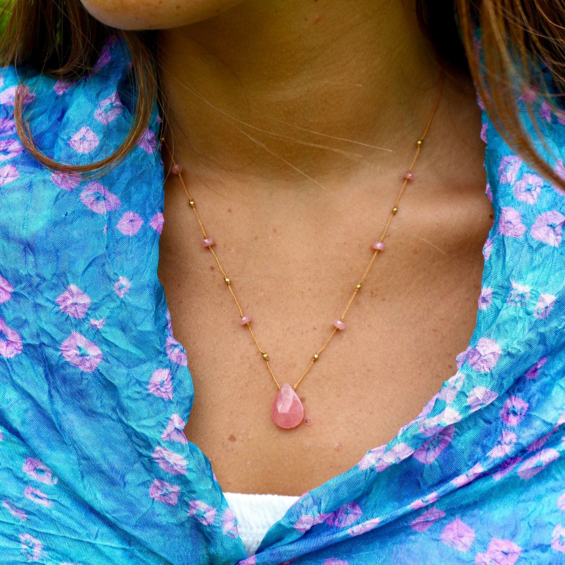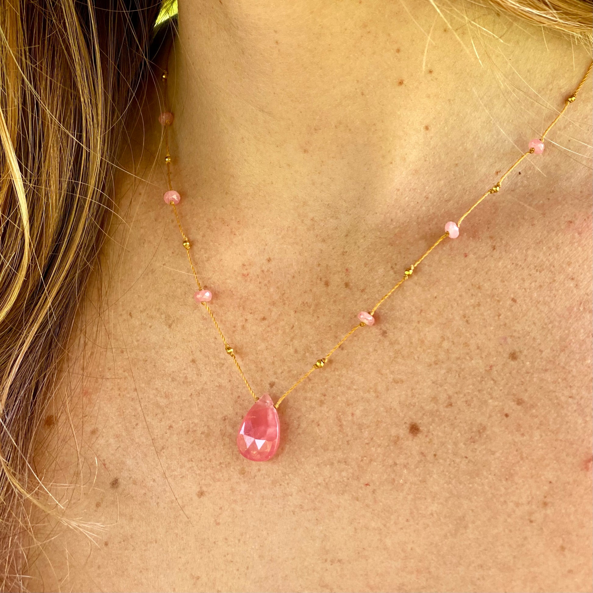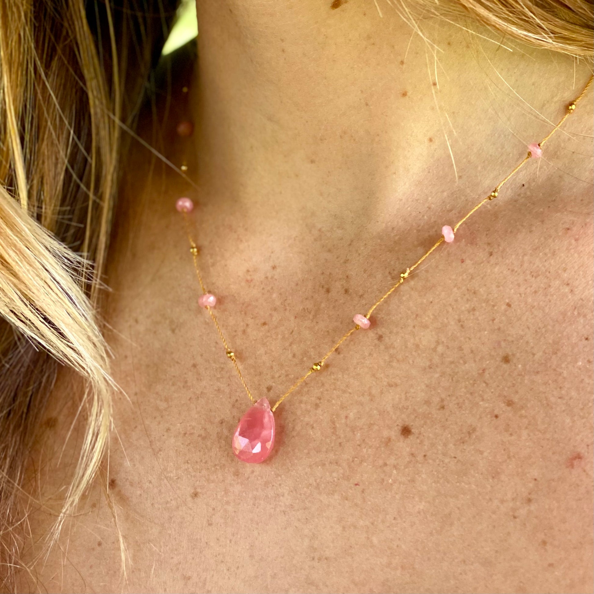 A vibrant Rhodochrosite drop with handmade solid 18k gold beads. A piece for the noble at heart.