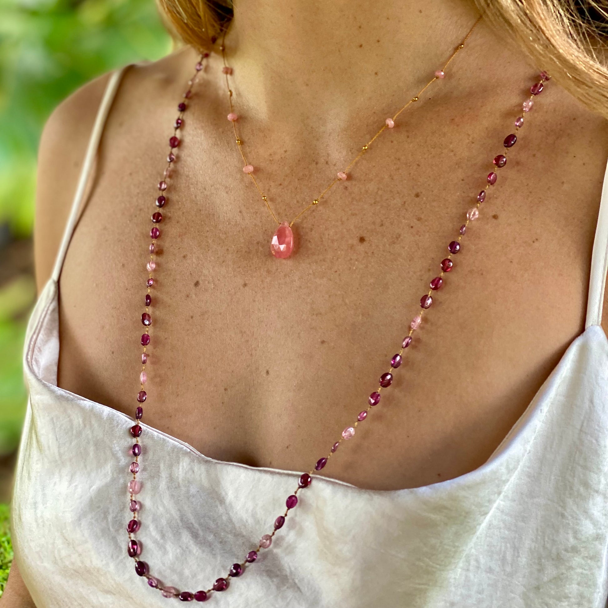 United in a shining continuum, each strand features a faceted gemstone drop and includes a repeating sequence of coordinating gemstone beads alternated with hand built gold beads.