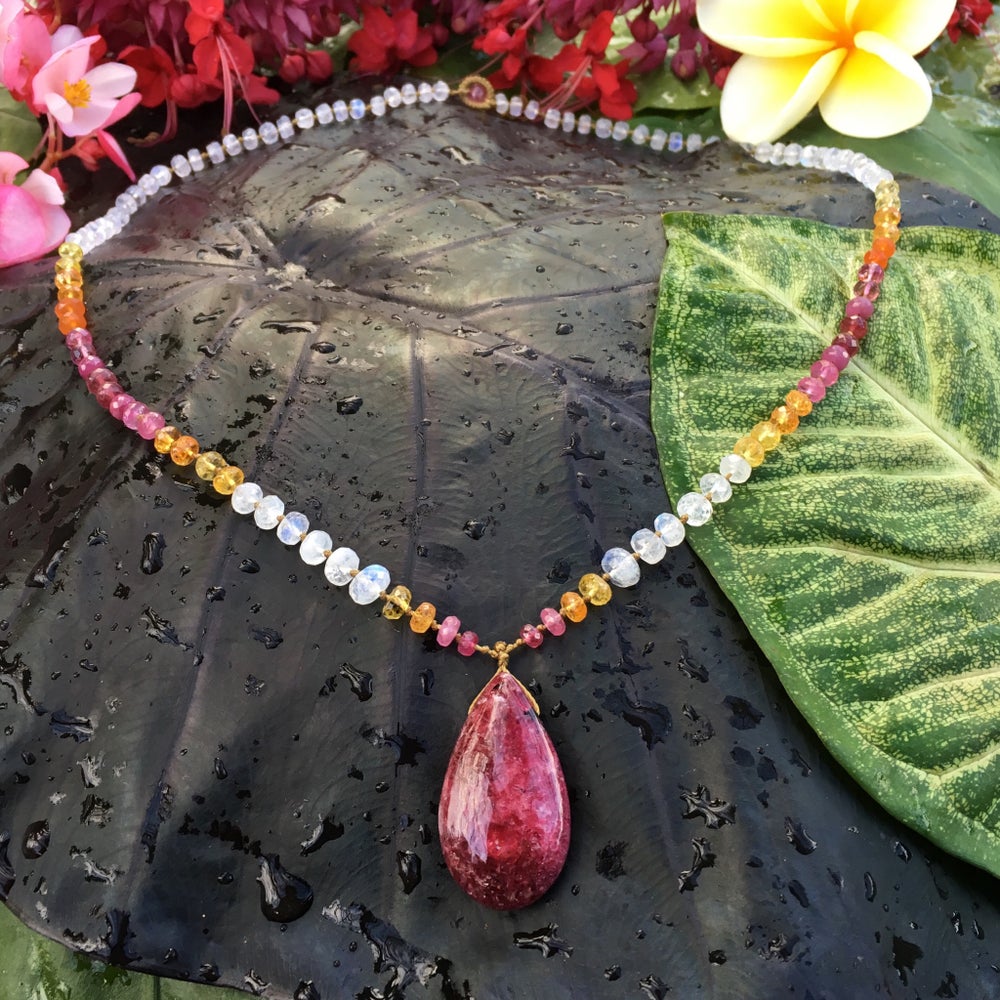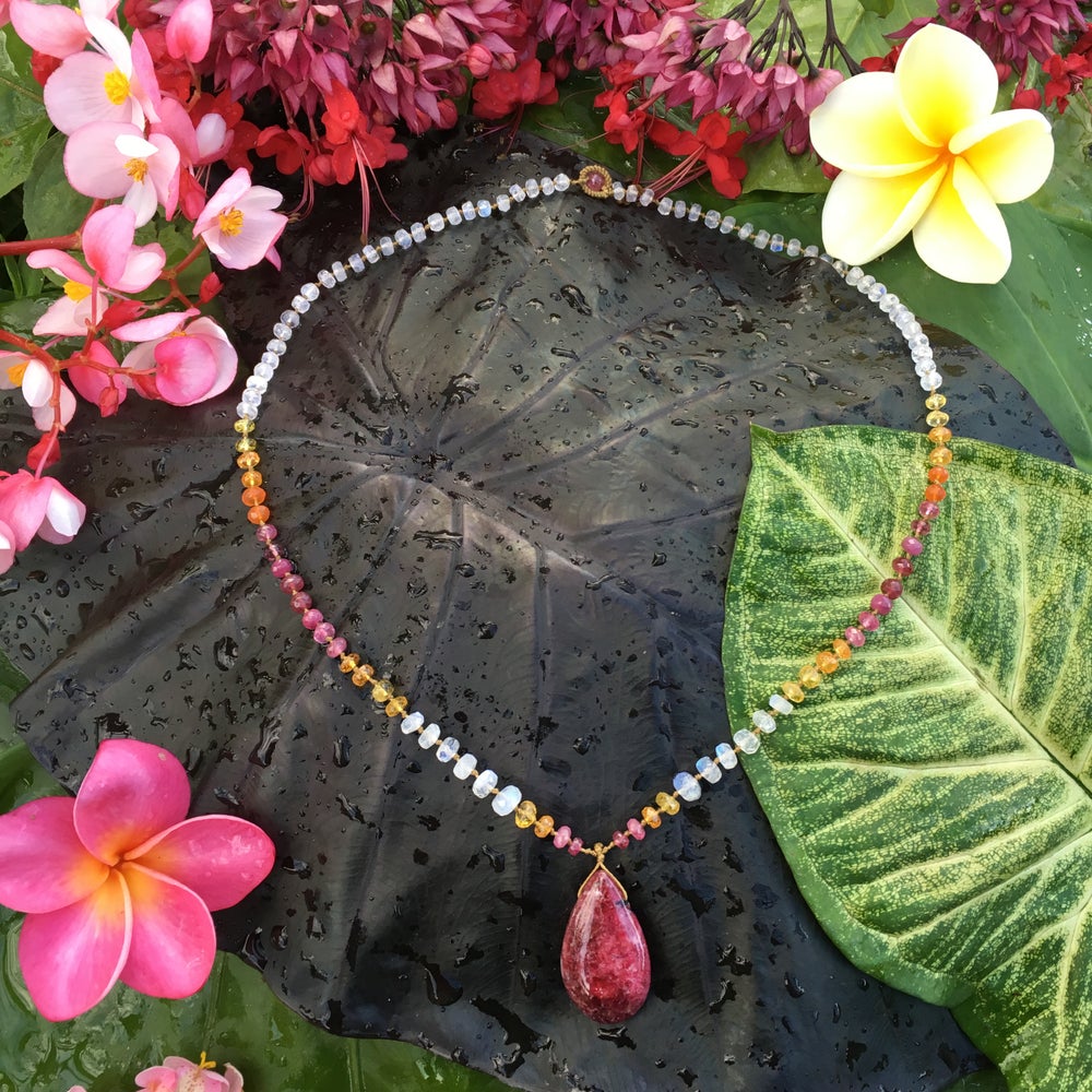 Deep Red Argentinian Rhodochrosite meets with Moonstone and a warm sunset sequence.