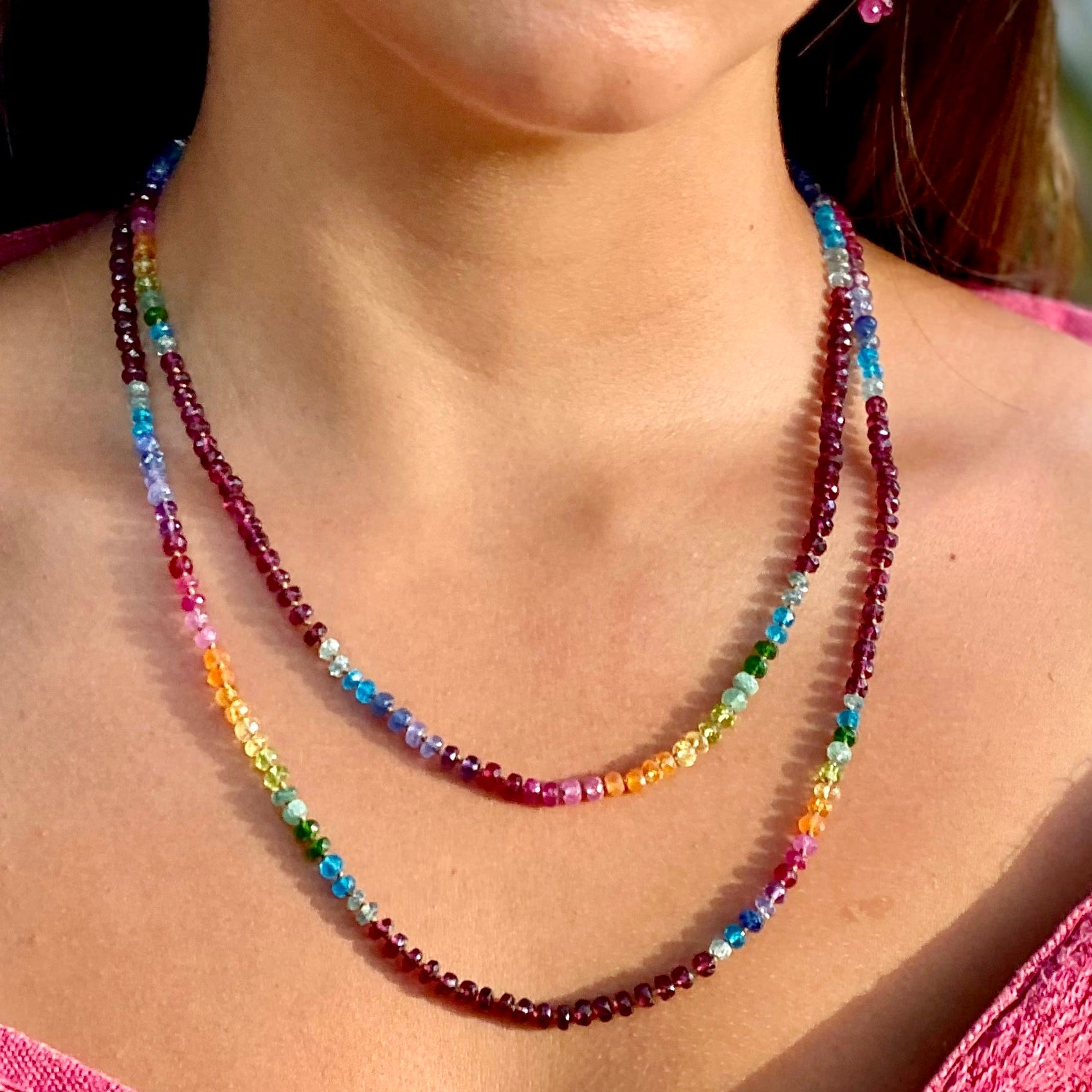 You can layer Rainbow Leis with with both our Alohi or Rainbow Drop collections. They are also a lovely compliment to our Rainbow Mana pieces and can be worn to bring forth dynamic color contrast or chosen mineral emphasis.