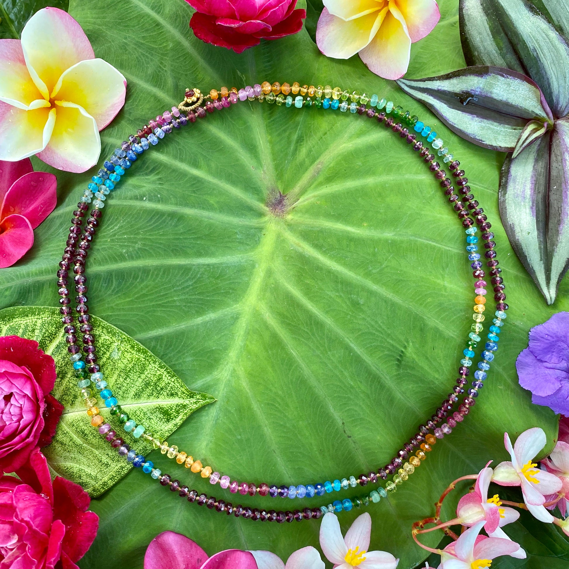 Leis are a quintessential expression of aloha and a stringed embrace of love, friendship, welcome, appreciation and honor. Rainbows are symbols of hope, new beginnings, equality for all beings, abundance, luck, and the bridge between human and spiritual worlds. Wearing this crystalline light spectrum is a bouquet of blessing, a welcoming of our embodied expression, and a powerful activation for new phases of life.