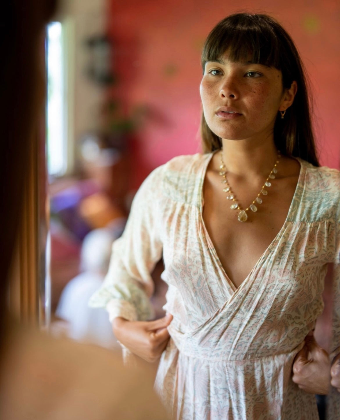 This luminous line provides a substantive dose of crystalline nutrition, pulsing with elevated earth frequencies from the body of nature herself. Designed for the noble-hearted, these regal priestess pieces are comprised of multi-dimensional drop gemstones, highlighted by handmade 18 karat gold beads. This is bling at its most blessed.