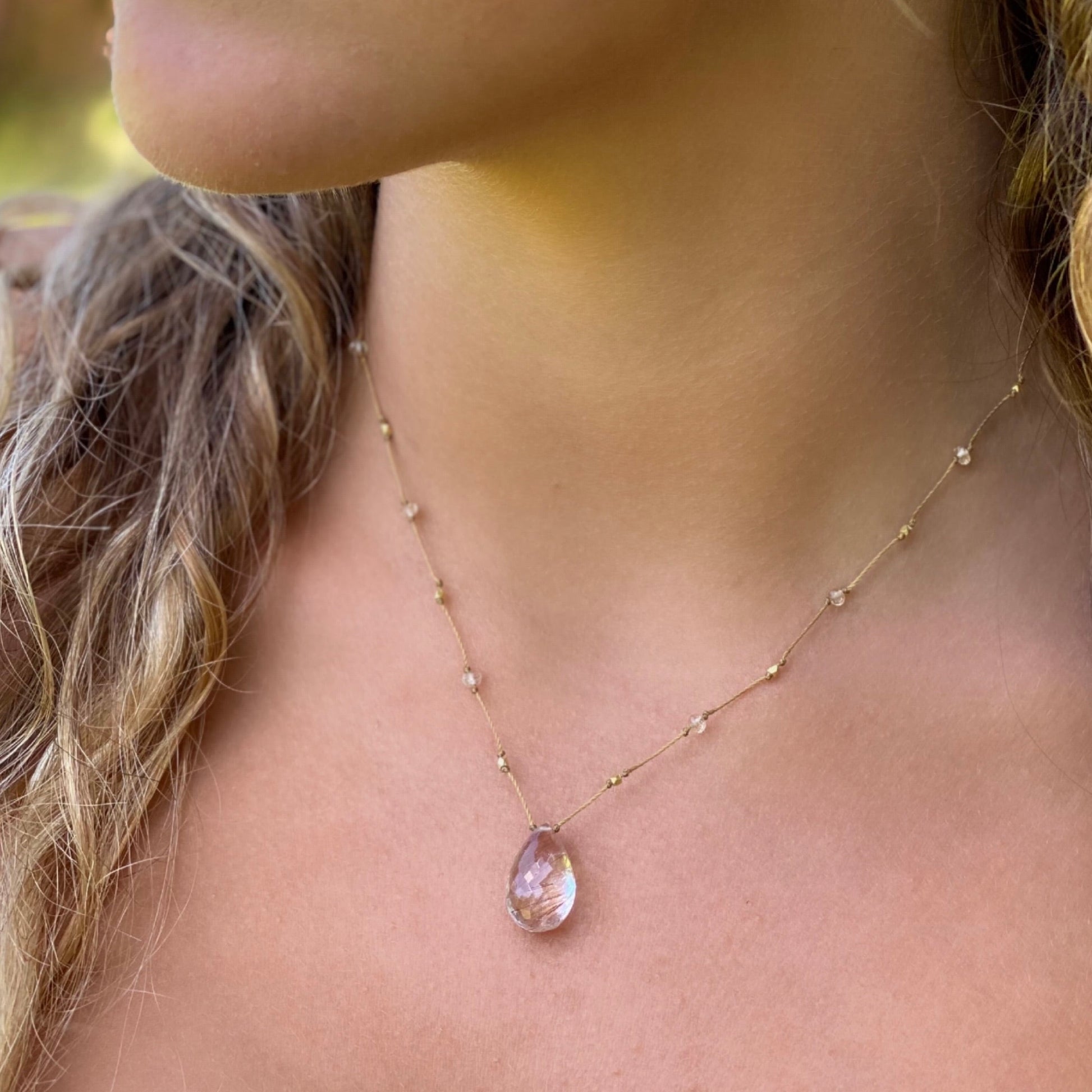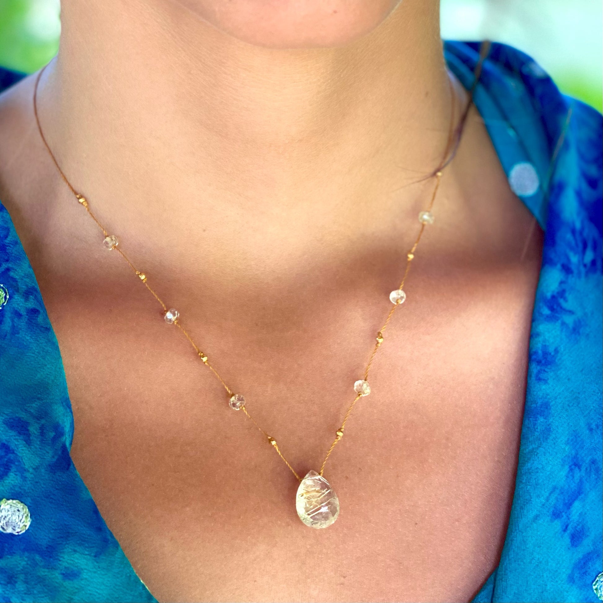 An illuminating Rutilated Quartz drop with handmade solid 18k gold beads. Reminiscent of crystallized nectar, this stunning Golden Quartz droplet grounds light energy through the cellular body assisting with attunement and acceleration.