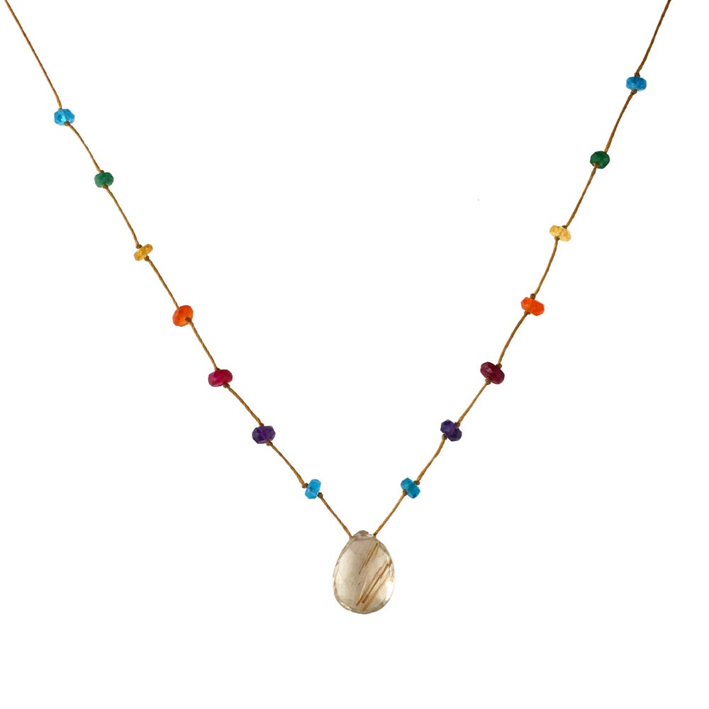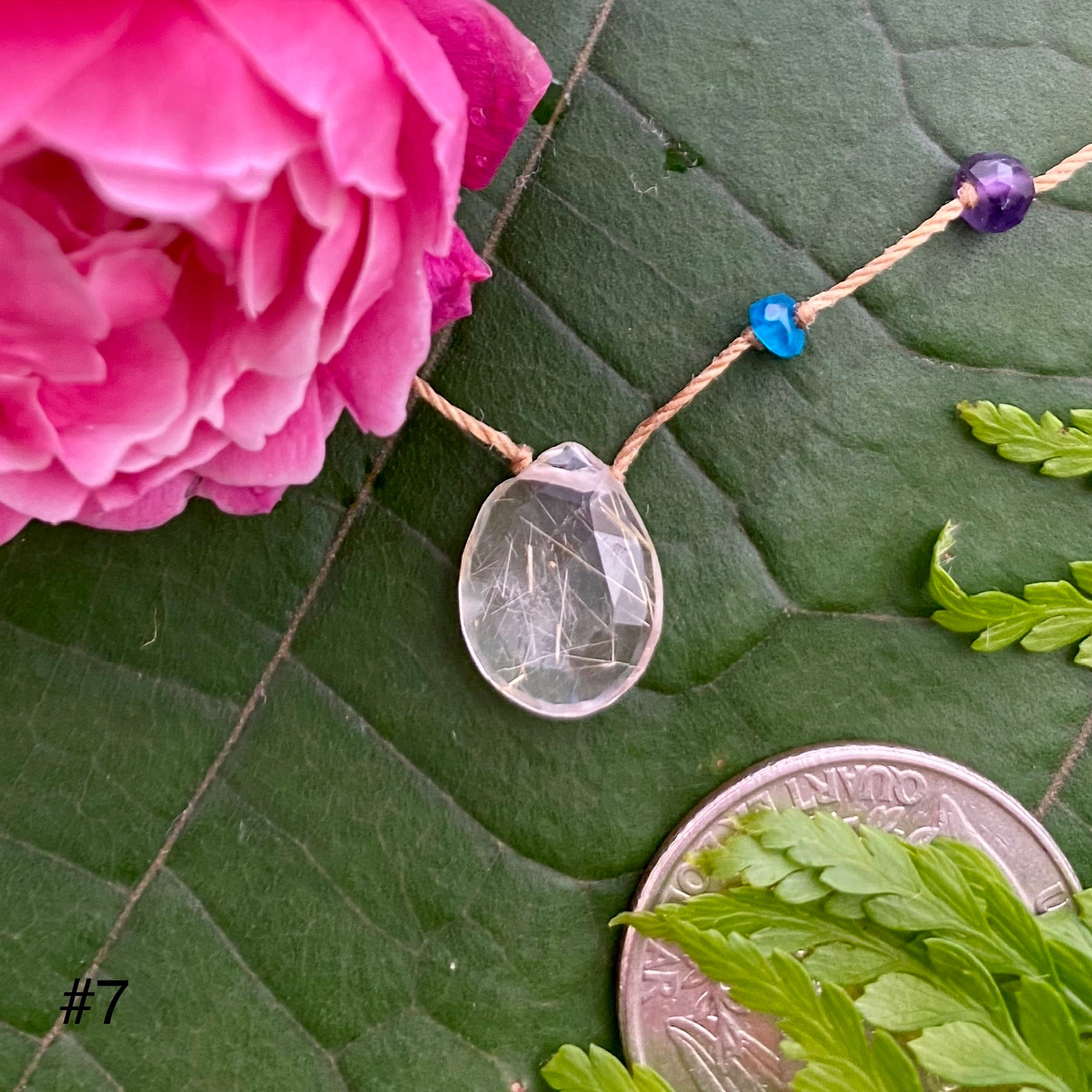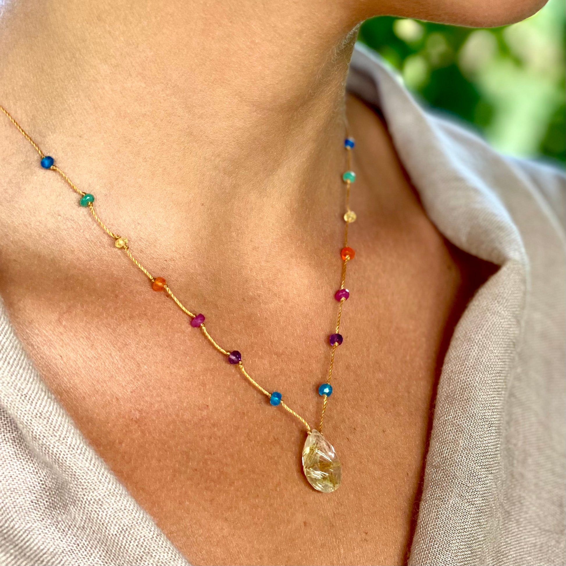Perhaps the quintessential beginning of Rainbow Gems Kauai, our rainbow drops have been adorning people for over a decade. These delicate rainbow drops showcase the full light spectrum with carefully spaced individual gemstones, culminating in a featured crystalline drop. Just as rainbows herald new beginnings and luck these exquisite strands are the perfect place to begin your love affair with Amalia’s artwork. Many find that once they put on their rainbow drop they never take it off again, such is the nature of love. These strands are perfect for the minimalist at heart and make a striking impression stacked in a series with our other collections.