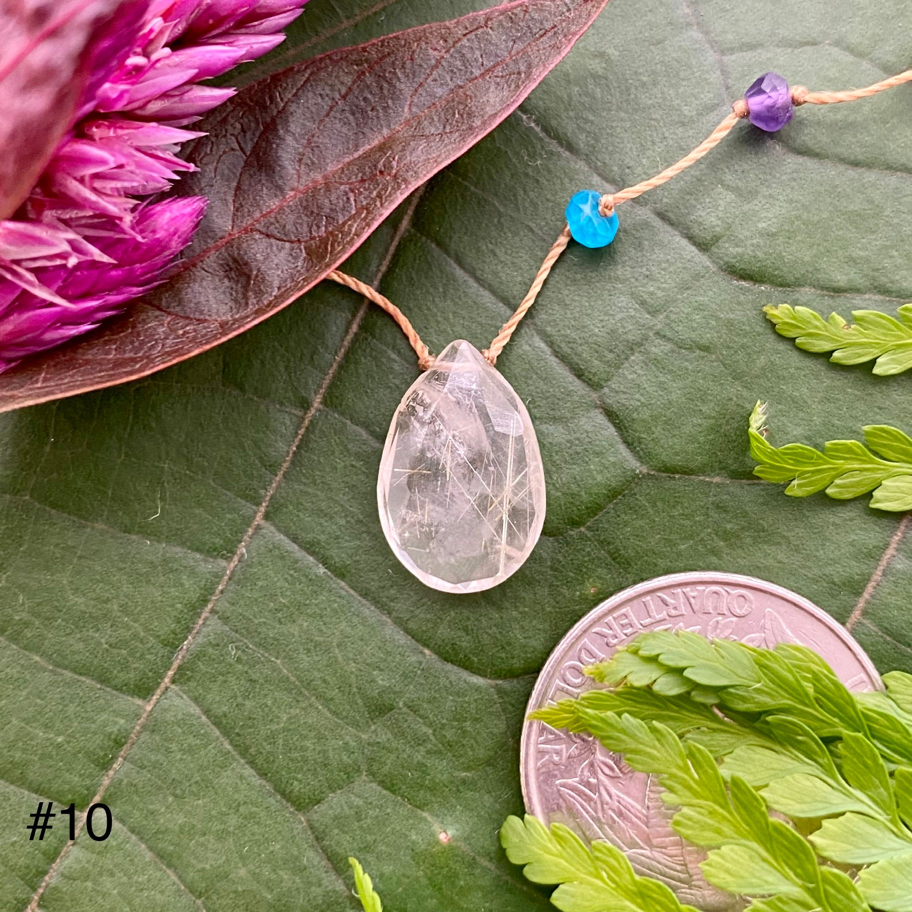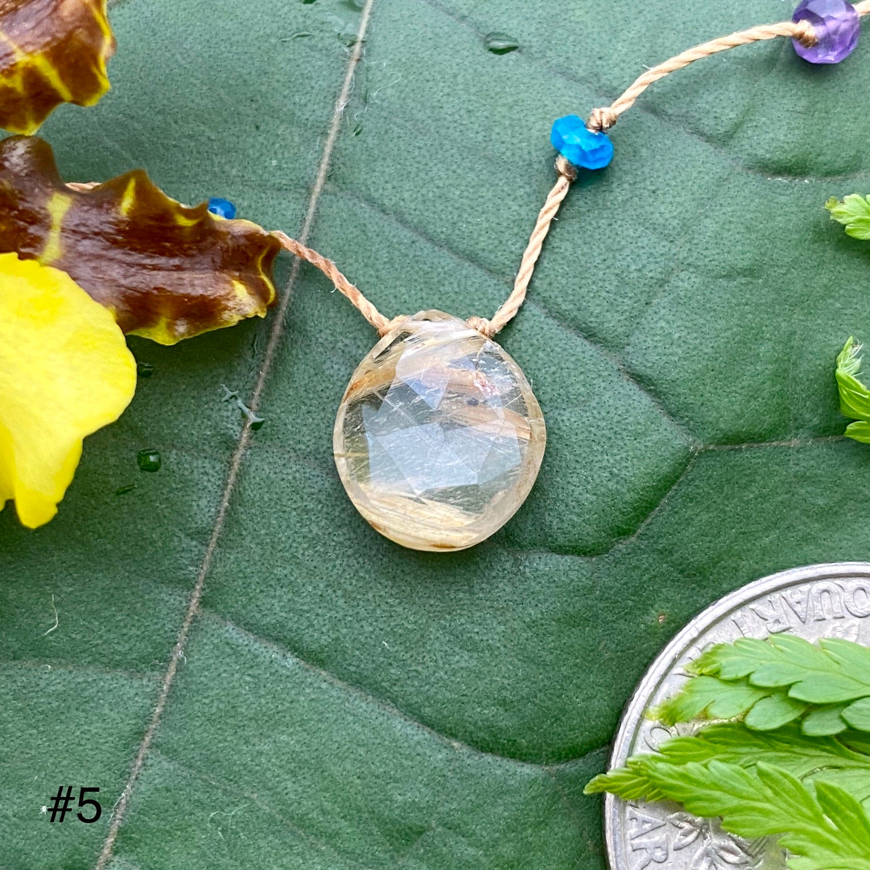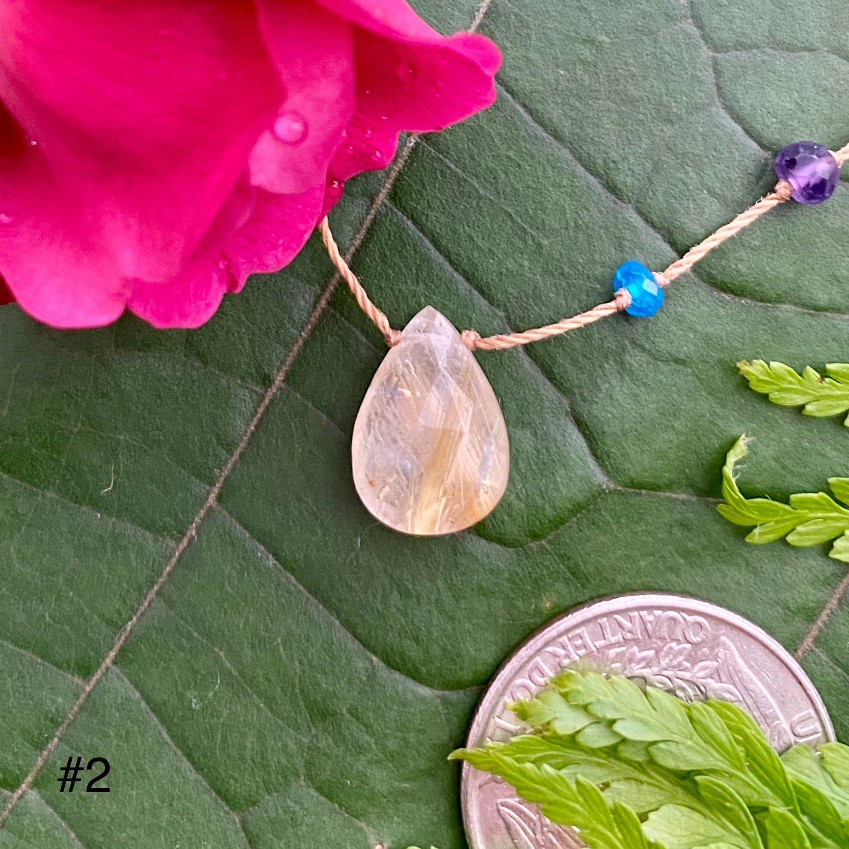 An illuminating Rutilated Quartz. Reminiscent of crystallized nectar, these Golden Quartz droplets ground light energy through the cellular body assisting with attunement and acceleration.