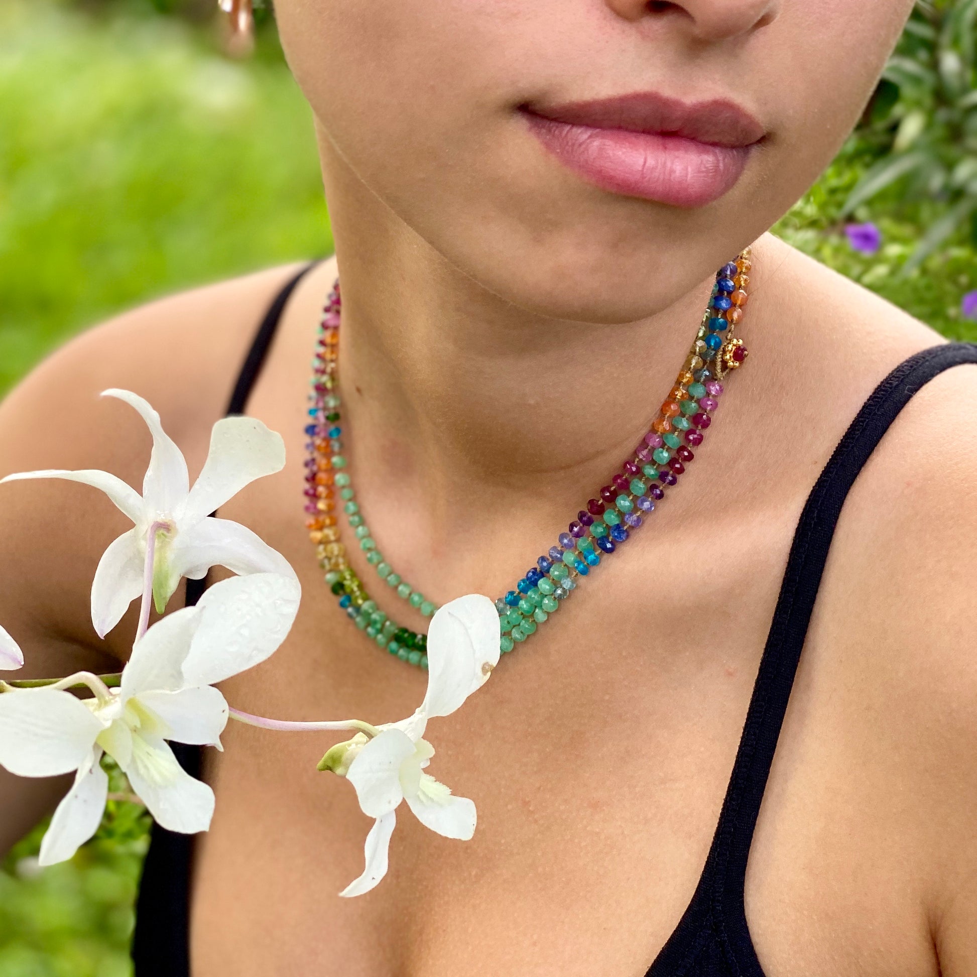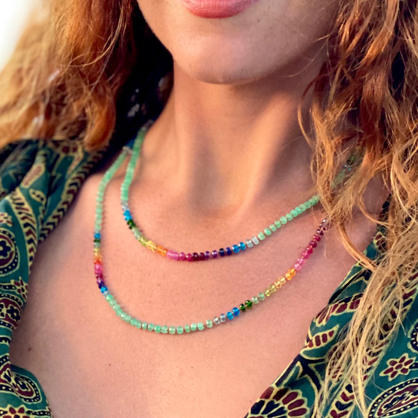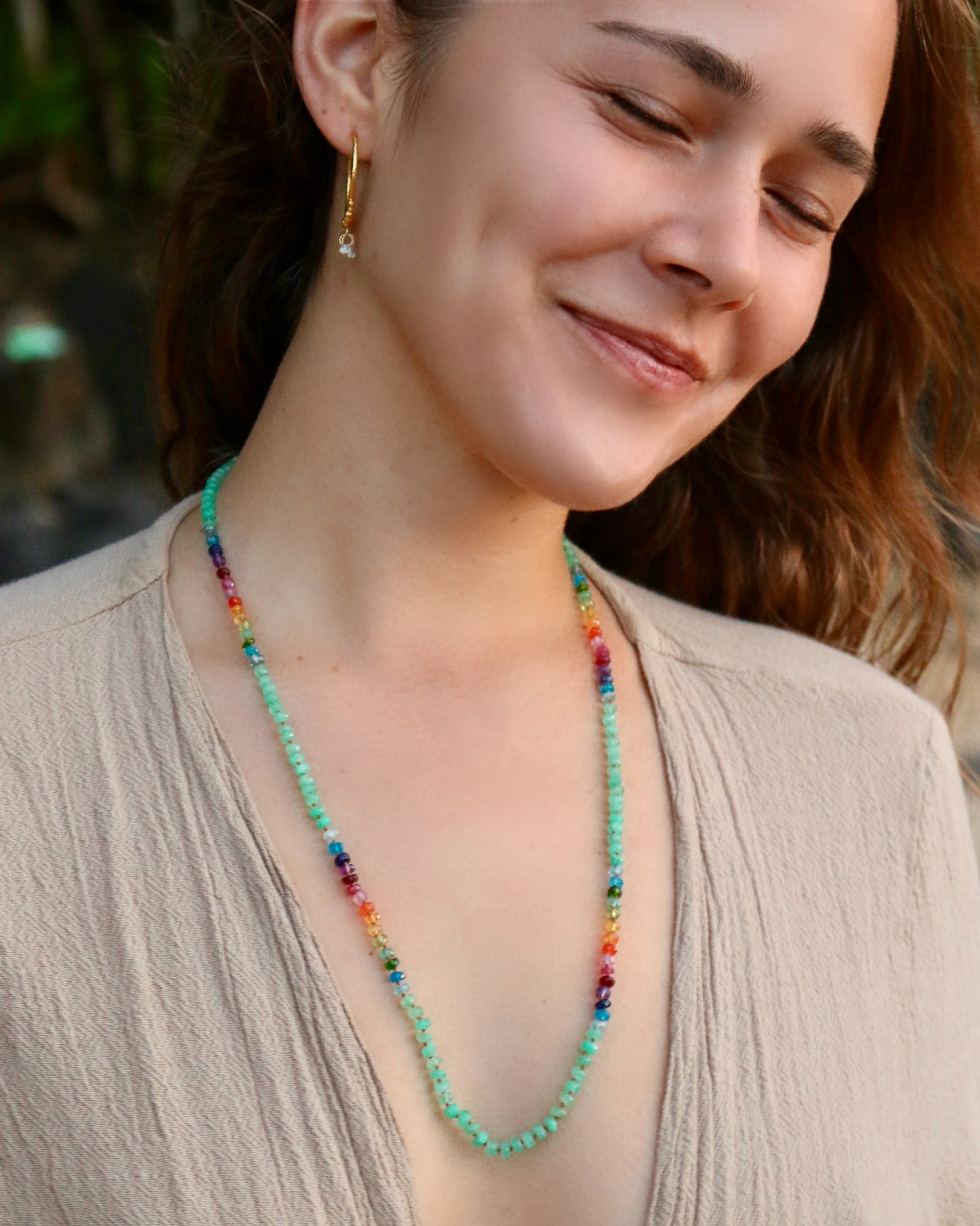 You can layer Rainbow Leis with with both our Alohi or Rainbow Drop collections. They are also a lovely compliment to our Rainbow Mana pieces and can be worn to bring forth dynamic color contrast or chosen mineral emphasis.